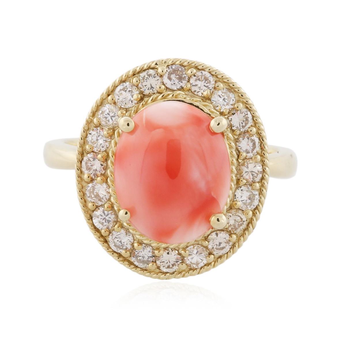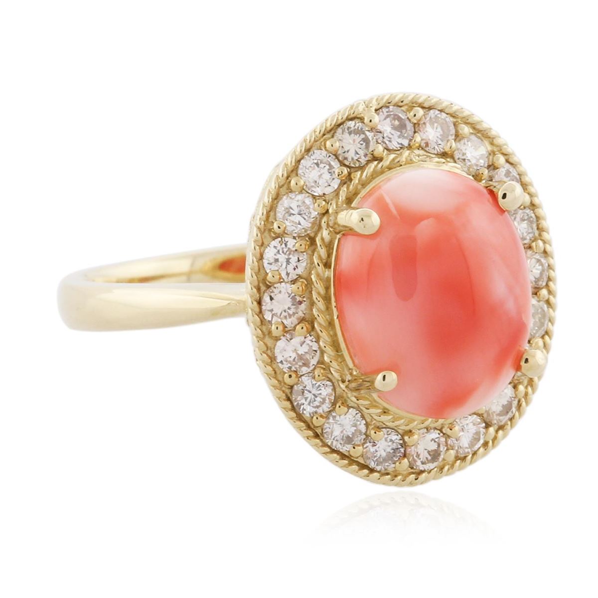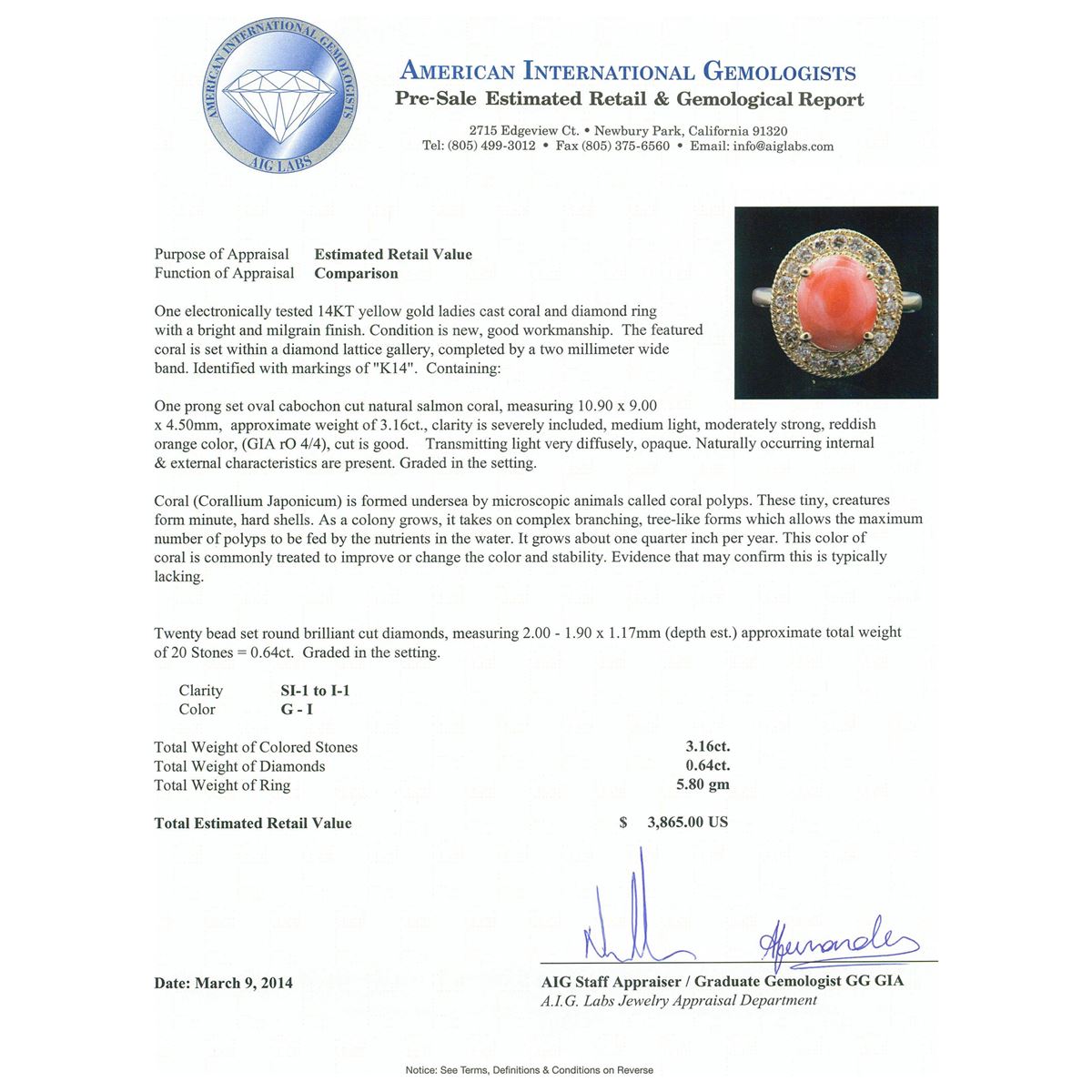 One electronically tested 14KT yellow gold ladies cast coral and diamond ring with a bright and milgrain finish. Condition is new, good workmanship. The featured coral is set within a diamond lattice gallery, completed by a two millimeter wide band. Identified with markings of "K14". Containing: One prong set oval cabochon cut natural salmon coral, measuring 10.90 x 9.00 x 4.50mm, approximate weight of 3.16ct., clarity is severely included, medium light, moderately strong, reddish orange color, (GIA rO 4/4), cut is good. Transmitting light very diffusely, opaque. Naturally occurring internal & external characteristics are present. Graded in the setting. Coral (Corallium Japonicum) is formed undersea by microscopic animals called coral polyps. These tiny, creatures form minute, hard shells. As a colony grows, it takes on complex branching, tree-like forms which allows the maximum number of polyps to be fed by the nutrients in the water. It grows about one quarter inch per year. This color of coral is commonly treated to improve or change the color and stability. Evidence that may confirm this is typically lacking. Twenty bead set round brilliant cut diamonds, measuring 2.00 - 1.90 x 1.17mm (depth est.) approximate. Total Weight of 20 Stones = 0.64ct. Graded in the setting. Clarity: SI-1 to I-1. Color: G - I. Total Weight of Colored Stones 3.16ct. Total Weight of Diamonds 0.64ct. Total Weight of Ring 5.80 grams. AIG Appraised at $3,865.00.