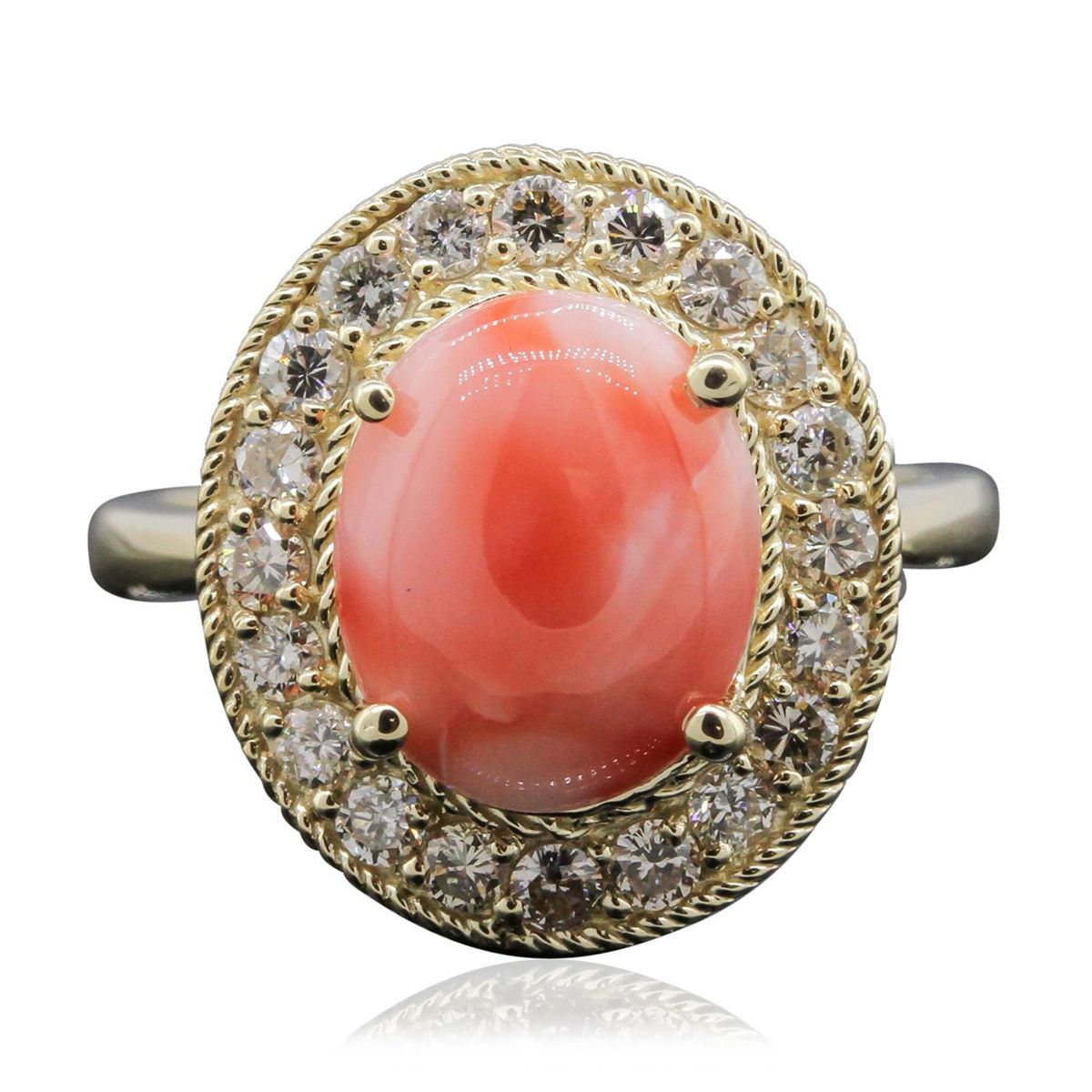 One electronically tested 14KT yellow gold ladies cast coral and diamond ring with a bright and milgrain finish. Condition is new, good workmanship. The featured coral is set within a diamond lattice gallery, completed by a two millimeter wide band. Identified with markings of "K14". Containing: One prong set oval cabochon cut natural salmon coral, measuring 10.90 x 9.00 x 4.50mm, approximate weight of 3.16ct., clarity is severely included, medium light, moderately strong, reddish orange color, (GIA rO 4/4), cut is good. Transmitting light very diffusely, opaque. Naturally occurring internal & external characteristics are present. Graded in the setting. Coral (Corallium Japonicum) is formed undersea by microscopic animals called coral polyps. These tiny, creatures form minute, hard shells. As a colony grows, it takes on complex branching, tree-like forms which allows the maximum number of polyps to be fed by the nutrients in the water. It grows about one quarter inch per year. This color of coral is commonly treated to improve or change the color and stability. Evidence that may confirm this is typically lacking. Twenty bead set round brilliant cut diamonds, measuring 2.00 - 1.90 x 1.17mm (depth est.) approximate. Total Weight of 20 Stones = 0.64ct. Graded in the setting. Clarity: SI-1 to I-1. Color: G - I. Total Weight of Colored Stones 3.16ct. Total Weight of Diamonds 0.64ct. Total Weight of Ring 5.80 grams. AIG Appraised at $3,865.00.