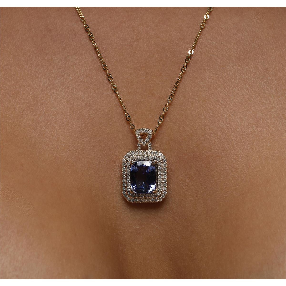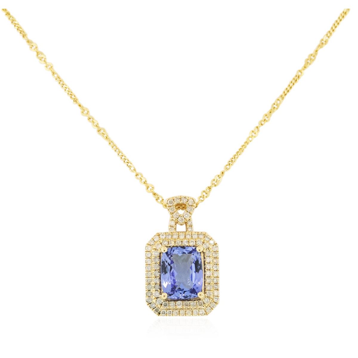 One electronically tested 14KT yellow gold ladies cast & assembled tanzanite and diamond pendant with chain. The pendant features a tanzanite set within two tiered diamond bezels, completed by a diamond set bail. The pendant is supported by an eighteen inch length 14KT yellow gold designer style chain, terminating in a spring ring clasp. Bright polish finish. Trademark is Orianne. Identified with markings of "14K". Condition is new, good workmanship. Containing: One prong set rectangular cushion brilliant cut natural tanzanite, measuring 10.10 x 8.00 x 4.70mm, 6% bulge factor, approximate weight of 3.17ct., clarity is eye clean, type I, medium dark, very slightly grayish, violetish blue color, (GIA vB 6/3), cut is good. Transmitting light with no distortion, transparent. Graded in the setting. Tanzanite is a very rare gemstone that is only found in the country of Tanzania. Originally discovered in 1967. Tiffany & Company, named the stone Tanzanite. It is found in the Usumburu Mountains that border the Umba Valley of northern Tanzania. Tanzanite occurs in gray, brown, violet, blue, reddish-purple, & green. The gem is interesting because of its exceptional pleochroism. Rotated in different directions a tanzanite will exhibit multiple changes of color. Tanzanite has a low tolerance to ultrasonic cleaning, and should not be cleaned using this method. Eighty-Three prong set round brilliant cut diamonds, measuring 1.20 - 1.10 x 0.69mm (depth est.) approximate total weight of 83 Stones = 0.55ct. Graded in the setting. Clarity: I-1 to I-2. Color: G - I. Total Weight of Colored Stones 3.17ct. Total Weight of Diamonds 0.55ct. Total Weight of Pendant With Chain 5.44 grams. AIG Appraised at $10,505.00.