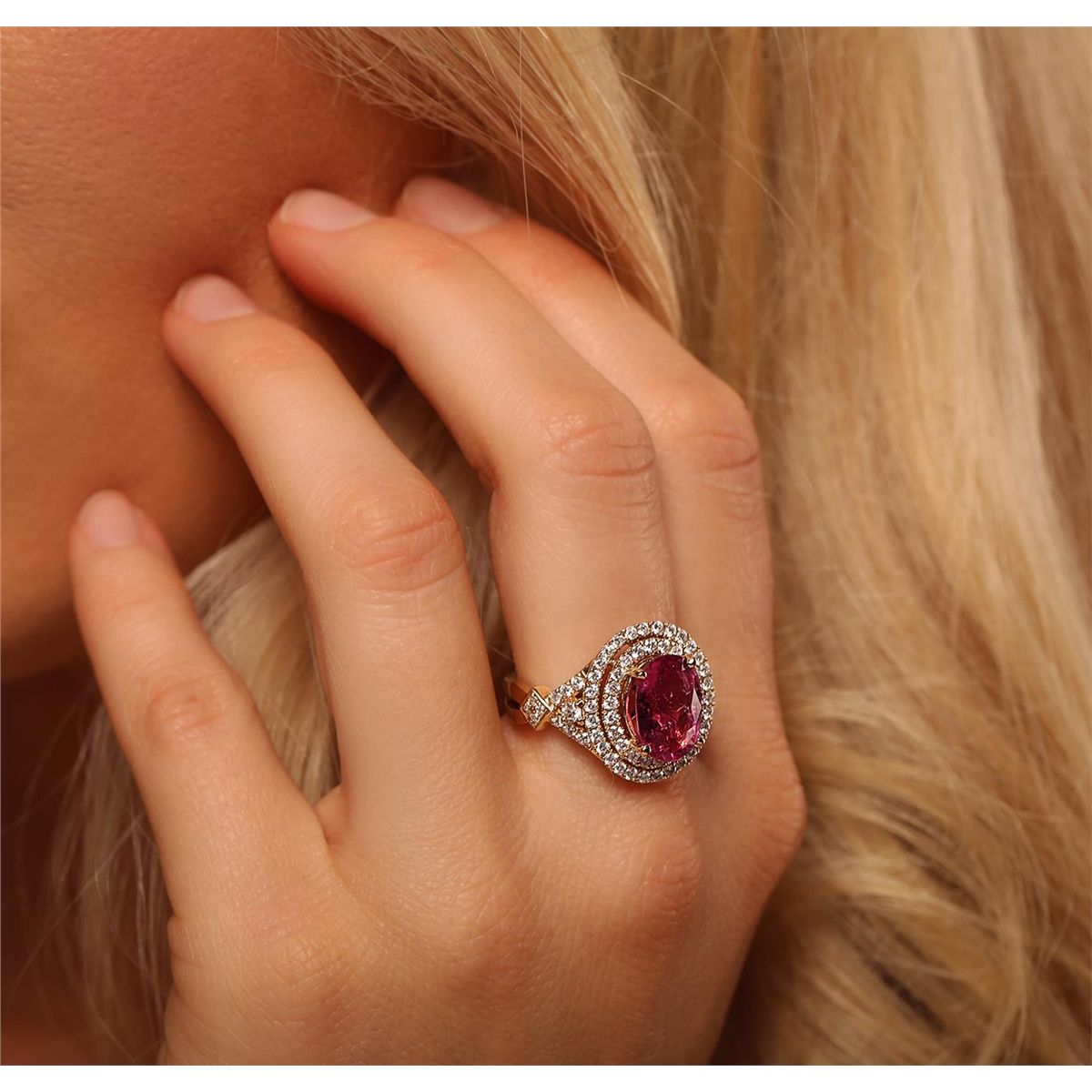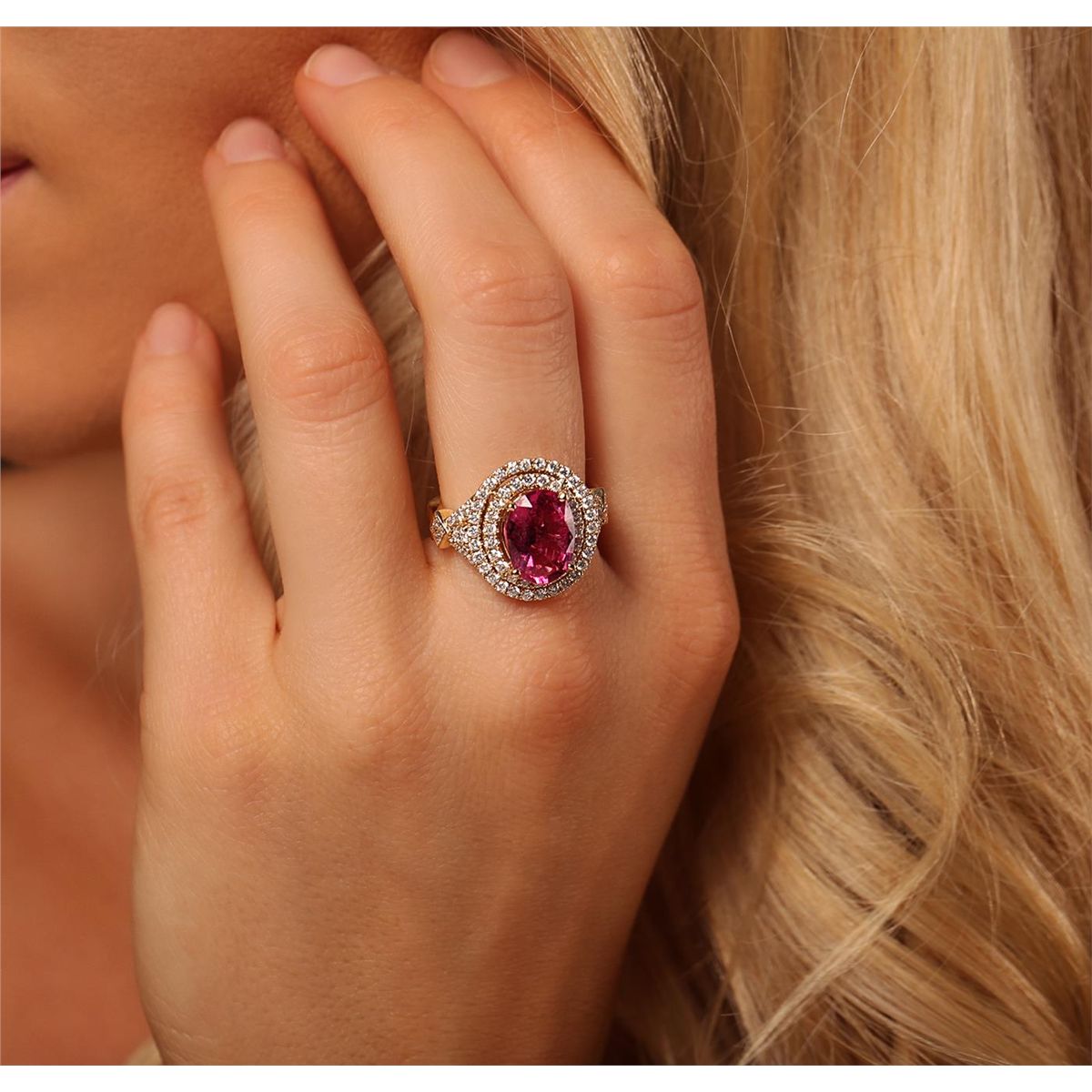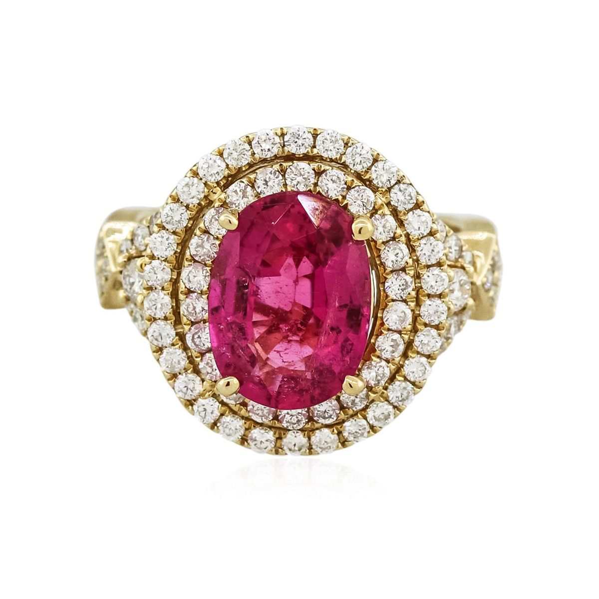 One electronically tested 14KT yellow gold Ladies combination cast & assembled ring with a high polish finish. Condition is new. Identified with markings of "14K". Containing: One prong set oval modified mixed cut natural pink tourmaline, measuring 11.00 x 9.00 x 5.00mm, approximate weight of 3.17ct., clarity is slightly included, type II, medium, moderately strong, reddish purple color, (GIA rP 5/4), cut is very good. Colored gemstones are presumed to have been subjected to commonly used color/clarity enhancement processes. Eight bead set round brilliant cut diamonds, measuring 1.00 - 1.00 x 0.60mm (depth est.) approximate. Total Weight of 8 Stones = 0.03ct. Clarity: SI-2 to I-1. Color: G - H, Cut is Good. Sixty-Eight prong set round brilliant cut diamonds, measuring 2.00 - 1.40 x 1.02mm (depth est.) approximate. Total Weight of 68 Stones = 1.14ct. Clarity: SI-2 to I-1. Color: G - H, Cut is Good. Total Weight of Colored Stones 3.17ct. Total Weight of Diamonds 1.17ct. Total Weight of Ring 6.60 grams. GGL Appraised at $8,360.00.