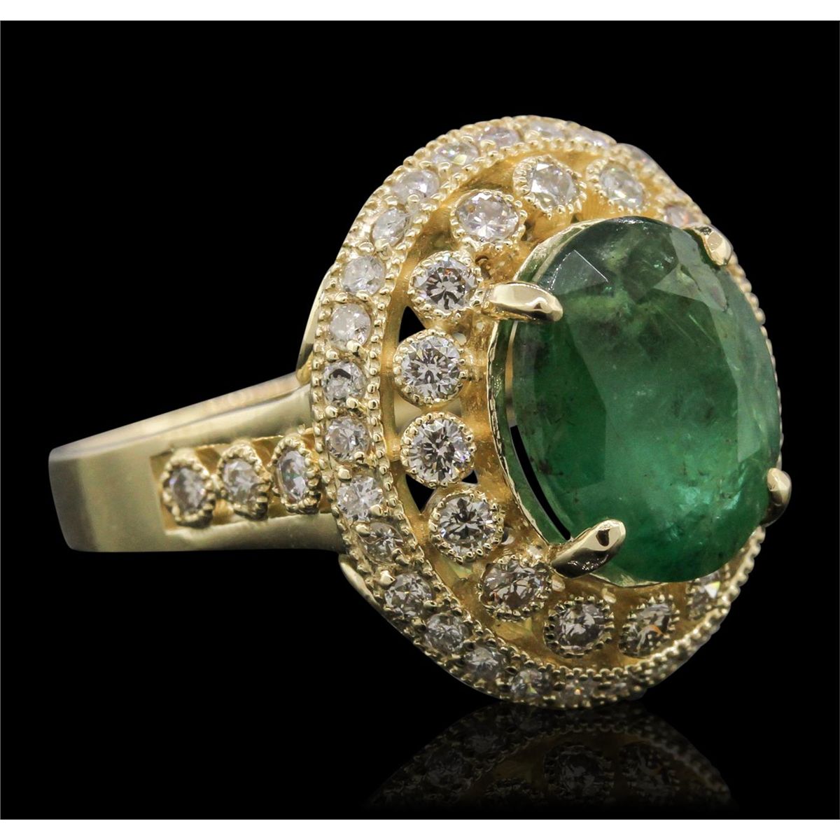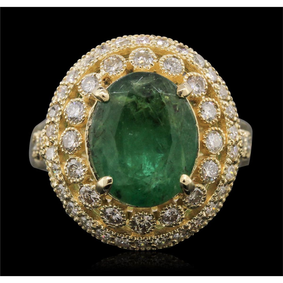 One electronically tested 14KT yellow gold Ladies combination cast & assembled ring with a bright polish finish. Condition is new. Identified with markings of "K14". Containing: One prong set oval modified brilliant cut natural emerald, measuring 11.10 x 8.80 x 5.90mm, approximate weight of 3.18ct., clarity is heavily included, type III, medium dark, moderately strong, green color, (GIA G 6/4), cut is good. Colored gemstones are presumed to have been subjected to commonly used color/clarity enhancement processes. Twenty-Two prong set round brilliant cut diamonds, measuring 2.00 - 2.00 x 1.20mm (depth est.) approximate. Total Weight of 22 Stones = 0.64ct. Clarity: SI-1 to SI-2. Color: I - J, Cut is Good. Thirty-Three prong set diamonds, measuring 1.20 x 1.20 x 0.74mm (depth est.) approximate. Total Weight of 33 Stones = 0.00ct. Clarity: I-1. Color: I - J, Cut is Good. Total Weight of Colored Stones 3.18ct. Total Weight of Diamonds 0.64ct. Total Weight of Ring 6.20 grams. GGL Appraised at $8,440.00.