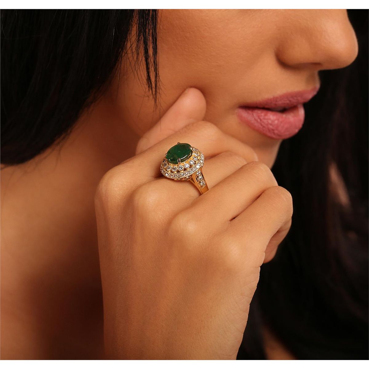 One electronically tested 14KT yellow gold Ladies combination cast & assembled ring with a bright polish finish. Condition is new. Identified with markings of "K14". Containing: One prong set oval modified brilliant cut natural emerald, measuring 11.10 x 8.80 x 5.90mm, approximate weight of 3.18ct., clarity is heavily included, type III, medium dark, moderately strong, green color, (GIA G 6/4), cut is good. Colored gemstones are presumed to have been subjected to commonly used color/clarity enhancement processes. Twenty-Two prong set round brilliant cut diamonds, measuring 2.00 - 2.00 x 1.20mm (depth est.) approximate. Total Weight of 22 Stones = 0.64ct. Clarity: SI-1 to SI-2. Color: I - J, Cut is Good. Thirty-Three prong set diamonds, measuring 1.20 x 1.20 x 0.74mm (depth est.) approximate. Total Weight of 33 Stones = 0.00ct. Clarity: I-1. Color: I - J, Cut is Good. Total Weight of Colored Stones 3.18ct. Total Weight of Diamonds 0.64ct. Total Weight of Ring 6.20 grams. GGL Appraised at $8,440.00.