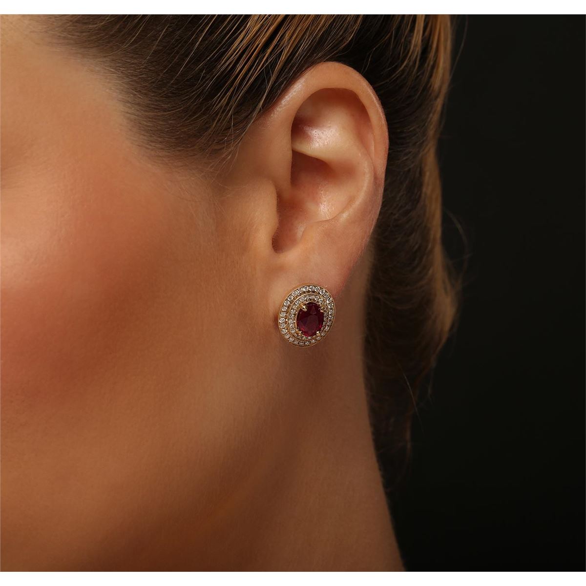 One pair electronically tested 14KT yellow gold Ladies combination cast & assembled stud earrings with friction posts with a bright polish finish. Condition is new. Identified with markings of "14K". Containing: Two prong set oval modified brilliant cut natural rubies, measuring 7.90 x 6.20 x 4.03mm, approximate. Total Weight of 3.20ct., clarity is heavily included, type II, medium, moderately strong, strongly purplish red color, (GIA stpR 5/4), cut is good. One Hundred Two prong set round brilliant cut diamonds, measuring 1.30 - 1.00 x 0.69mm (depth est.) approximate. Total Weight of 102 Stones = 0.56ct. Clarity: I-2 to I-3. Color: H - I, Cut is Good. Colored gemstones are presumed to have been subjected to commonly used enhancement processes. All diamonds and colored gemstones are graded in the mounting, unless otherwise stated. Total Weight of Colored Stones 3.20ct. Total Weight of Diamonds 0.56ct. Total Weight of Earrings 6.00 grams. GGL Appraised at $5,535.00.