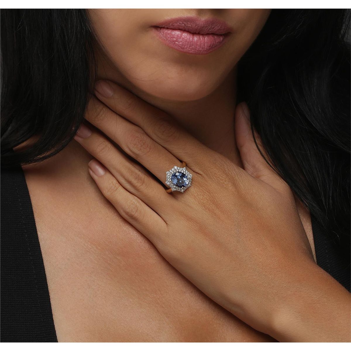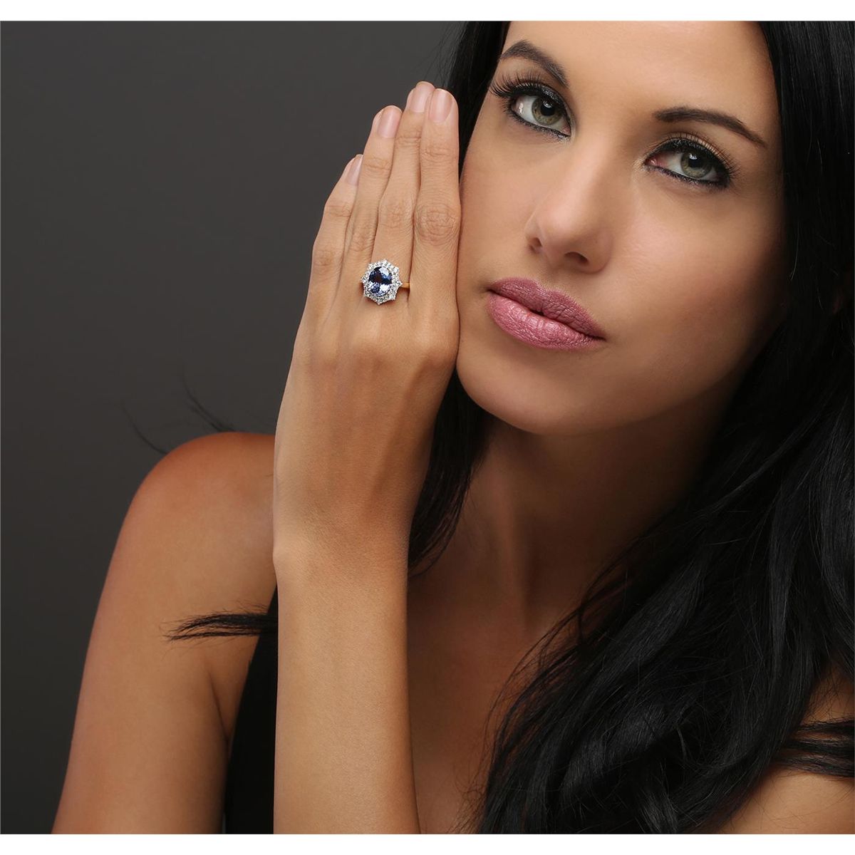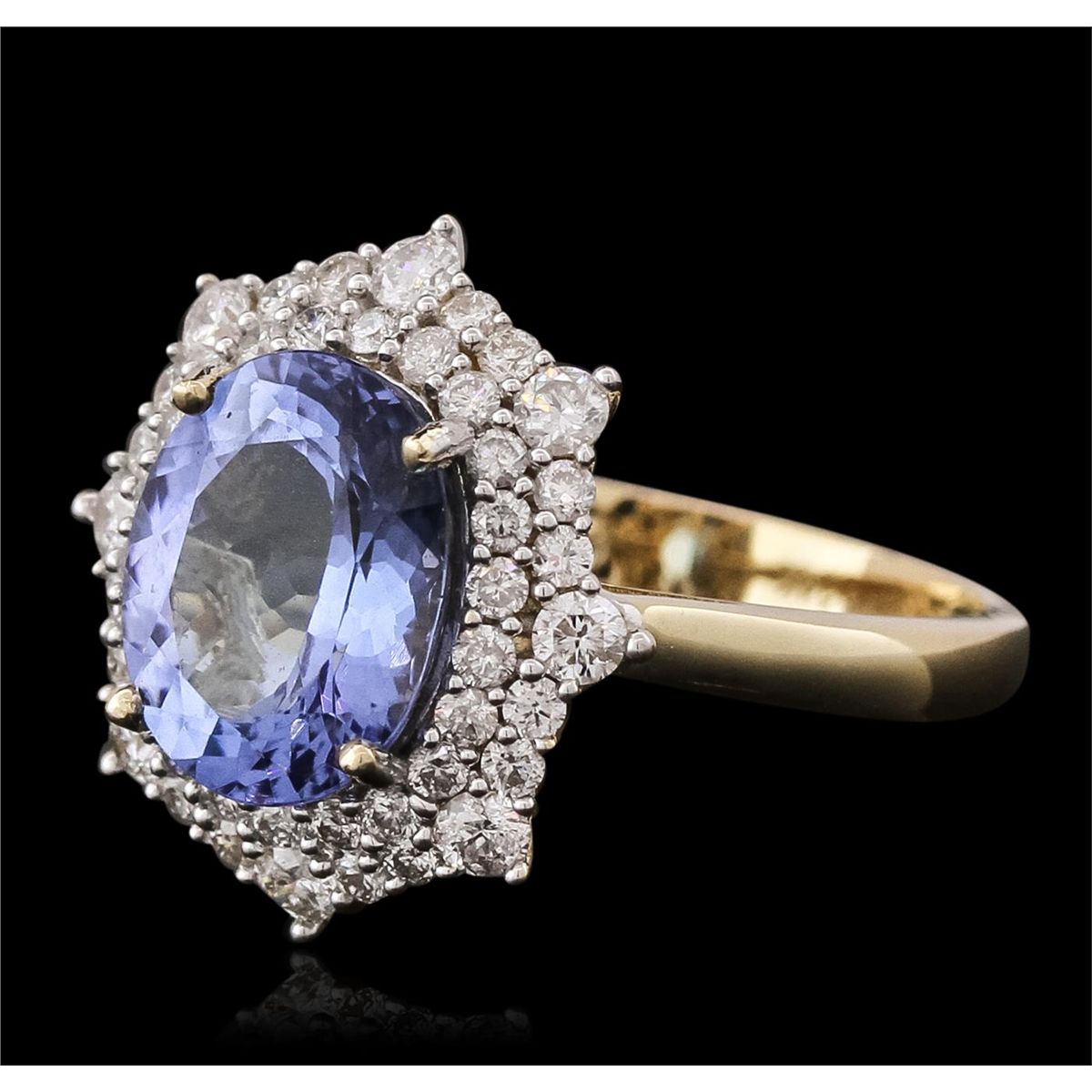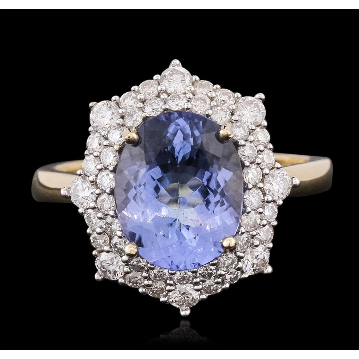 One electronically tested 14KT yellow gold ladies combination cast & assembled tanzanite and diamond ring with a flat shank with a bright polish finish. Identified with markings of "14K". Condition is new. Containing: One prong set oval modified brilliant cut natural tanzanite, measuring 10.48 x 8.50 x 5.31mm, approximate weight of 3.20ct., clarity is eye clean, type I, medium light, very slightly grayish, violet color, (GIA V 4/3), cut is good. Eight prong set round brilliant cut diamonds, measuring 2.10 - 2.10 x 1.26mm (depth est.) approximate total weight of 8 Stones = 0.27ct. Clarity: SI-2 to I-1. Color: I - J, Cut is Good. Thirty-Eight prong set round brilliant cut diamonds, measuring 1.20 - 1.20 x 0.72mm (depth est.) approximate total weight of 38 Stones = 0.24ct. Clarity: I-1 to I-2. Color: I - J, Cut is Good. Colored gemstones are presumed to have been subjected to commonly used enhancement processes. All diamonds and colored gemstones are graded in the mounting, unless otherwise stated. Total Weight of Colored Stones 3.20ct. Total Weight of Diamonds 0.51ct. Total Weight of Ring 3.70 grams. GGL Appraised at $7,070.00.