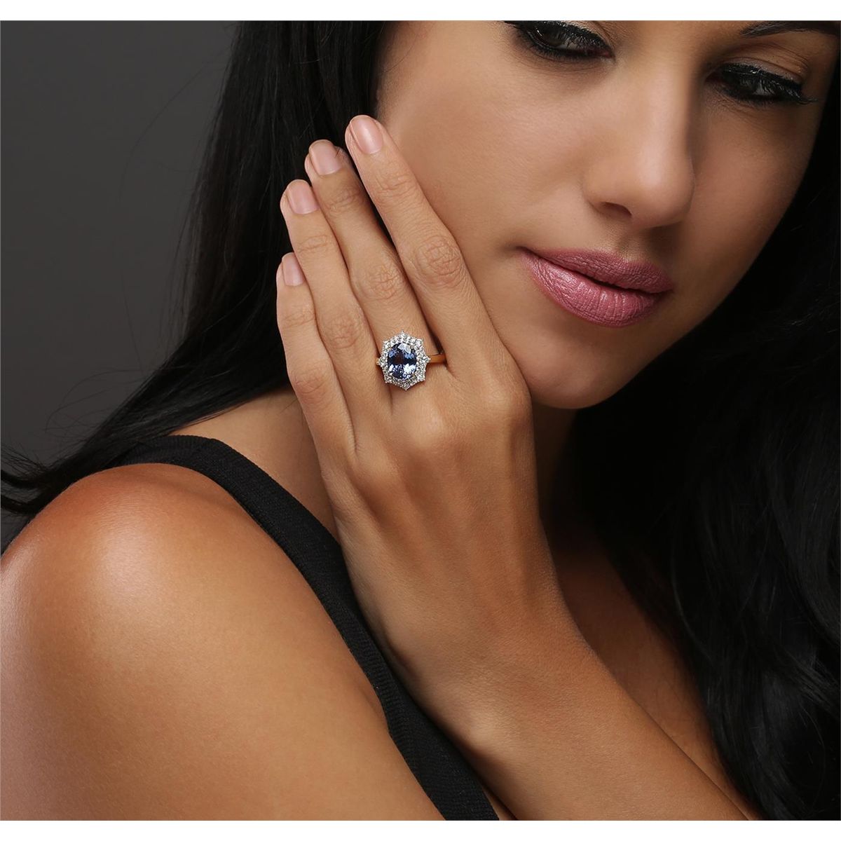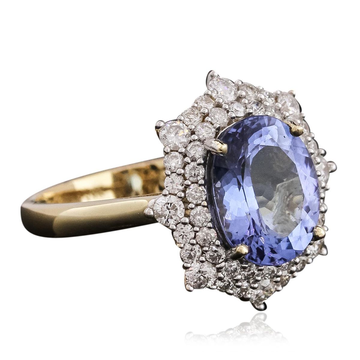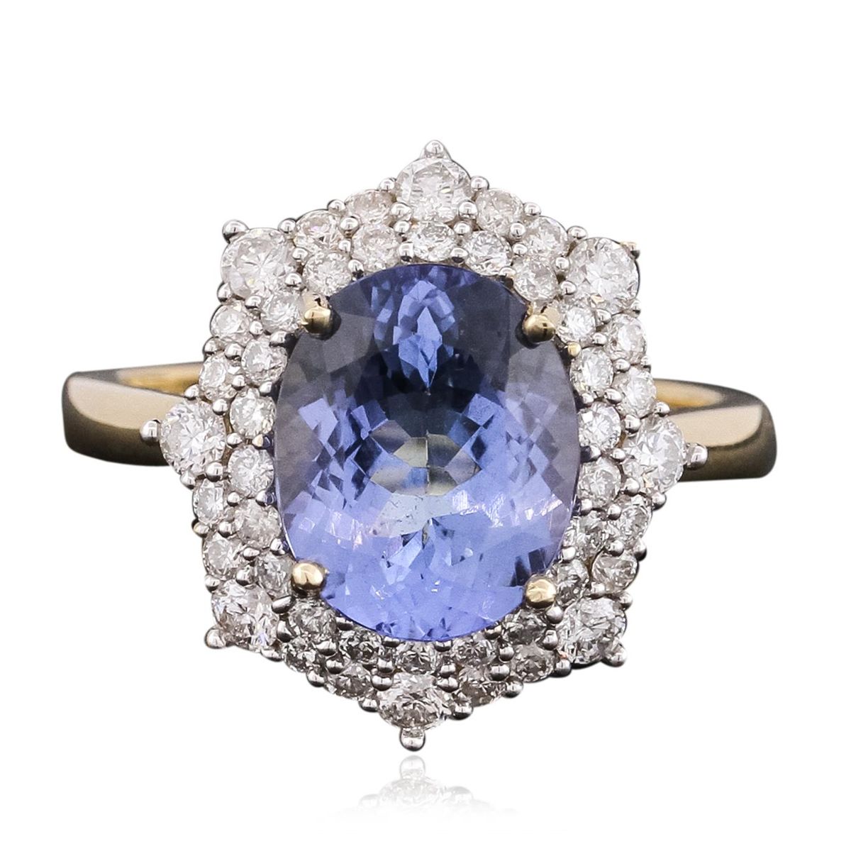 One electronically tested 14KT yellow gold ladies combination cast & assembled tanzanite and diamond ring with a flat shank with a bright polish finish. Identified with markings of "14K". Condition is new. Containing: One prong set oval modified brilliant cut natural tanzanite, measuring 10.48 x 8.50 x 5.31mm, approximate weight of 3.20ct., clarity is eye clean, type I, medium light, very slightly grayish, violet color, (GIA V 4/3), cut is good. Eight prong set round brilliant cut diamonds, measuring 2.10 - 2.10 x 1.26mm (depth est.) approximate total weight of 8 Stones = 0.27ct. Clarity: SI-2 to I-1. Color: I - J, Cut is Good. Thirty-Eight prong set round brilliant cut diamonds, measuring 1.20 - 1.20 x 0.72mm (depth est.) approximate total weight of 38 Stones = 0.24ct. Clarity: I-1 to I-2. Color: I - J, Cut is Good. Colored gemstones are presumed to have been subjected to commonly used enhancement processes. All diamonds and colored gemstones are graded in the mounting, unless otherwise stated. Total Weight of Colored Stones 3.20ct. Total Weight of Diamonds 0.51ct. Total Weight of Ring 3.70 grams. GGL Appraised at $7,070.00.