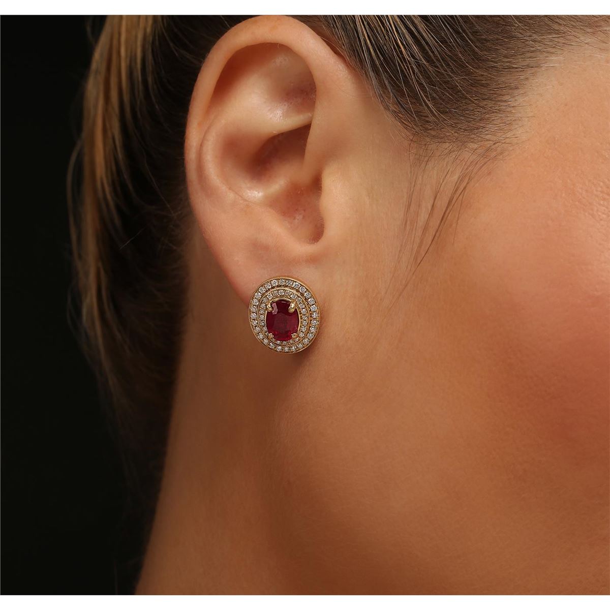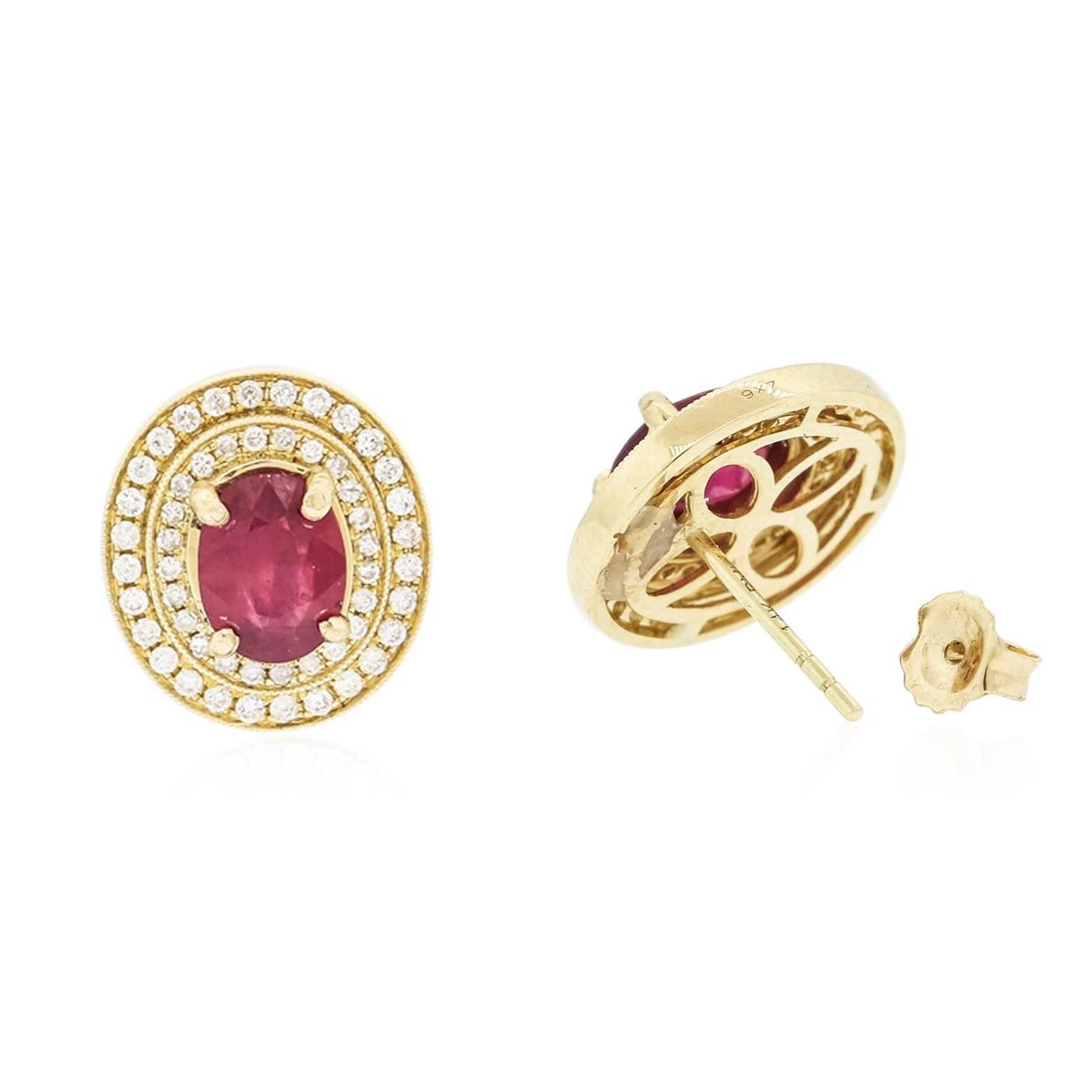 One pair electronically tested 14KT yellow gold Ladies combination cast & assembled stud earrings with friction posts with a bright polish finish. Condition is new. Identified with markings of "14K". Containing: Two prong set oval modified brilliant cut natural rubies, measuring 7.90 x 6.20 x 4.03mm, approximate. Total Weight of 3.20ct., clarity is heavily included, type II, medium, moderately strong, strongly purplish red color, (GIA stpR 5/4), cut is good. One Hundred Two prong set round brilliant cut diamonds, measuring 1.30 - 1.00 x 0.69mm (depth est.) approximate. Total Weight of 102 Stones = 0.56ct. Clarity: I-2 to I-3. Color: H - I, Cut is Good. Colored gemstones are presumed to have been subjected to commonly used enhancement processes. All diamonds and colored gemstones are graded in the mounting, unless otherwise stated. Total Weight of Colored Stones 3.20ct. Total Weight of Diamonds 0.56ct. Total Weight of Earrings 6.00 grams. GGL Appraised at $5,535.00.