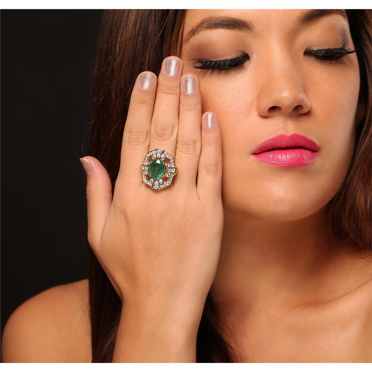 One electronically tested 14KT yellow gold Ladies combination cast & assembled fancy ring with a high polish finish. Condition is new. Identified with markings of "14K". Containing: One prong set oval modified mixed cut natural emerald, measuring 13.20 x 10.00 x 4.40mm, approximate weight of 3.22ct., clarity is heavily included, type III, medium light, very slightly grayish, very slightly bluish green color, (GIA vslbG 4/3), cut is good. Colored gemstones are presumed to have been subjected to commonly used and possible undetectable color/clarity enhancement processes. Eight bezel set round brilliant cut diamonds, measuring 2.50 - 2.50 x 1.66mm (depth est.) approximate total weight of 8 Stones = 0.51ct. Clarity of SI-2 to I-1, Color of H - I, Cut is Good. Thirty bead set round brilliant cut diamonds, measuring 2.10 - 1.70 x 1.14mm (depth est.) approximate total weight of 30 Stones = 0.75ct. Clarity of SI-2 to I-1, Color of H - I, Cut is Good. Total Weight of Colored Stones 3.22ct. Total Weight of Diamonds 1.26ct. Total Weight of Ring 8.50 grams. GGL Appraised at $12,210.00.