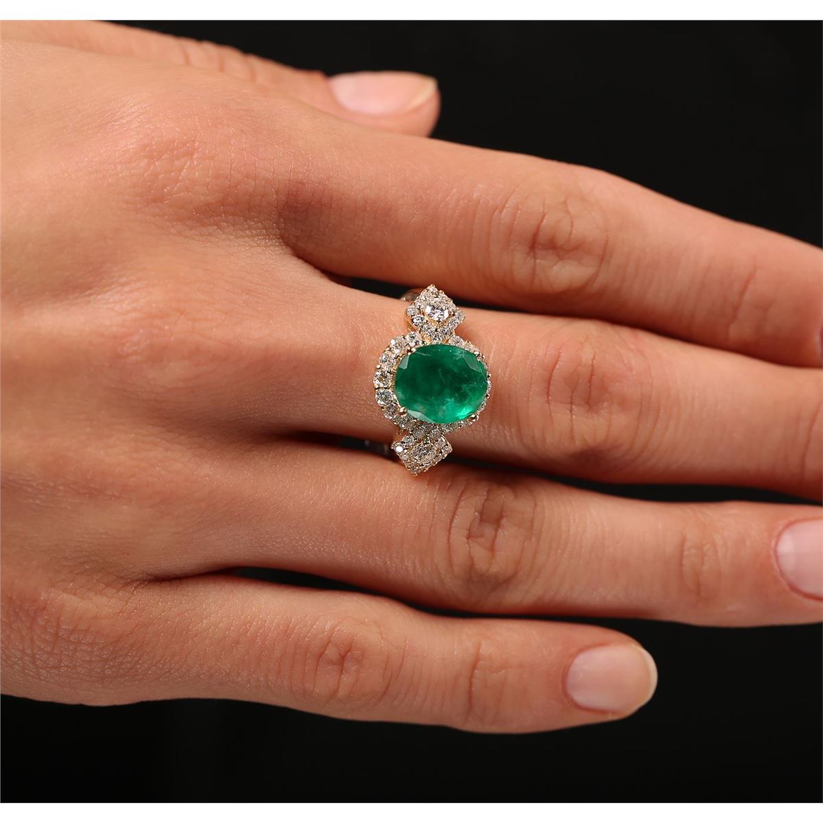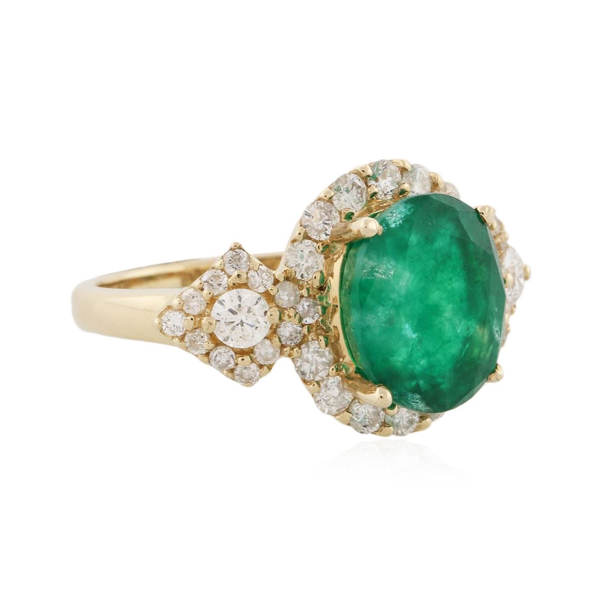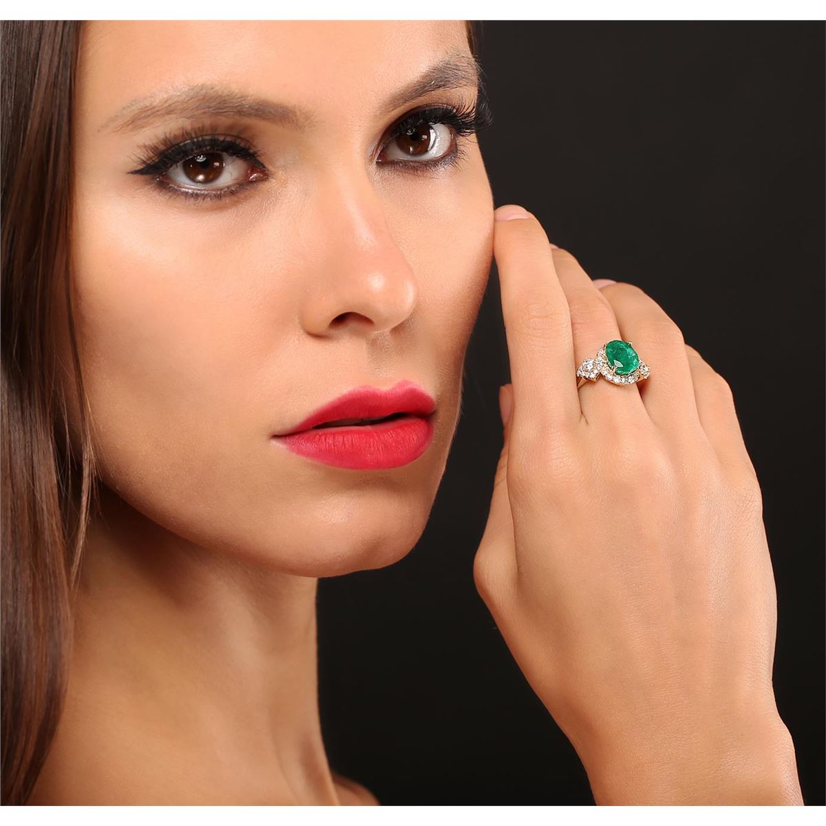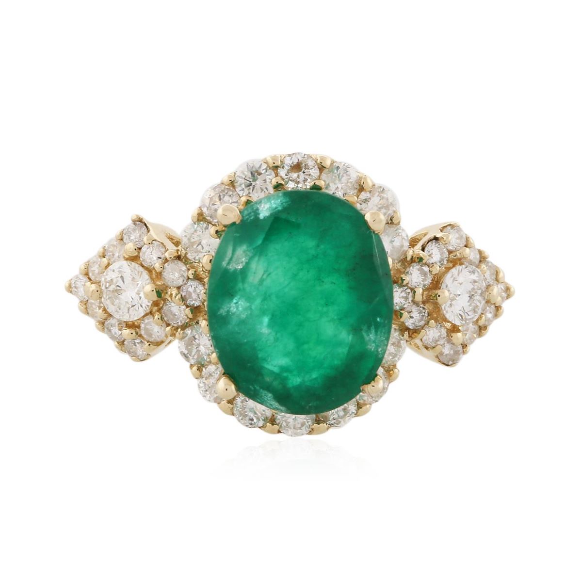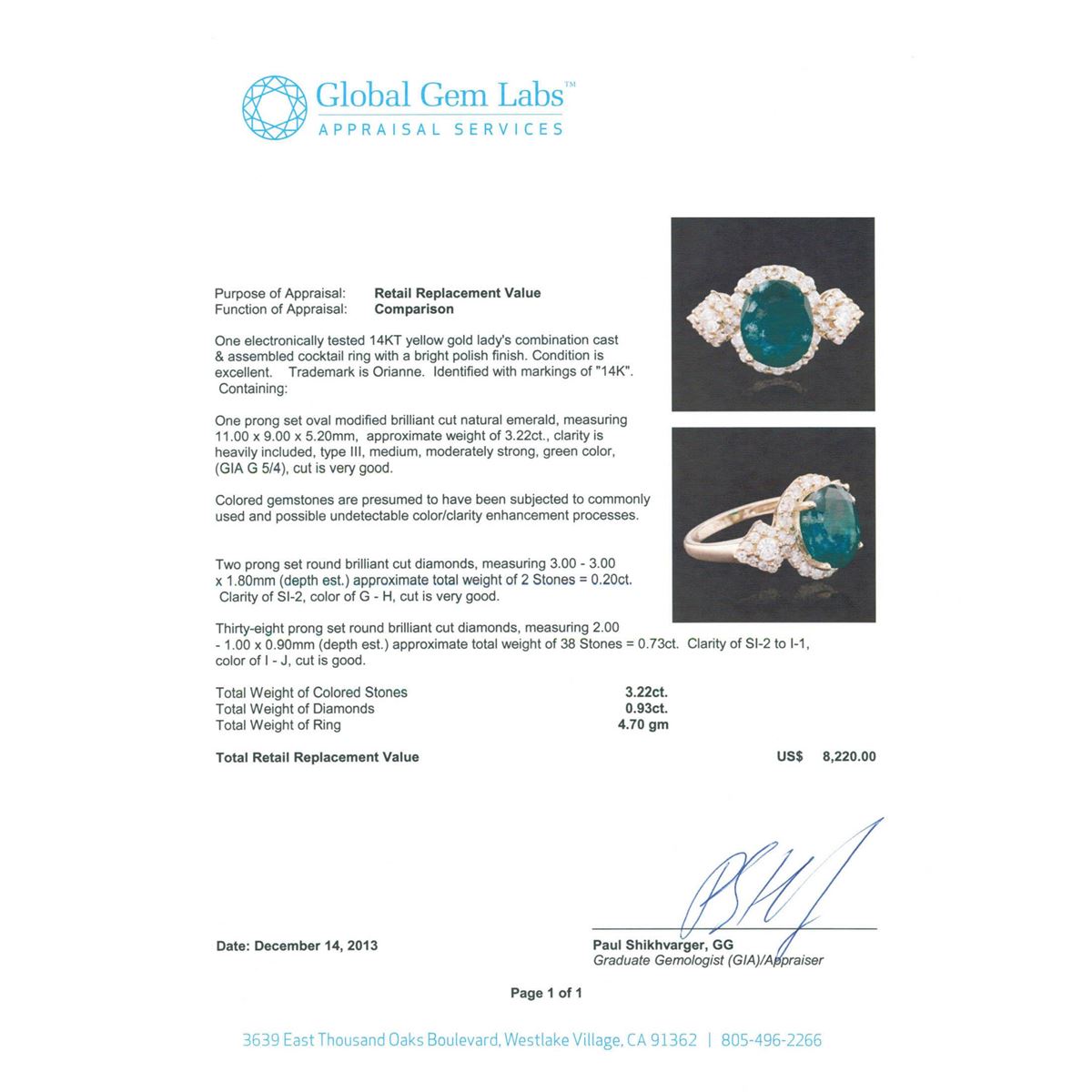 One electronically tested 14KT yellow gold Ladies combination cast & assembled cocktail ring with a bright polish finish. Trademark is Orianne. Identified with markings of "14K". Condition is excellent. Containing: One prong set oval modified brilliant cut natural emerald, measuring 11.00 x 9.00 x 5.20mm, approximate weight of 3.22ct., clarity is heavily included, type III, medium, moderately strong, green color, (GIA G 5/4), cut is very good. Colored gemstones are presumed to have been subjected to commonly used and possible undetectable color/clarity enhancement processes. Two prong set round brilliant cut diamonds, measuring 3.00 - 3.00 x 1.80mm (depth est.) approximate total weight of 2 Stones = 0.20ct. Clarity of SI-2, Color of G - H, Cut is Very Good. Thirty-Eight prong set round brilliant cut diamonds, measuring 2.00 - 1.00 x 0.90mm (depth est.) approximate total weight of 38 Stones = 0.73ct. Clarity of SI-2 to I-1, Color of I - J, Cut is Good. Total Weight of Colored Stones 3.22ct. Total Weight of Diamonds 0.93ct. Total Weight of Ring4.70gm. GGL Appraised at $8,220.00.