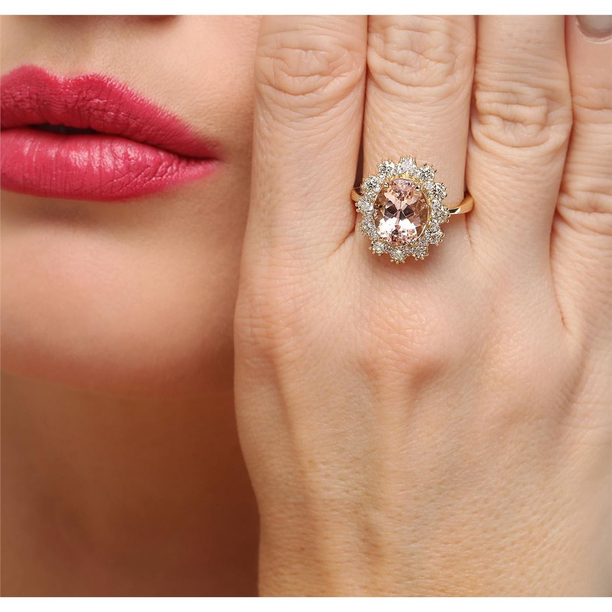 One electronically tested 14KT yellow gold ladies combination cast & assembled morganite and diamond ring with a bright polish finish. Identified with markings of "14K". Condition is new. Containing: One prong set oval modified brilliant cut natural morganite, measuring 11.00 x 8.90 x 5.79mm, approximate weight of 3.24ct., clarity is eye clean, type I, light, slightly brownish, reddish orange color, (GIA rO 3/2), cut is good. Twenty-Four prong set round brilliant cut diamonds, measuring 2.50 - 1.30 x 1.14mm (depth est.) approximate total weight of 24 Stones = 0.80ct. Clarity: SI-1 to SI-2. Color: I - J, Cut is Good. Colored gemstones are presumed to have been subjected to commonly used enhancement processes. All diamonds and colored gemstones are graded in the mounting, unless otherwise stated. Total Weight of Colored Stones 3.24ct. Total Weight of Diamonds 0.80ct. Total Weight of Ring 5.40 grams. GGL Appraised at $4,230.00.