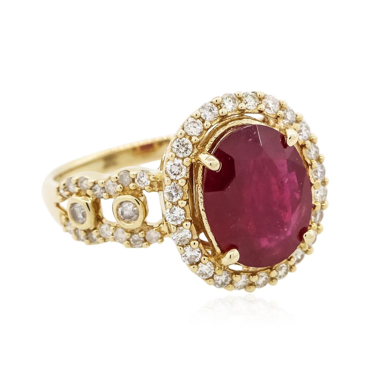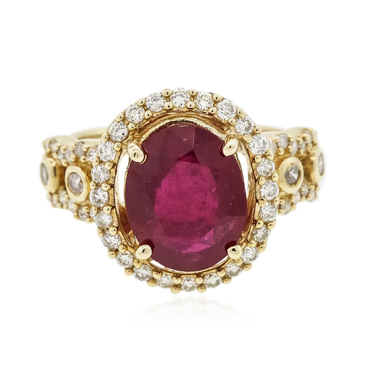 One electronically tested 14KT yellow gold ladies cast ruby and diamond ring with a bright polish finish. Condition is new, good workmanship. The featured ruby was set within a diamond bezel supported by elaborate diamond set shoulders, completed by a two millimeter wide band. Trademark is Orianne. Identified with markings of "14K". Containing: One prong set oval mixed cut natural ruby, measuring 11.00 x 8.70 x 3.80mm, 10%. bulge factor, approximate weight of 3.24ct., clarity is heavily included, type II, medium dark, very slightly brownish, slightly purplish red color, (GIA slpR 6/3), cut is good. Transmitting light somewhat diffusely, transparent to translucent. Naturally occurring internal & external characteristics are present. Indications of laboratory high temperature heat treatment, with glass & flux additives. Graded in the setting. Ruby has a low tolerance to rhodium plating, repolishing the surface, & ultrasonic cleaning. Four bezel set round brilliant cut diamonds, measuring 1.80 - 1.80 x 1.08mm (depth est.) approximate. Total Weight of 4 Stones = 0.10ct. Graded in the setting. Clarity: I-1 to I-2 . Color: G - H Fifty-Two prong set round brilliant cut diamonds, measuring 1.40 - 1.20 x 0.78mm (depth est.) approximate. Total Weight of 52 Stones = 0.51ct. Graded in the setting. Clarity: SI-1 to I-1 . Color: G - I. Total Weight of Colored Stones 3.24ct.. Total Weight of Diamonds 0.61ct.. Total Weight of Ring 5.13gm. AIG Appraised at $3,725.00.