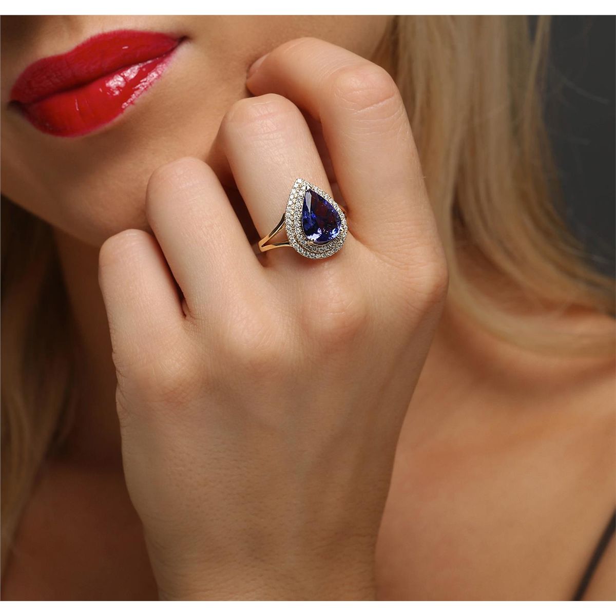 One electronically tested 14KT yellow gold ladies combination cast & assembled tanzanite and diamond ring with a split shank with a bright polish finish. Identified with markings of "14K". Condition is new. Containing: One prong set pear modified brilliant cut natural tanzanite, measuring 11.00 x 8.86 x 4.96mm, approximate weight of 3.24ct., clarity is eye clean, type I, medium, moderately strong, bluish violet color, (GIA bV 5/4), cut is very good. Fifty-Nine prong set round brilliant cut diamonds, measuring 1.20 - 1.20 x 0.72mm (depth est.) approximate total weight of 59 Stones = 0.37ct. Clarity: I-1 to I-2. Color: I - J, Cut is Good. Colored gemstones are presumed to have been subjected to commonly used enhancement processes. All diamonds and colored gemstones are graded in the mounting, unless otherwise stated total weight of Colored Stones 3.24ct. Total Weight of Diamonds 0.37ct. Total Weight of Ring 5.70 grams. GGL Appraised at $6,810.00.