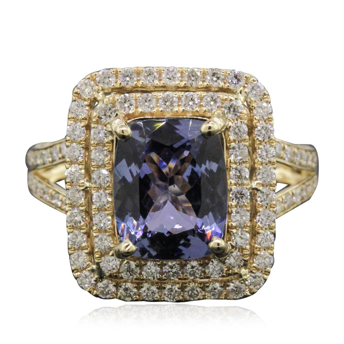 One electronically tested 14KT yellow gold ladies combination cast & assembled tanzanite and diamond ring with a split shank with a bright polish finish. Identified with markings of "14K". Condition is new. Containing: One prong set rectangular cushion modified brilliant cut natural tanzanite, measuring 9.85 x 8.02 x 5.21mm, approximate weight of 3.24ct., clarity is eye clean, type I, medium light, very slightly grayish, violet color, (GIA V 4/3), cut is very good. One Hundred Forty-Four prong set round brilliant cut diamonds, measuring 1.20 - 1.20 x 0.72mm (depth est.) approximate total weight of 144 Stones = 0.91ct. Clarity: SI-2 to I-1. Color: I - J, Cut is Good. Colored gemstones are presumed to have been subjected to commonly used enhancement processes. All diamonds and colored gemstones are graded in the mounting, unless otherwise stated. Total Weight of Colored Stones 3.24ct. Total Weight of Diamonds 0.91ct. Total Weight of Ring 6.60 grams. GGL Appraised at $9,005.00.