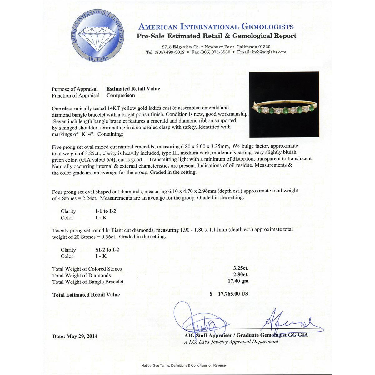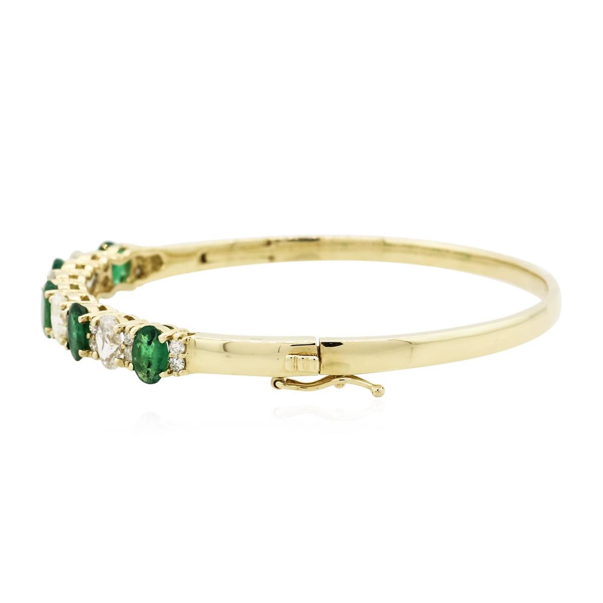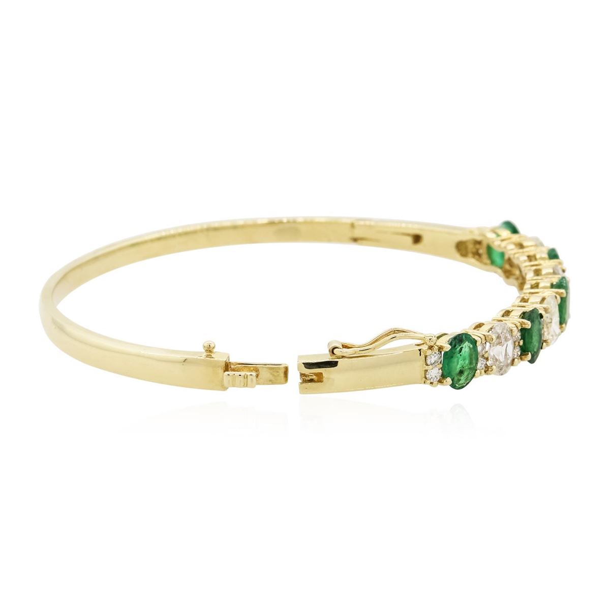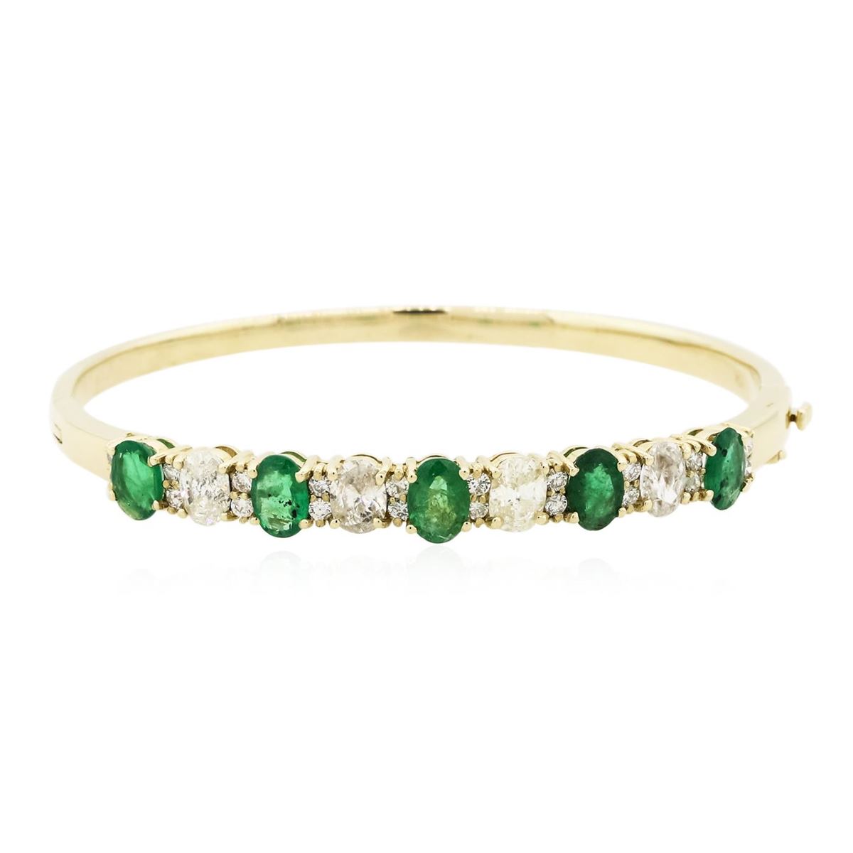 One electronically tested 14KT yellow gold ladies cast & assembled emerald and diamond bangle bracelet with a bright polish finish. Condition is new, good workmanship. Seven inch length bangle bracelet features a emerald and diamond ribbon supported by a hinged shoulder, terminating in a concealed clasp with safety. Identified with markings of "K14". Containing: Five prong set oval mixed cut natural emeralds, measuring 6.80 x 5.00. x 3.25mm, 6%. bulge factor, approximate. Total Weight of 3.25ct., clarity is heavily included, type III, medium dark, moderately strong, very slightly bluish green color, (GIA vslbG 6/4), cut is good. Transmitting light with a minimum of distortion, transparent to translucent. Naturally occurring internal & external characteristics are present. Indications of oil residue. Measurements & the color grade are an average for the group. Graded in the setting. Four prong set oval shaped cut diamonds, measuring 6.10 x 4.70 x 2.96mm (depth est.) approximate. Total Weight of 4 Stones = 2.24ct. Measurements are an average for the group. Graded in the setting. Clarity: I-1 to I-2 . Color: I - K Twenty prong set round brilliant cut diamonds, measuring 1.90 - 1.80 x 1.11mm (depth est.) approximate. Total Weight of 20 Stones = 0.56ct. Graded in the setting. Clarity: SI-2 to I-2 . Color: I - K. Total Weight of Colored Stones 3.25ct.. Total Weight of Diamonds 2.80ct.. Total Weight of Bangle Bracelet 17.40gm. AIG Appraised at $17,765.00.