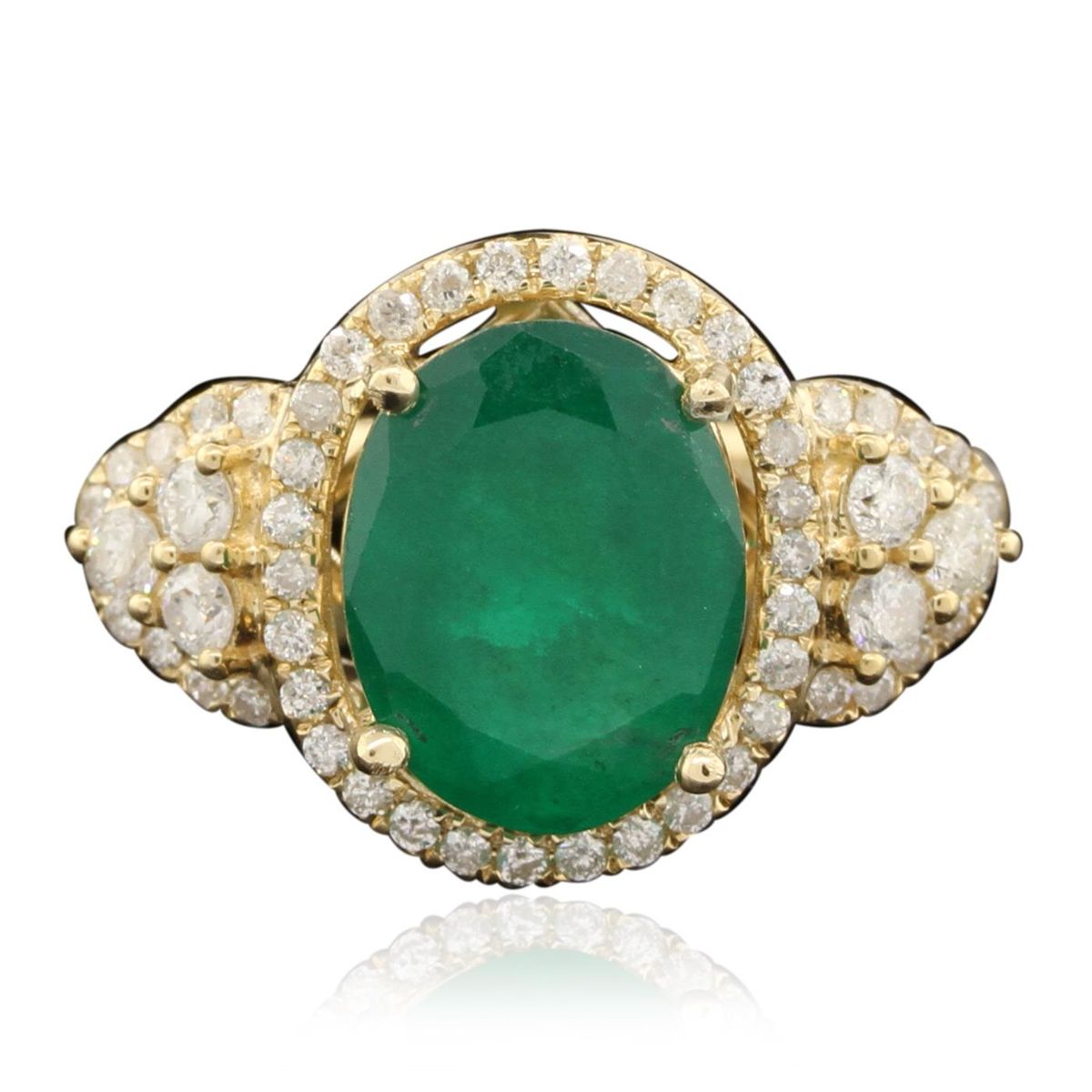 One electronically tested 14KT yellow gold Ladies combination cast & assembled cocktail ring with a bright polish finish. Trademark is Orianne. Identified with markings of "14KP". Condition is excellent. Containing: One prong set oval modified brilliant cut natural emerald, measuring 10.60 x 8.80 x 6.20mm, approximate weight of 3.25ct., clarity is heavily included, type III, medium dark, moderately strong, green color, (GIA G 6/4), cut is good. Colored gemstones are presumed to have been subjected to commonly used and possible undetectable color/clarity enhancement processes. Fifty-Six prong set round brilliant cut diamonds, measuring 1.90 - 1.10 x 0.90mm (depth est.) approximate total weight of 56 Stones = 0.58ct. Clarity of I-1 to I-2, Color of H - I, Cut is Good. Total Weight of Colored Stones 3.25ct. Total Weight of Diamonds 0.58ct. Total Weight of Ring 5.40gm. GGL Appraised at $9,180.00.