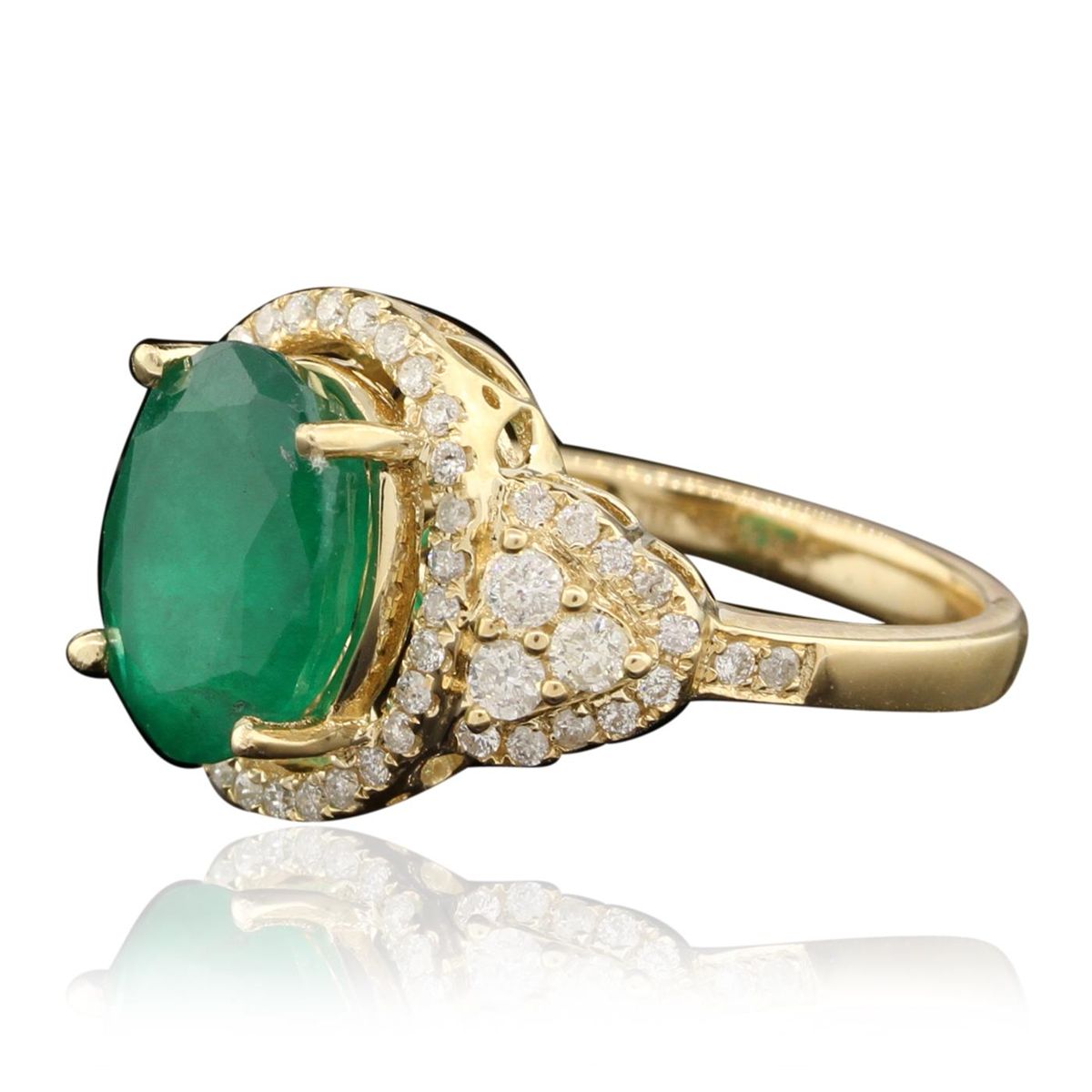 One electronically tested 14KT yellow gold Ladies combination cast & assembled cocktail ring with a bright polish finish. Trademark is Orianne. Identified with markings of "14KP". Condition is excellent. Containing: One prong set oval modified brilliant cut natural emerald, measuring 10.60 x 8.80 x 6.20mm, approximate weight of 3.25ct., clarity is heavily included, type III, medium dark, moderately strong, green color, (GIA G 6/4), cut is good. Colored gemstones are presumed to have been subjected to commonly used and possible undetectable color/clarity enhancement processes. Fifty-Six prong set round brilliant cut diamonds, measuring 1.90 - 1.10 x 0.90mm (depth est.) approximate total weight of 56 Stones = 0.58ct. Clarity of I-1 to I-2, Color of H - I, Cut is Good. Total Weight of Colored Stones 3.25ct. Total Weight of Diamonds 0.58ct. Total Weight of Ring 5.40gm. GGL Appraised at $9,180.00.
