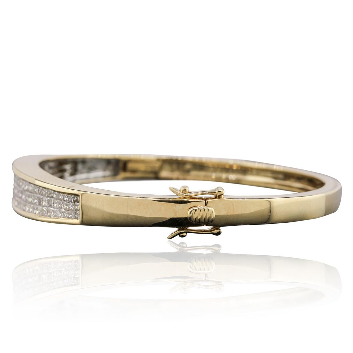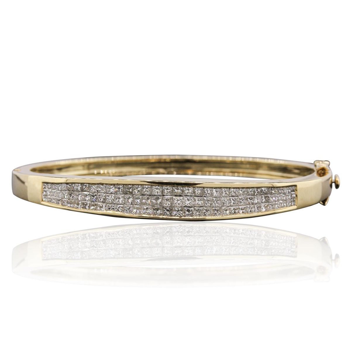 One electronically tested 14KT yellow gold ladies cast & assembled diamond bangle bracelet with a bright polish finish. Condition is new, good workmanship. Seven inch length hinged diamond set bangle bracelet, terminating in a concealed clasp with twin safeties. Identified with markings of "14K". Containing: Ninety-Nine invisible set round brilliant cut diamonds, measuring 2.10 - 1.30 x 1.02mm (depth est.) approximate. Total Weight of 99 Stones = 3.25ct. Graded in the setting. Clarity: VS-1 to SI-1. Color: H - J. Total Weight of Diamonds 3.25ct. Total Weight of Bangle Bracelet 27.20 grams. AIG Appraised at $11,365.00.