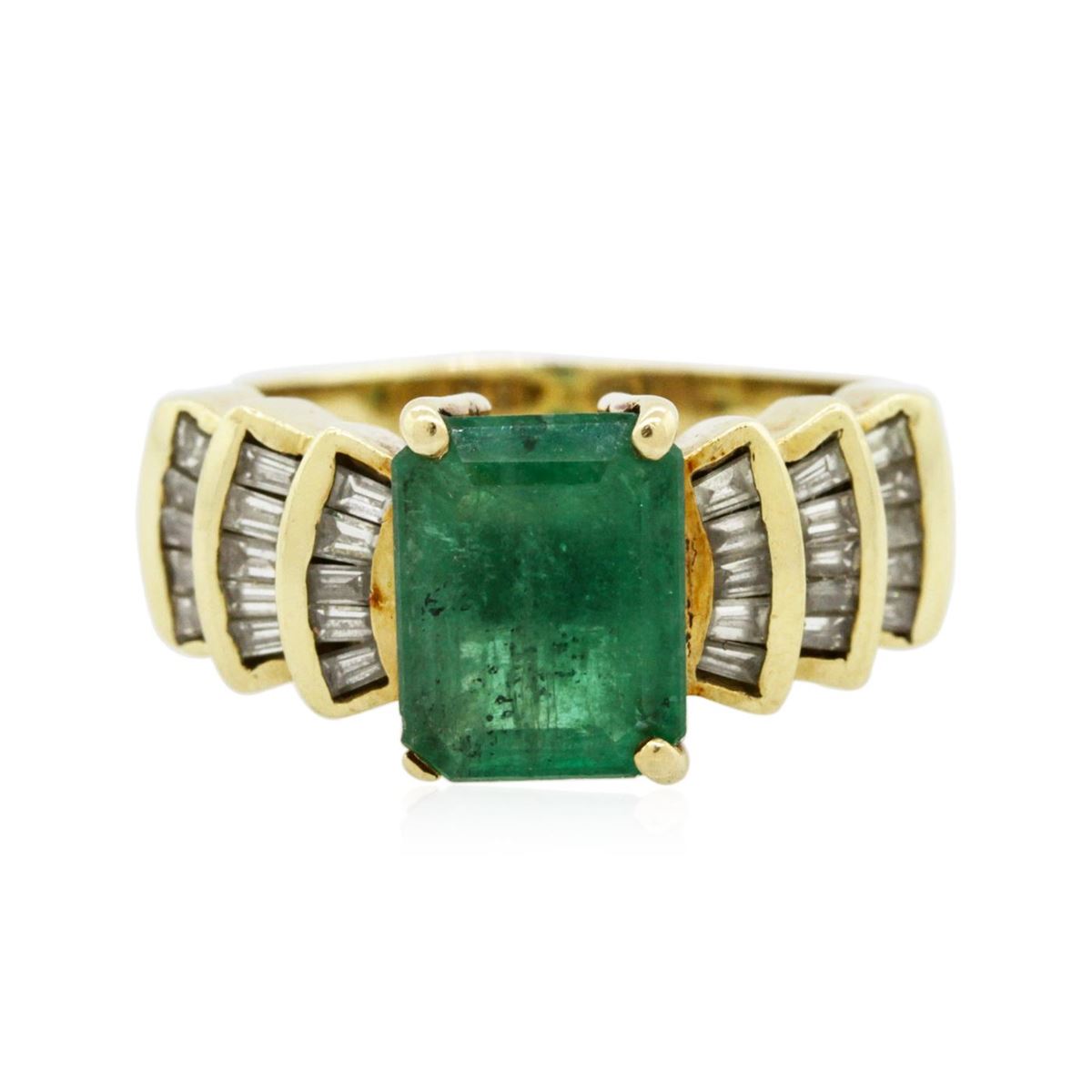 One electronically tested 14KT yellow gold Ladies combination cast & assembled ring with a bright polish finish. Identified with markings of "14K". Condition is new. Containing: One prong set emerald standard step cut natural emerald, measuring 10.09 x 8.05 x 5.47mm, approximate weight of 3.26ct., clarity is heavily included, type III, medium dark, moderately strong, green color, (GIA G 6/4), cut is good. Colored gemstones are presumed to have been subjected to commonly used color/clarity enhancement processes. Thirty prong set baguette cut diamonds, measuring 2.20 x 1.30 x 1.11mm (depth est.) approximate. Total Weight of 30 Stones = 0.87ct. Clarity: I-2 to I-3. Color: I - J, Cut is Fair. Total Weight of Colored Stones 3.26ct. Total Weight of Diamonds 0.87ct. Total Weight of Ring 8.40 grams. GGL Appraised at $9,900.00.