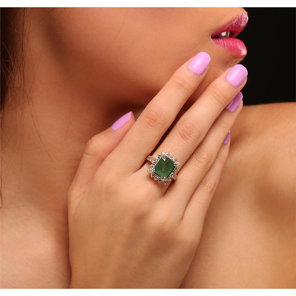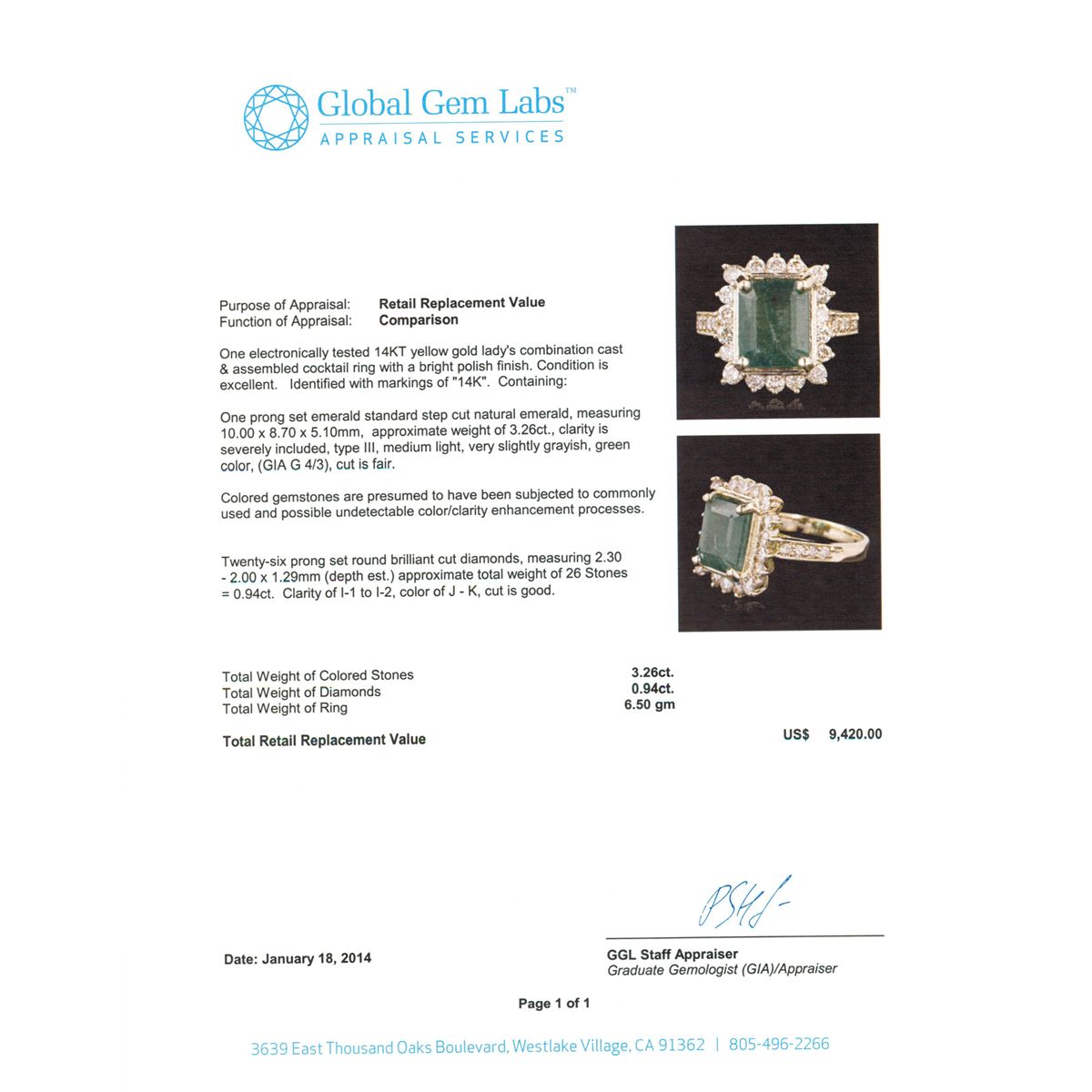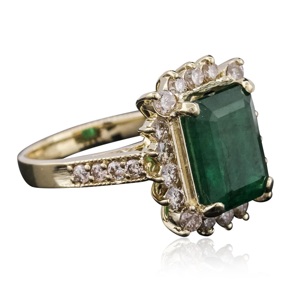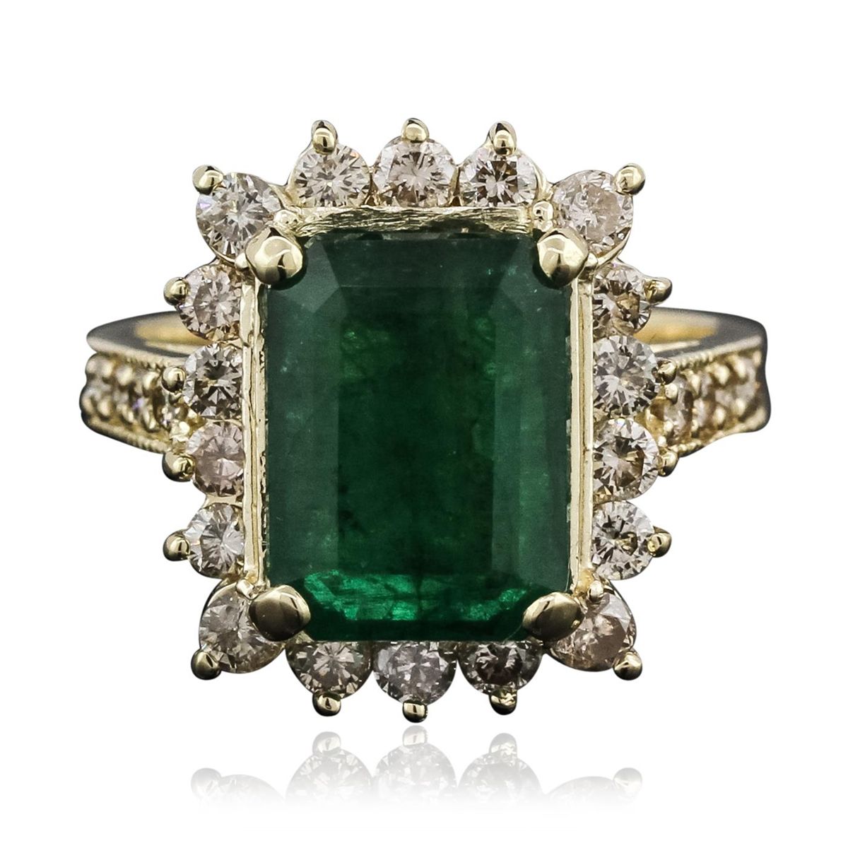 One electronically tested 14KT yellow gold Ladies combination cast & assembled cocktail ring with a bright polish finish. Identified with markings of "14K". Condition is excellent. Containing: One prong set emerald standard step cut natural emerald, measuring 10.00 x 8.70 x 5.10mm, approximate weight of 3.26ct., clarity is severely included, type III, medium light, very slightly grayish, green color, (GIA G 4/3), cut is fair. Colored gemstones are presumed to have been subjected to commonly used and possible undetectable color/clarity enhancement processes. Twenty-Six prong set round brilliant cut diamonds, measuring 2.30 - 2.00 x 1.29mm (depth est.) approximate total weight of 26 Stones = 0.94ct. Clarity of I-1 to I-2, Color of J - K, Cut is Good. Total Weight of Colored Stones 3.26ct. Total Weight of Diamonds 0.94ct. Total Weight of Ring 6.50gm. GGL Appraised at $9,420.00.