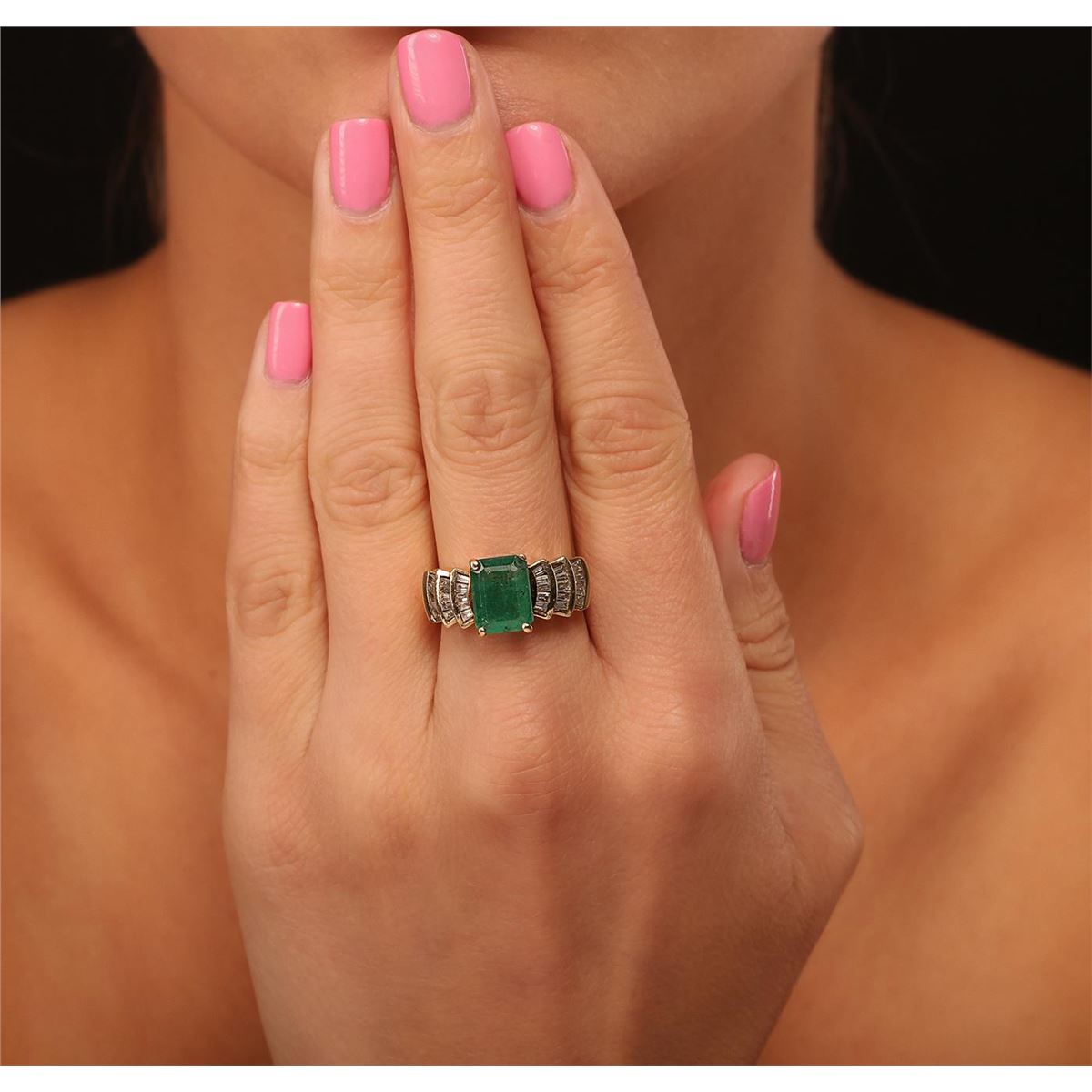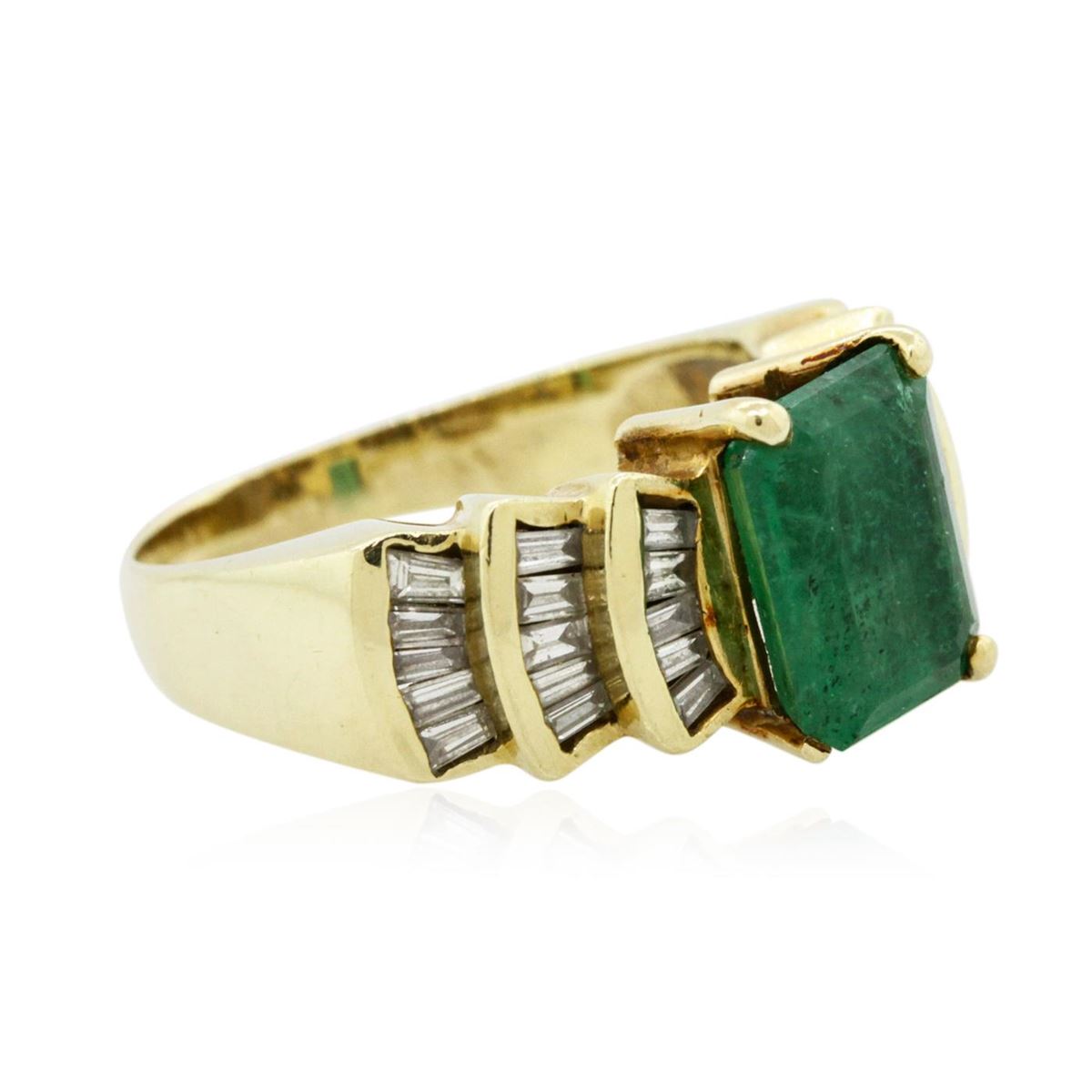 One electronically tested 14KT yellow gold Ladies combination cast & assembled ring with a bright polish finish. Identified with markings of "14K". Condition is new. Containing: One prong set emerald standard step cut natural emerald, measuring 10.09 x 8.05 x 5.47mm, approximate weight of 3.26ct., clarity is heavily included, type III, medium dark, moderately strong, green color, (GIA G 6/4), cut is good. Colored gemstones are presumed to have been subjected to commonly used color/clarity enhancement processes. Thirty prong set baguette cut diamonds, measuring 2.20 x 1.30 x 1.11mm (depth est.) approximate. Total Weight of 30 Stones = 0.87ct. Clarity: I-2 to I-3. Color: I - J, Cut is Fair. Total Weight of Colored Stones 3.26ct. Total Weight of Diamonds 0.87ct. Total Weight of Ring 8.40 grams. GGL Appraised at $9,900.00.