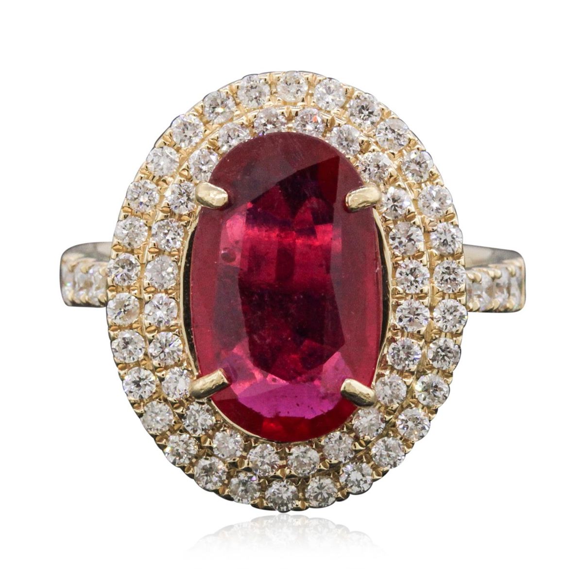 One electronically tested 14KT yellow gold ladies combination cast & assembled ruby and diamond ring with a flat shank with a bright polish finish. Identified with markings of "14K". Condition is new. Containing: One prong set oval modified brilliant cut natural ruby, measuring 13.66 x 8.24 x 3.40mm, approximate weight of 3.26ct., clarity is heavily included, type II, medium dark, moderately strong, strongly purplish red color, (GIA stpR 6/4), cut is good. Sixty-Two prong set round brilliant cut diamonds, measuring 2.00 - 1.30 x 0.99mm (depth est.) approximate total weight of 62 Stones = 0.70ct. Clarity: SI-2 to I-2. Color: I - J, Cut is Good. Colored gemstones are presumed to have been subjected to commonly used enhancement processes. All diamonds and colored gemstones are graded in the mounting, unless otherwise stated. Total Weight of Colored Stones 3.26ct. Total Weight of Diamonds 0.70ct. Total Weight of Ring 6.50 grams. GGL Appraised at $4,795.00. GGL Appraised at $7,280.00.