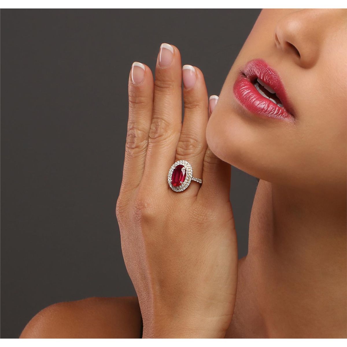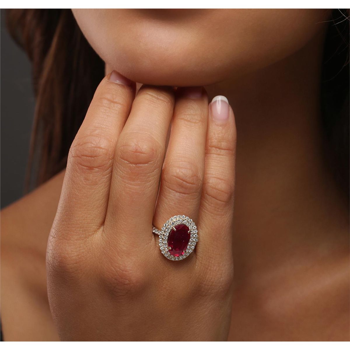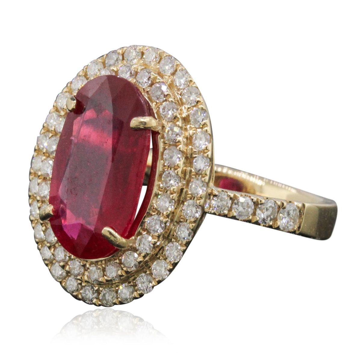 One electronically tested 14KT yellow gold ladies combination cast & assembled ruby and diamond ring with a flat shank with a bright polish finish. Identified with markings of "14K". Condition is new. Containing: One prong set oval modified brilliant cut natural ruby, measuring 13.66 x 8.24 x 3.40mm, approximate weight of 3.26ct., clarity is heavily included, type II, medium dark, moderately strong, strongly purplish red color, (GIA stpR 6/4), cut is good. Sixty-Two prong set round brilliant cut diamonds, measuring 2.00 - 1.30 x 0.99mm (depth est.) approximate total weight of 62 Stones = 0.70ct. Clarity: SI-2 to I-2. Color: I - J, Cut is Good. Colored gemstones are presumed to have been subjected to commonly used enhancement processes. All diamonds and colored gemstones are graded in the mounting, unless otherwise stated. Total Weight of Colored Stones 3.26ct. Total Weight of Diamonds 0.70ct. Total Weight of Ring 6.50 grams. GGL Appraised at $4,795.00. GGL Appraised at $7,280.00.