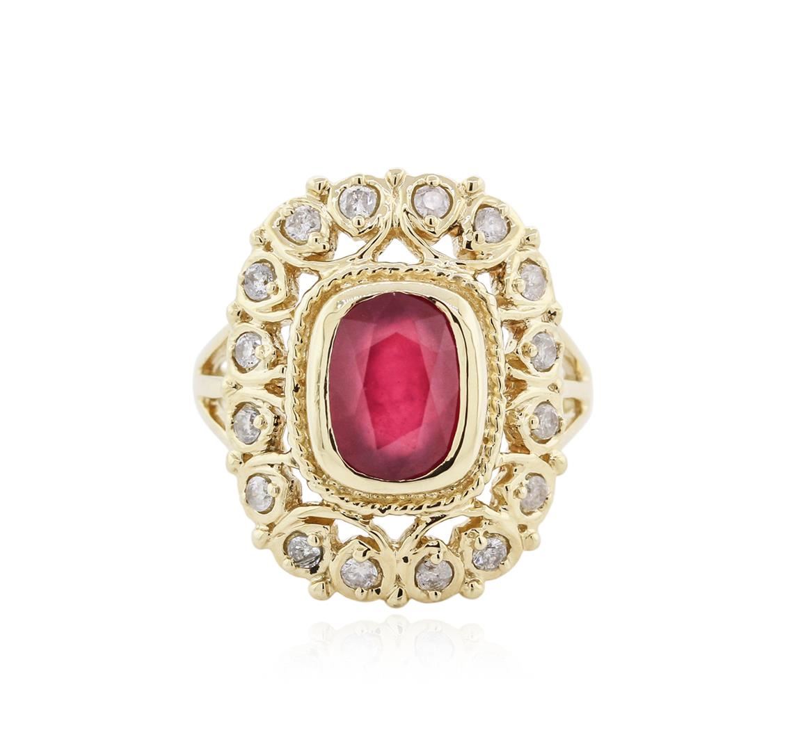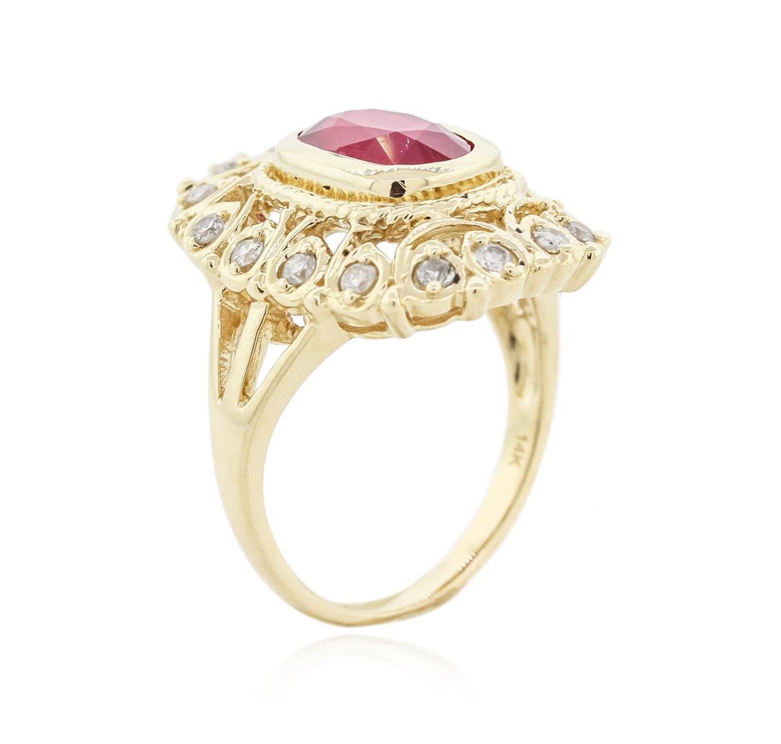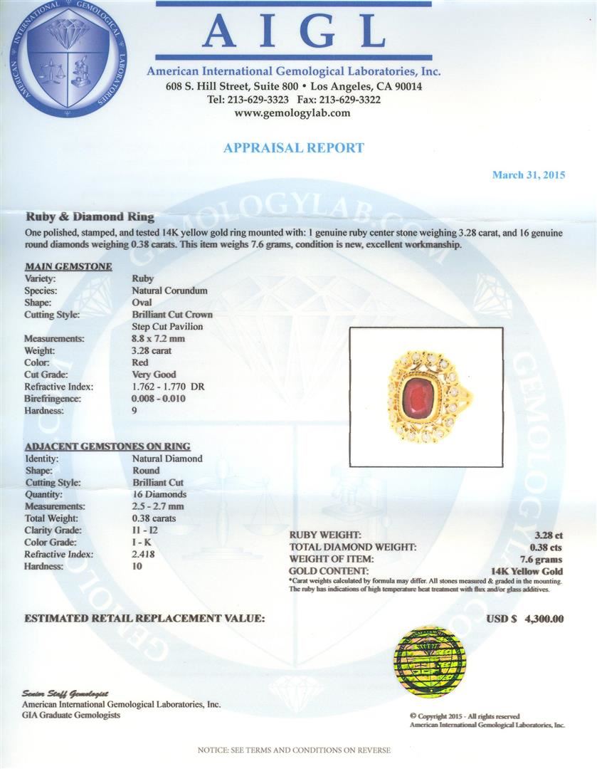 One polished, stamped, and tested 14K yellow gold ring mounted with: 1 genuine ruby center stone weighing 3.28 carat, and 16 genuine round diamonds weighing 0.38 carats. This item weighs 7.6 grams, condition is new, excellent workmanship. MAIN GEMSTONE: Variety: Ruby. Species: Natural Corundum. Shape: Oval. Cutting Style: Brilliant Cut Crown Step Cut Pavilion. Measurements: 8.8 x 7.2 mm. Weight: 3.28 carat. Color: Red. Cut Grade: Very Good. Refractive Index: 1.762 - 1.770 DR. Birefringence: 0.008 - 0.010. Hardness: 9. ADJACENT GEMSTONES ON RING: Identity: Natural Diamond. Shape: Round. Cutting Style: Brilliant Cut. Quantity: 16 Diamonds. Measurements: 2.5 - 2.7 mm. Total Weight: 0.38 carats. Clarity Grade: I1 - I2. Color Grade: I - K. Refractive Index: 2.418. Hardness: 10. Ruby Weight: 3.28 ct. Total Diamond Weight: 0.38 cts. Weight of Item: 7.6 grams. Gold Content: 14K Yellow Gold. AIGL Appraised at $4,300.00.