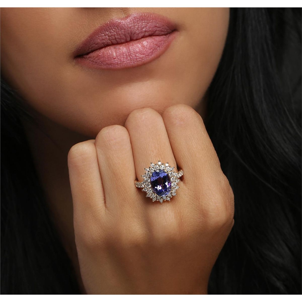 One electronically tested 14KT yellow gold ladies combination cast & assembled ring with a bright polish finish. Identified with markings of "14K". Condition is new. Containing: One prong set oval modified brilliant cut natural tanzanite, measuring 11.40 x 8.00 x 5.20mm, approximate weight of 3.28ct., clarity is eye clean, type I, medium light, moderately strong, bluish violet color, (GIA bV 4/4), cut is good. Forty-Two prong set round brilliant cut diamonds, measuring 2.00 - 1.60 x 1.08mm (depth est.) approximate total weight of 42 Stones = 0.98ct. Clarity: SI-2 to I-1. Color: I - J, Cut is Good. Colored gemstones are presumed to have been subjected to commonly used enhancement processes. All diamonds and colored gemstones are graded in the mounting, unless otherwise stated. Total Weight of Colored Stones 3.28ct. Total Weight of Diamonds 0.98ct. Total Weight of Ring 7.00 grams. GGL Appraised at $8,665.00.