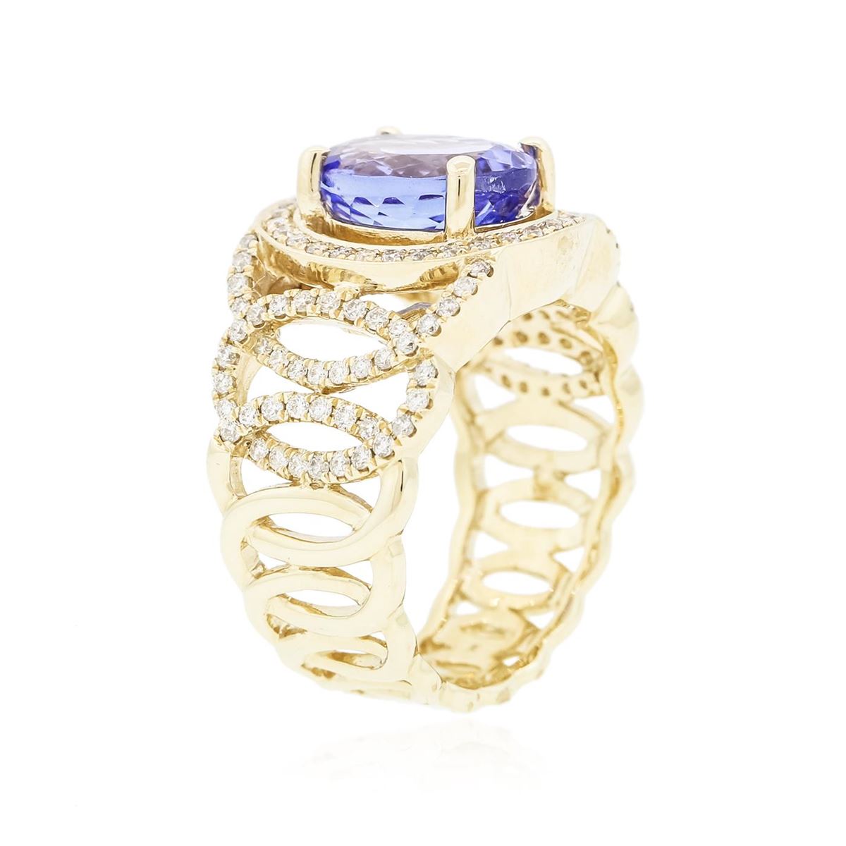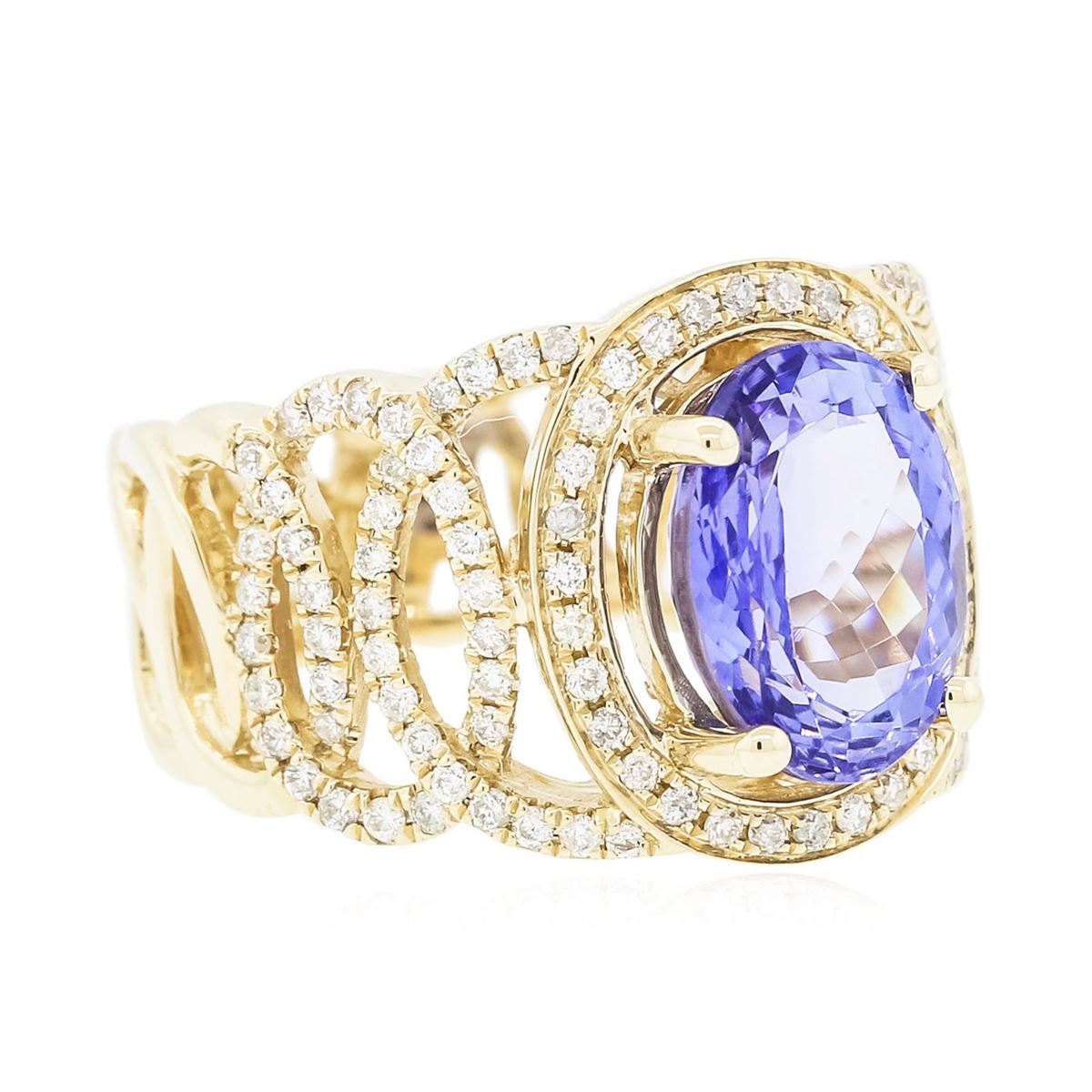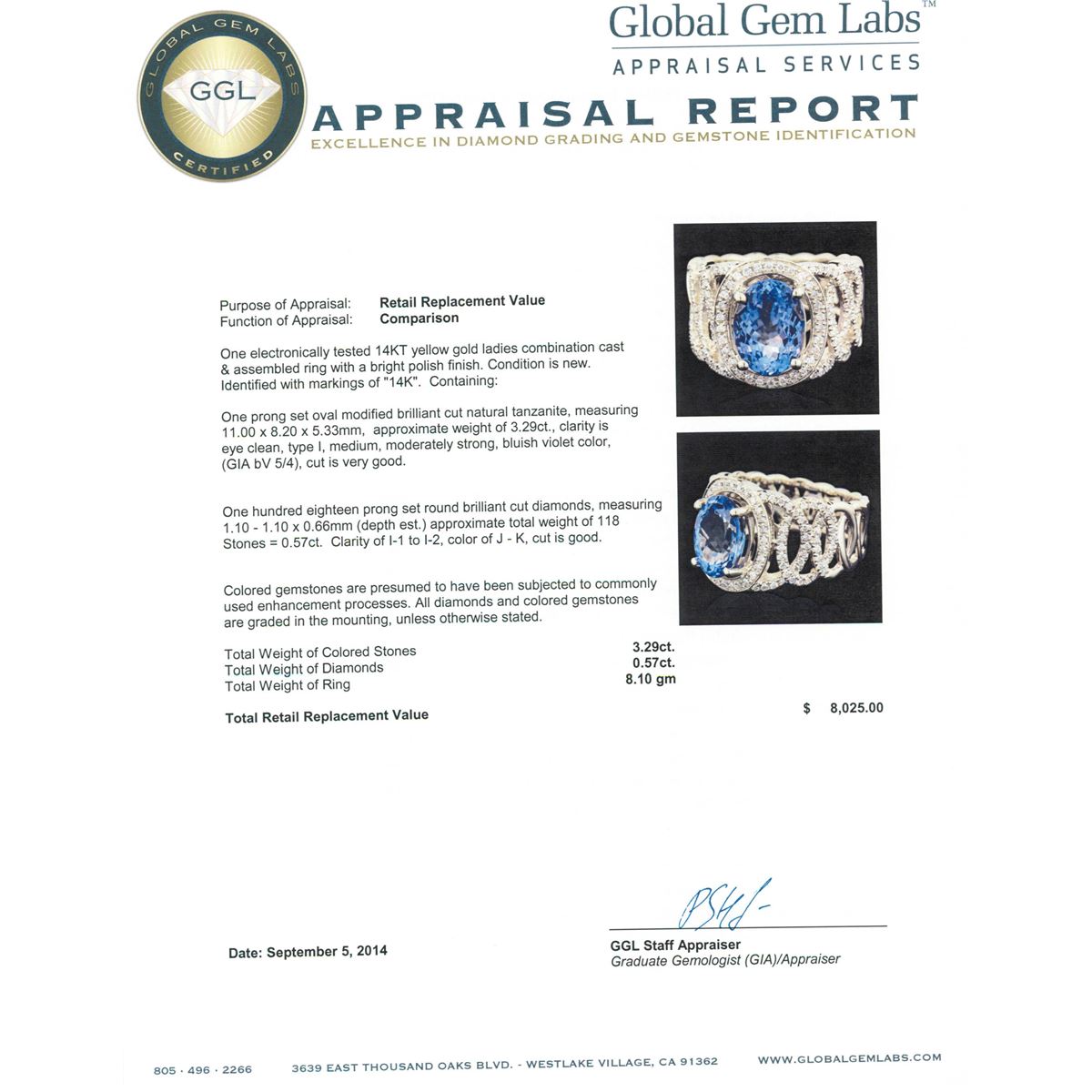 One electronically tested 14KT yellow gold ladies combination cast & assembled ring with a bright polish finish. Identified with markings of "14K". Condition is new. Containing: One prong set oval modified brilliant cut natural tanzanite, measuring 11.00 x 8.20 x 5.33mm, approximate weight of 3.29ct., clarity is eye clean, type I, medium, moderately strong, bluish violet color, (GIA bV 5/4), cut is very good. One Hundred Eighteen prong set round brilliant cut diamonds, measuring 1.10 - 1.10 x 0.66mm (depth est.) approximate total weight of 118 Stones = 0.57ct. Clarity: I-1 to I-2. Color: J - K, Cut is Good. Colored gemstones are presumed to have been subjected to commonly used enhancement processes. All diamonds and colored gemstones are graded in the mounting, unless otherwise stated. Total Weight of Colored Stones 3.29ct. Total Weight of Diamonds 0.57ct. Total Weight of Ring 8.10 grams. GGL Appraised at $8,025.00.