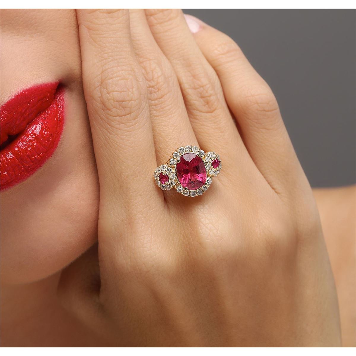 One electronically tested 14KT yellow gold ladies cast rubellite tourmaline, ruby & diamond ring with a bright polish finish. The featured rubellite tourmaline is set within a diamond bezel supported by ruby and diamond bezel set shoulders, completed by a one and one-half millimeter wide band. Identified with markings of "14K". Condition is new, good workmanship. Containing: One prong set oval mixed cut natural rubellite, measuring 10.20 x 7.80 x 6.45mm, approximate weight of 3.30ct., clarity is moderately included, type III, medium dark, moderately strong, slightly purplish red color, (GIA slpR 6/4), cut is good. Transmitting light with a minimum of distortion, transparent. Naturally occurring internal & external characteristics are present. Refractive index testing results of 1.62 to 1.64. This is a conclusive result for tourmaline. Graded in the setting. Two prong set round brilliant cut natural rubies, measuring 3.20 - 3.10 x 2.05 mm, approximate total weight of 0.34ct., clarity is slightly included, type II, medium dark, very slightly brownish, red color, (GIA R 6/3), cut is good. Transmitting light with a minimum of distortion, transparent. Naturally occurring internal & external characteristics are present. Color grade is an average for the pair. Graded in the setting. Thirty prong set round brilliant cut diamonds, measuring 1.80 - 1.70 x 1.05mm (depth est.) approximate total weight of 30 Stones = 0.68ct. Graded in the setting. Clarity: SI-1 to I-1. Color: G - I. Total Weight of Colored Stones 3.64ct. Total Weight of Diamonds 0.68ct. Total Weight of Ring 6.49 grams. AIG Appraised at $5,360.00.