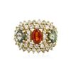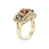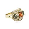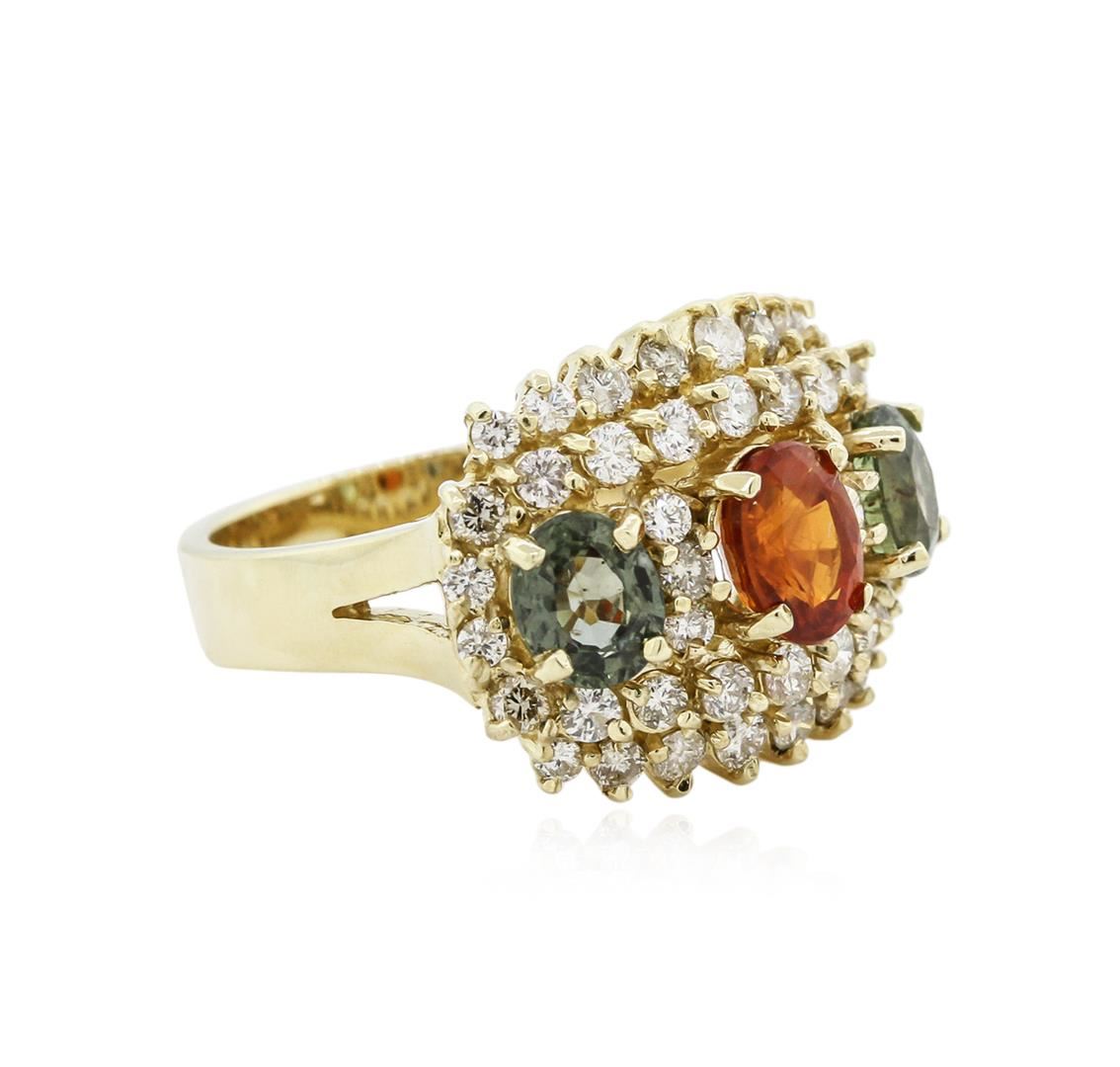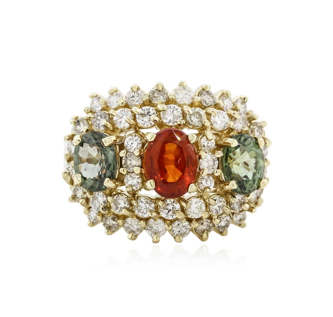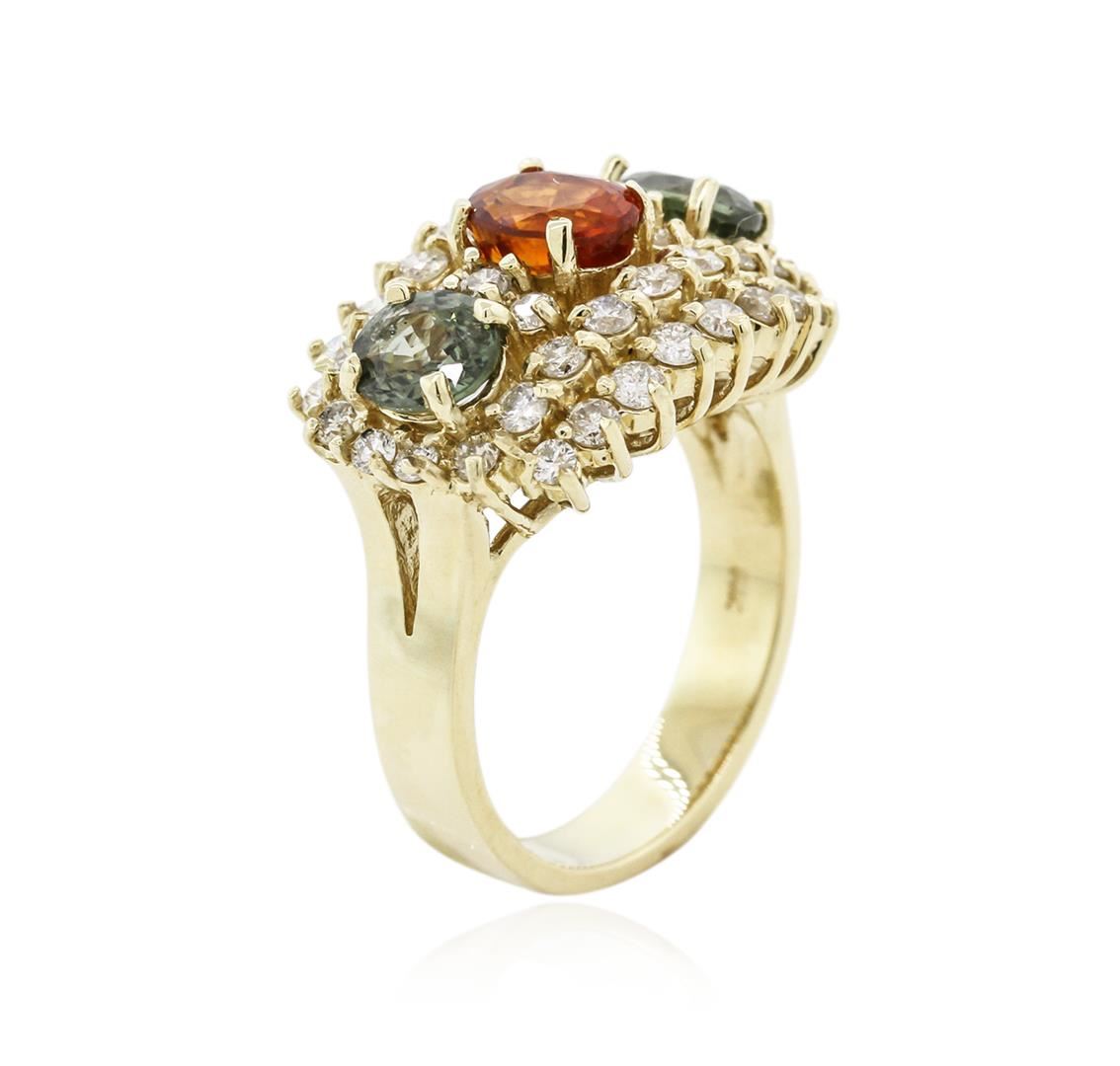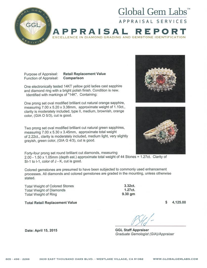 One electronically tested 14KT yellow gold ladies cast sapphire and diamond ring with a bright polish finish. Identified with markings of "14K". Condition is new. Containing: One prong set oval modified brilliant cut natural orange sapphire, measuring 7.00. x 5.20 x 3.38mm, approximate weight of 1.10ct., clarity is moderately included, type II, medium, brownish, orange color, (GIA O 5/3), cut is good. Two prong set oval modified brilliant cut natural green sapphires, measuring 7.00. x 5.30 x 3.45mm, approximate total weight of 2.22ct., clarity is moderately included, medium light, very slightly grayish, green color, (GIA G 4/3), cut is good. Forty-Four prong set round brilliant cut diamonds, measuring 2.00. - 1.50 x 1.05mm (depth est.) approximate total weight of 44 Stones = 1.27ct. Clarity: SI-1 to I-1. Color: J - K, Cut is Good. Colored gemstones are presumed to have been subjected to commonly used enhancement processes. All diamonds and colored gemstones are graded in the mounting, unless otherwise stated. Total Weight of Colored Stones 3.32ct. Total Weight of Diamonds 1.27ct. Total Weight of Ring 9.30 grams. GGL Appraised at $4,125.00.