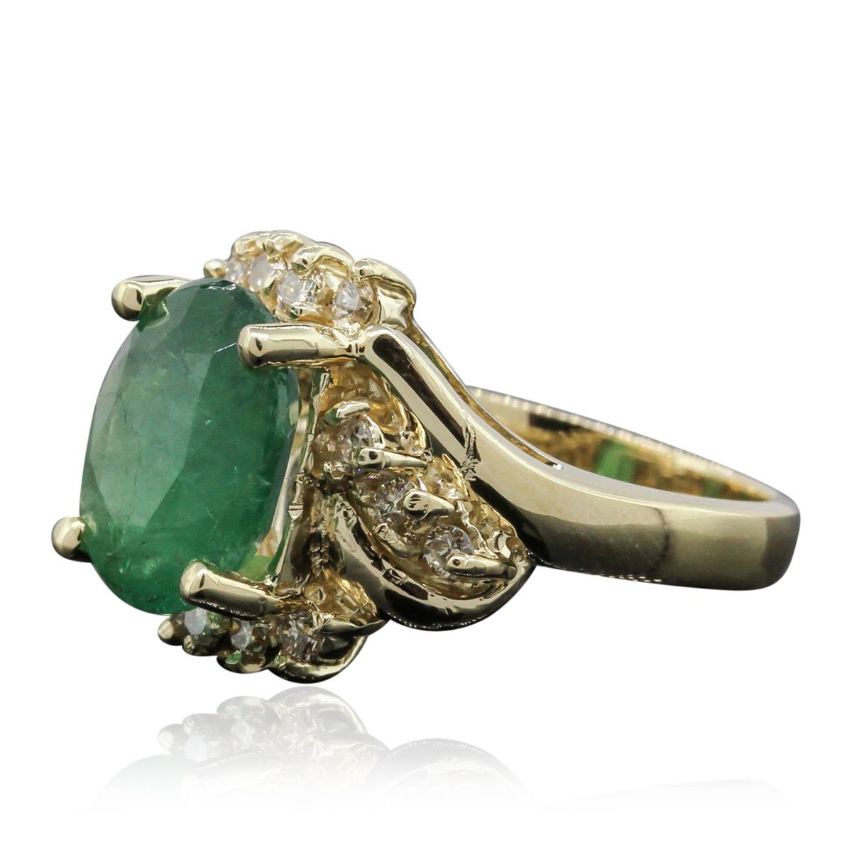 One electronically tested 14KT yellow gold Ladies combination cast & assembled fancy ring with a high polish finish. Condition is new. Identified with markings of "14K". Containing: One prong set oval modified brilliant cut natural emerald, measuring 11.50 x 9.20 x 5.70mm, approximate weight of 3.32ct., clarity is heavily included, type III, medium light, very slightly grayish, green color, (GIA G 4/3), cut is good. Colored gemstones are presumed to have been subjected to commonly used and possible undetectable color/clarity enhancement processes. Fourteen prong set round brilliant cut diamonds, measuring 1.80 - 1.80 x 1.19mm (depth est.) approximate total weight of 14 Stones = 0.33ct. Clarity of SI-2 to I-1, Color of L - M, Cut is Good. Total Weight of Colored Stones 3.32ct. Total Weight of Diamonds 0.33ct. Total Weight of Ring 7.00 grams. GGL Appraised at $9,395.00.