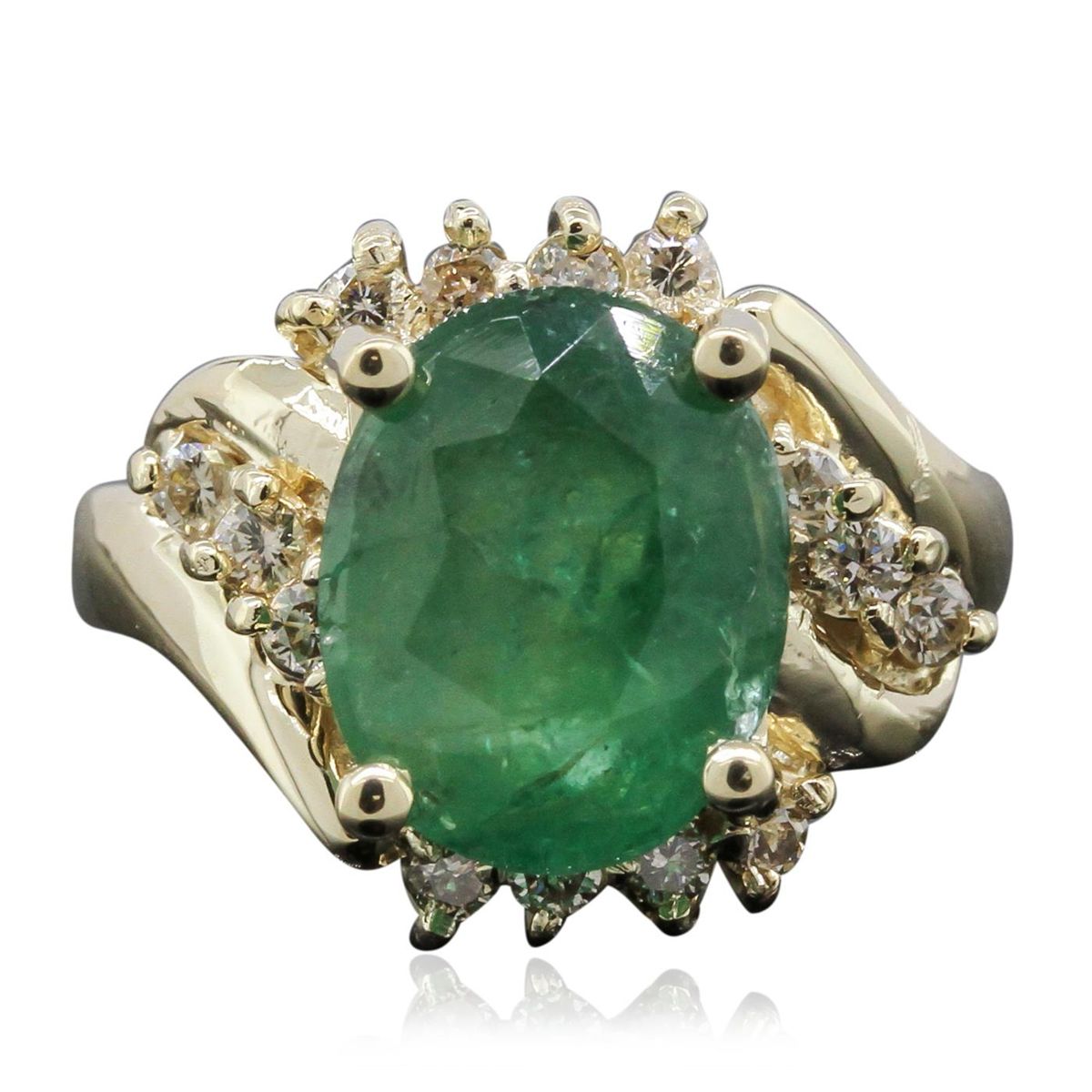 One electronically tested 14KT yellow gold Ladies combination cast & assembled fancy ring with a high polish finish. Condition is new. Identified with markings of "14K". Containing: One prong set oval modified brilliant cut natural emerald, measuring 11.50 x 9.20 x 5.70mm, approximate weight of 3.32ct., clarity is heavily included, type III, medium light, very slightly grayish, green color, (GIA G 4/3), cut is good. Colored gemstones are presumed to have been subjected to commonly used and possible undetectable color/clarity enhancement processes. Fourteen prong set round brilliant cut diamonds, measuring 1.80 - 1.80 x 1.19mm (depth est.) approximate total weight of 14 Stones = 0.33ct. Clarity of SI-2 to I-1, Color of L - M, Cut is Good. Total Weight of Colored Stones 3.32ct. Total Weight of Diamonds 0.33ct. Total Weight of Ring 7.00 grams. GGL Appraised at $9,395.00.