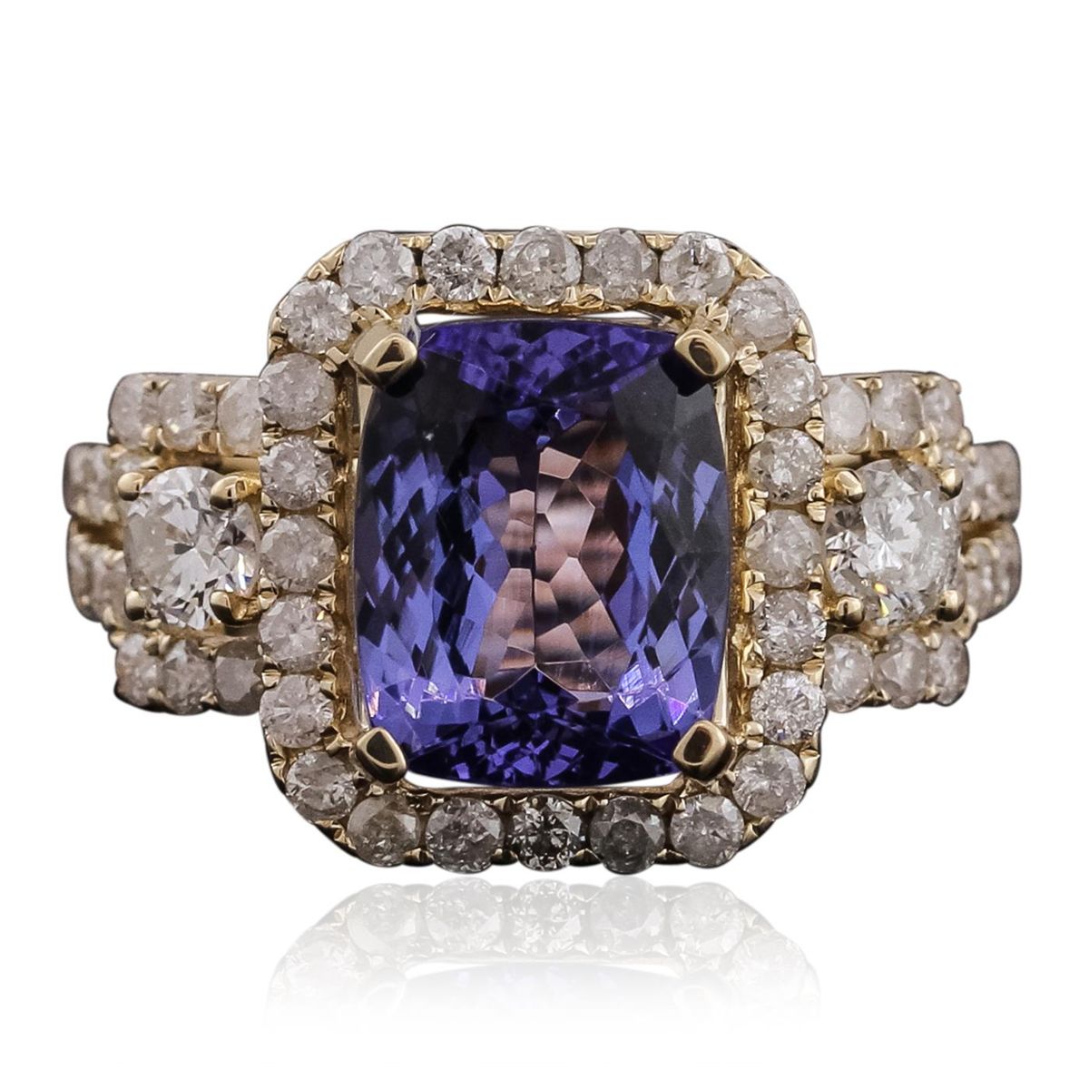 One electronically tested 14KT yellow gold ladies cast tanzanite & diamond ring with a bright finish. The featured tanzanite is set within a diamond bezel, supported by tapering diamond set shoulders, completed by a two millimeter wide band. Trademark is Orianne. Identified with markings of "14K". Condition is new, good workmanship. Containing: One prong set rectangular cushion mixed cut natural tanzanite, measuring 10.00 x 8.00 x 4.88mm, 8% bulge factor, approximate weight of 3.32ct., clarity is eye clean, type I, medium dark, very slightly grayish, bluish violet color, (GIA bV 6/3), cut is good. Transmitting light with no distortion, transparent. Graded in the setting. Tanzanite is a very rare gemstone that is only found in the country of Tanzania. Originally discovered in 1967. Tiffany & Company, named the stone Tanzanite. It is found in the Usumburu Mountains that border the Umba Valley of northern Tanzania. Tanzanite occurs in gray, brown, violet, blue, reddish-purple, & green. The gem is interesting because of its exceptional pleochroism. Rotated in different directions a tanzanite will exhibit multiple changes of color. Tanzanite has a low tolerance to ultrasonic cleaning, and should not be cleaned using this method. Two prong set round brilliant cut diamonds, measuring 3.70 - 3.60 x 2.19mm (depth est.) approximate total weight of 2 Stones = 0.36ct. Graded in the setting. Clarity: I-1 to I-2. Color: H - I Fifty-Six prong set round brilliant cut diamonds, measuring 1.70 - 1.60 x 1.02mm (depth est.) approximate total weight of 56 Stones = 0.94ct. Graded in the setting. Clarity: I-1 to I-3. Color: H - I. Total Weight of Colored Stones 3.32ct. Total Weight of Diamonds 1.30ct. Total Weight of Ring 5.31 grams. AIG Appraised at $11,400.00.