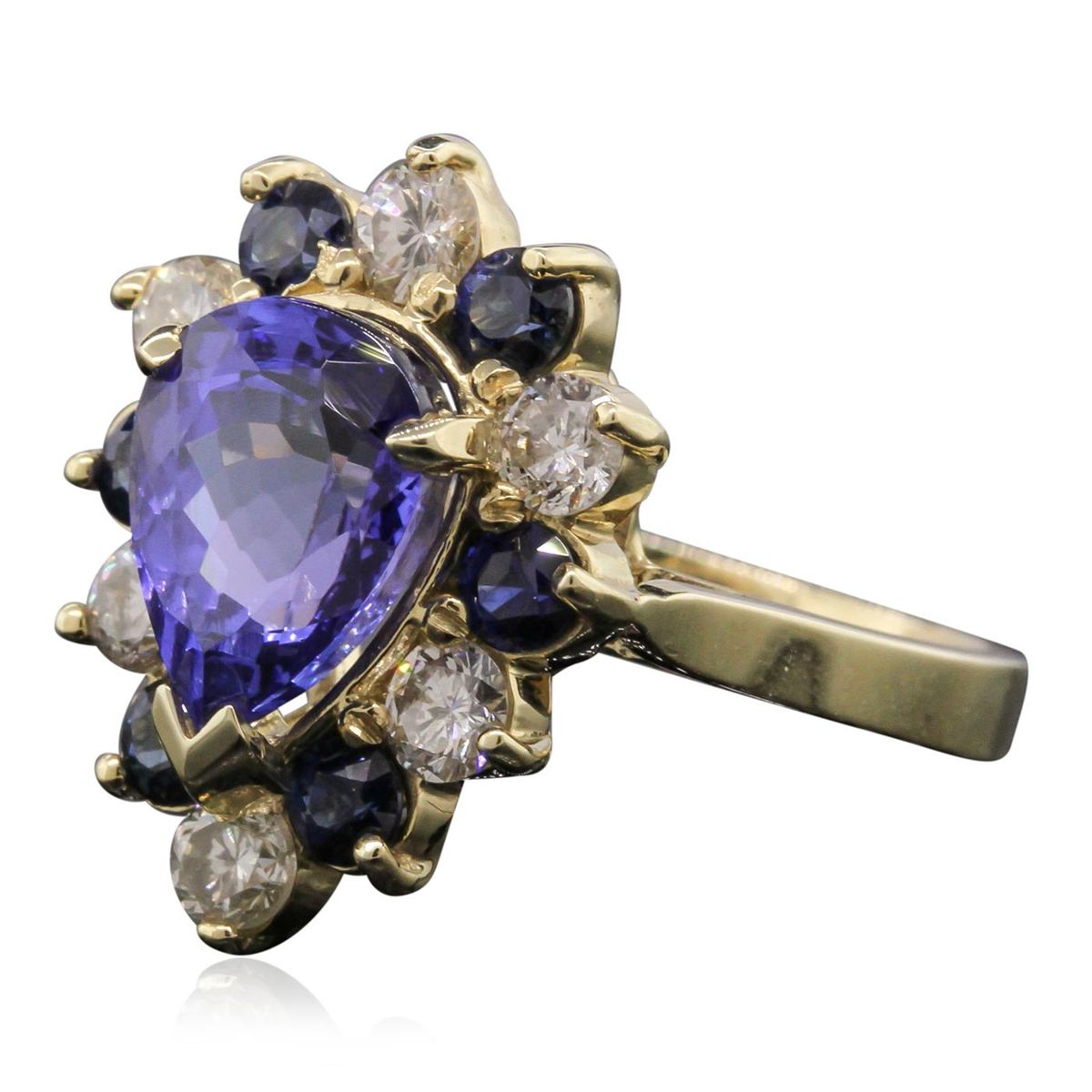 One electronically tested 14KT yellow gold Ladies combination cast & assembled ring with a bright polish finish. Identified with markings of "K14". Condition is new. Containing: One prong set pear modified mixed cut natural tanzanite, measuring 11.00 x 8.00 x 5.70mm, approximate weight of 3.36ct., clarity is eye clean, type I, medium, moderately strong, bluish violet color, (GIA bV 5/4), cut is good. Colored gemstones are presumed to have been subjected to commonly used color/clarity enhancement processes. Six prong set round brilliant cut diamonds, measuring 3.00 - 3.00 x 1.80mm (depth est.) approximate. Total Weight of 6 Stones = 0.59ct. Clarity: SI-2 to I-1. Color: L - M, Cut is Good. Six prong set round modified mixed cut natural blue sapphires, measuring 3.00 - 3.00 x 1.95 mm, approximate. Total Weight of 0.84ct., clarity is slightly included, type II, medium dark, moderately strong, blue color, (GIA B 6/4), cut is very good. Colored gemstones are presumed to have been subjected to commonly used color/clarity enhancement processes. Total Weight of Colored Stones 4.20ct. Total Weight of Diamonds 0.59ct. Total Weight of Ring 6.50 grams. GGL Appraised at $8,850.00.