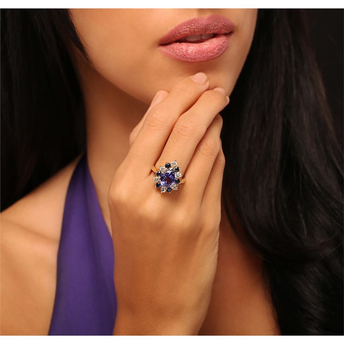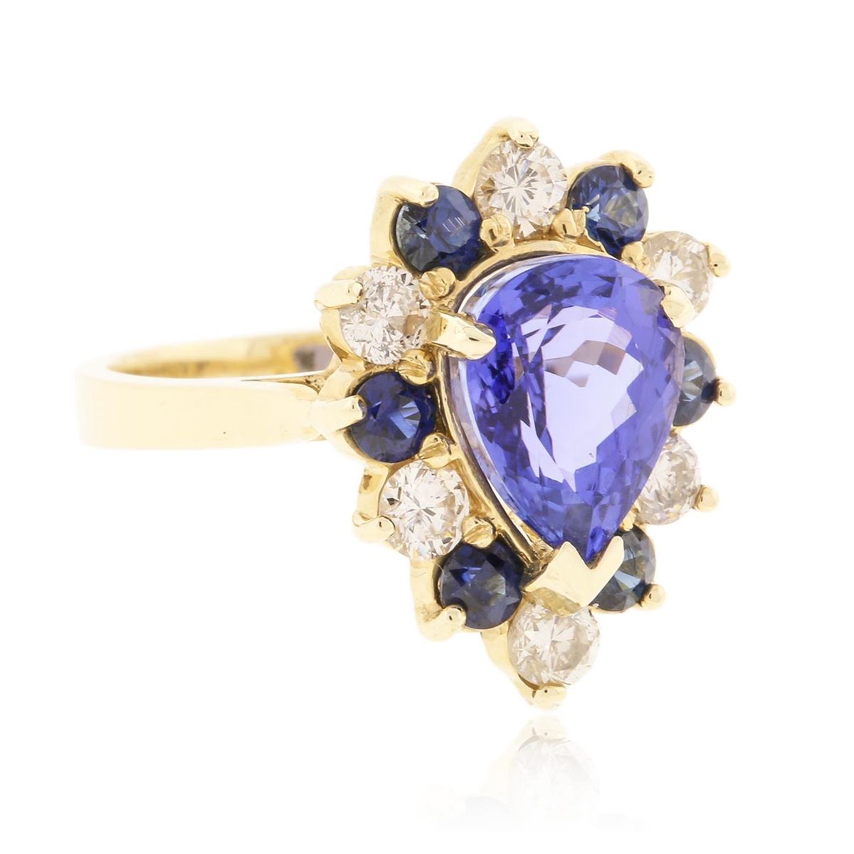 One electronically tested 14KT yellow gold Ladies combination cast & assembled ring with a bright polish finish. Identified with markings of "K14". Condition is new. Containing: One prong set pear modified mixed cut natural tanzanite, measuring 11.00 x 8.00 x 5.70mm, approximate weight of 3.36ct., clarity is eye clean, type I, medium, moderately strong, bluish violet color, (GIA bV 5/4), cut is good. Colored gemstones are presumed to have been subjected to commonly used color/clarity enhancement processes. Six prong set round brilliant cut diamonds, measuring 3.00 - 3.00 x 1.80mm (depth est.) approximate. Total Weight of 6 Stones = 0.59ct. Clarity: SI-2 to I-1. Color: L - M, Cut is Good. Six prong set round modified mixed cut natural blue sapphires, measuring 3.00 - 3.00 x 1.95 mm, approximate. Total Weight of 0.84ct., clarity is slightly included, type II, medium dark, moderately strong, blue color, (GIA B 6/4), cut is very good. Colored gemstones are presumed to have been subjected to commonly used color/clarity enhancement processes. Total Weight of Colored Stones 4.20ct. Total Weight of Diamonds 0.59ct. Total Weight of Ring 6.50 grams. GGL Appraised at $8,850.00.