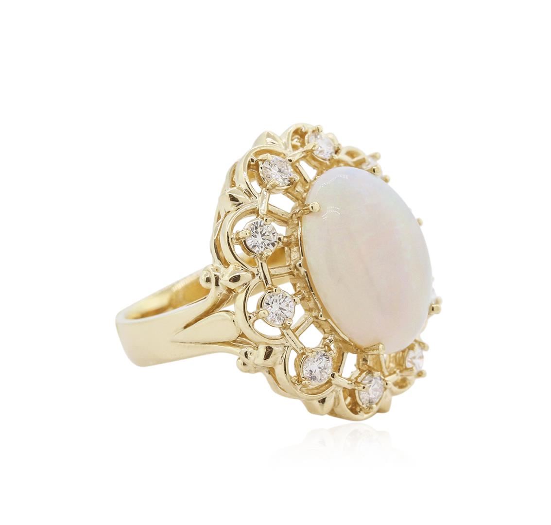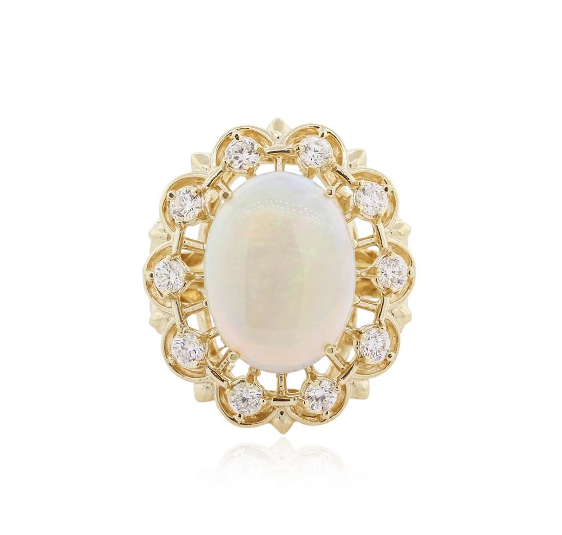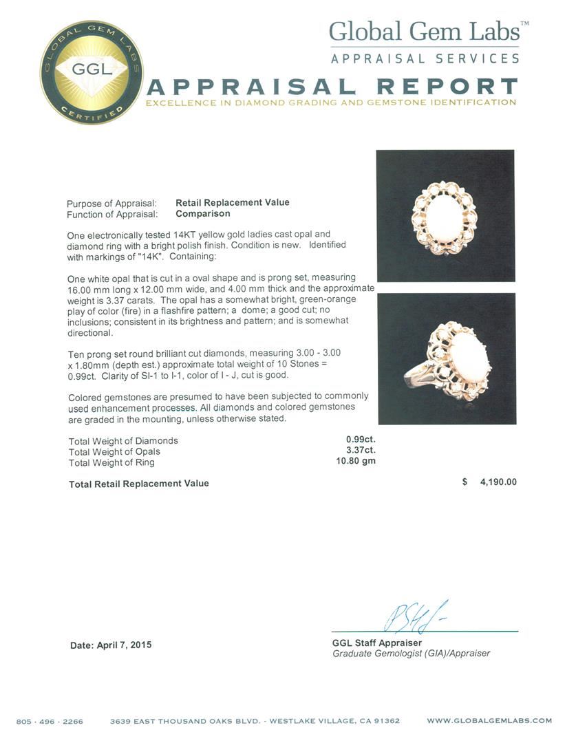 One electronically tested 14KT yellow gold ladies cast opal and diamond ring with a bright polish finish. Identified with markings of "14K". Condition is new. Containing: One white opal that is cut in a oval shape and is prong set, measuring 16.00. mm long x 12.00. mm wide, and 4.00. mm thick and the approximate weight is 3.37 carats. The opal has a somewhat bright, green-orange play of color (fire) in a flashfire pattern; a dome; a good cut; no inclusions; consistent in its brightness and pattern; and is somewhat directional. Ten prong set round brilliant cut diamonds, measuring 3.00. - 3.00. x 1.80mm (depth est.) approximate total weight of 10 Stones = 0.99ct. Clarity: SI-1 to I-1. Color: I - J, Cut is Good. Colored gemstones are presumed to have been subjected to commonly used enhancement processes. All diamonds and colored gemstones are graded in the mounting, unless otherwise stated. Total Weight of Diamonds 0.99ct. Total Weight of Opals 3.37ct. Total Weight of Ring 10.80 grams. GGL Appraised at $4,190.00.