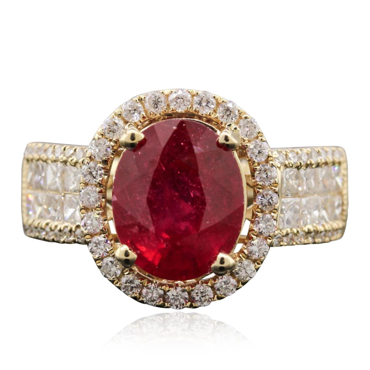 One electronically tested 14KT yellow gold Ladies combination cast & assembled ring with a bright polish finish. Condition is new. Identified with markings of "14K". Containing: One prong set oval modified brilliant cut natural ruby, measuring 10.00 x 8.00 x 5.20mm, approximate weight of 3.37ct., clarity is heavily included, type II, medium dark, moderately strong, strongly purplish red color, (GIA stpR 6/4), cut is good. Fifty-Six prong set round brilliant cut diamonds, measuring 1.30 - 1.00 x 0.69mm (depth est.) approximate total weight of 56 Stones = 0.31ct. Clarity: I-1 to I-2. Color: I - J, Cut is Good. Colored gemstones are presumed to have been subjected to commonly used enhancement processes. All diamonds and colored gemstones are graded in the mounting, unless otherwise stated. Sixteen invisible set princess cut diamonds, measuring 2.00 x 2.00 x 1.50mm (depth est.) approximate total weight of 16 Stones = 0.79ct. Clarity: I-1 to I-2. Color: I - J, Cut is Good. Total Weight of Colored Stones 3.37ct. Total Weight of Diamonds 1.10ct. Total Weight of Ring 6.10 grams. GGL Appraised at $5,430.00.