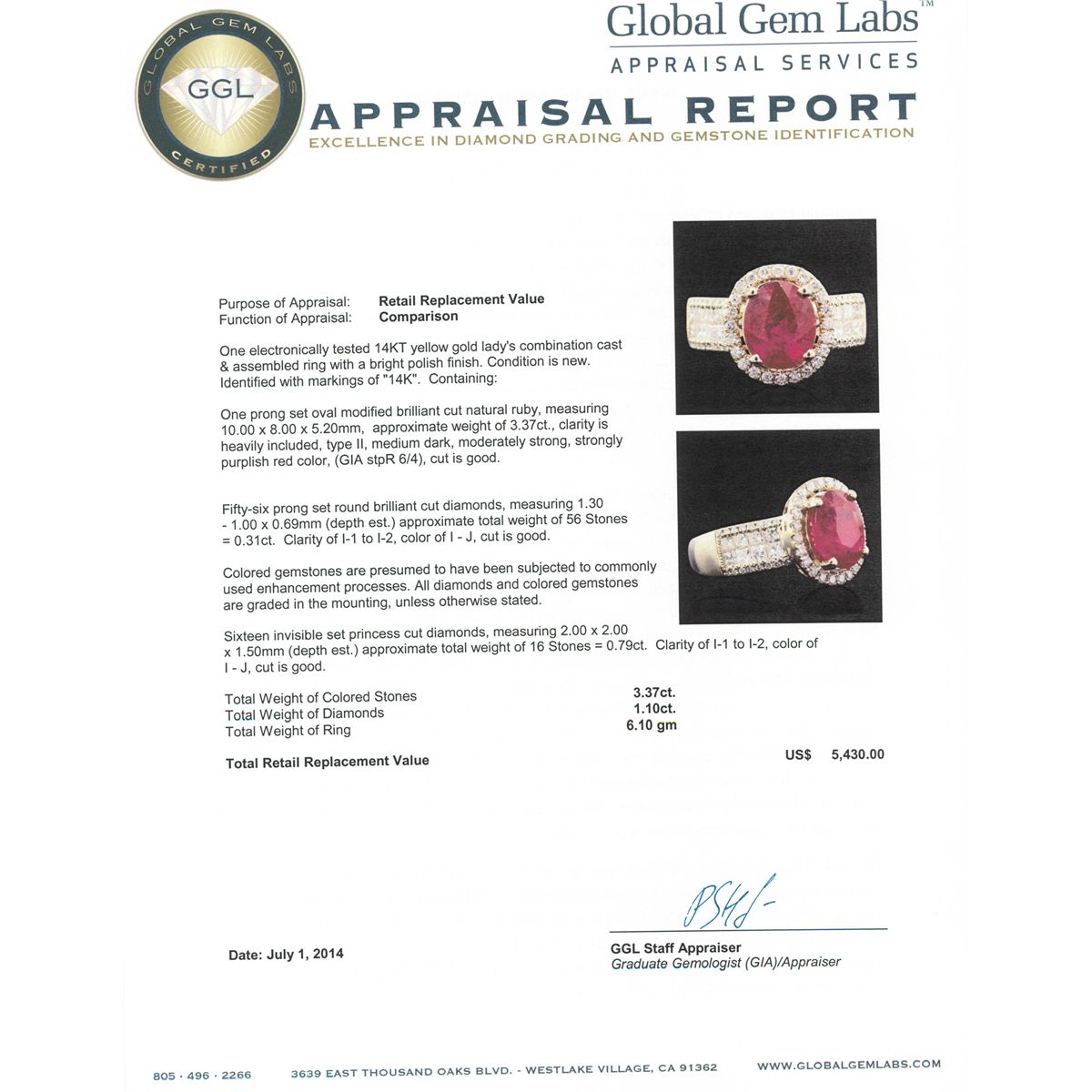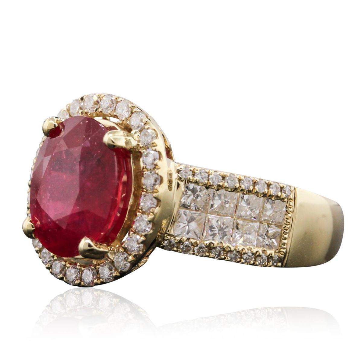 One electronically tested 14KT yellow gold Ladies combination cast & assembled ring with a bright polish finish. Condition is new. Identified with markings of "14K". Containing: One prong set oval modified brilliant cut natural ruby, measuring 10.00 x 8.00 x 5.20mm, approximate weight of 3.37ct., clarity is heavily included, type II, medium dark, moderately strong, strongly purplish red color, (GIA stpR 6/4), cut is good. Fifty-Six prong set round brilliant cut diamonds, measuring 1.30 - 1.00 x 0.69mm (depth est.) approximate total weight of 56 Stones = 0.31ct. Clarity: I-1 to I-2. Color: I - J, Cut is Good. Colored gemstones are presumed to have been subjected to commonly used enhancement processes. All diamonds and colored gemstones are graded in the mounting, unless otherwise stated. Sixteen invisible set princess cut diamonds, measuring 2.00 x 2.00 x 1.50mm (depth est.) approximate total weight of 16 Stones = 0.79ct. Clarity: I-1 to I-2. Color: I - J, Cut is Good. Total Weight of Colored Stones 3.37ct. Total Weight of Diamonds 1.10ct. Total Weight of Ring 6.10 grams. GGL Appraised at $5,430.00.