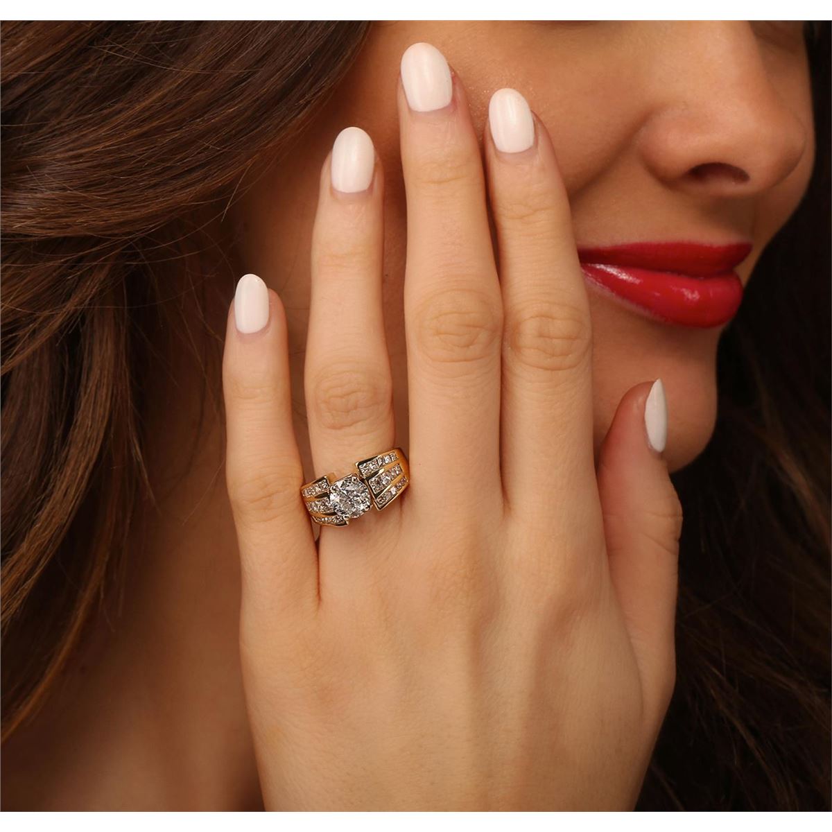 One electronically tested 14KT yellow gold ladies cast diamond ring with a bright polish finish. Condition is new, good workmanship. The featured diamond is supported by diamond set shoulders and completed by a three millimeter wide band. Identified with markings of "14K". Containing: One prong set round brilliant cut diamond, measuring 7.50 - 7.50 x 4.50mm (depth est.) approximate weight of 1.64ct. Graded in the setting. Clarity: I-2. Color: 60.0%. Table 56.0%. Twenty-Two channel set princess cut diamonds, measuring 2.20 x 1.90 x 1.43mm (depth est.) approximate. Total Weight of 22 Stones = 1.08ct. Graded in the setting. Clarity: VS-2 to SI-2. Color: H - J Six channel set princess cut diamonds, measuring 3.10 x 2.40 x 1.80mm (depth est.) approximate. Total Weight of 6 Stones = 0.66ct. Measurements are an average for the group. Graded in the setting. Clarity: VS-2 to SI-2. Color: H - J. Total Weight of Diamonds 3.38ct. Total Weight of Ring 9.60 grams. AIG Appraised at $25,085.00.