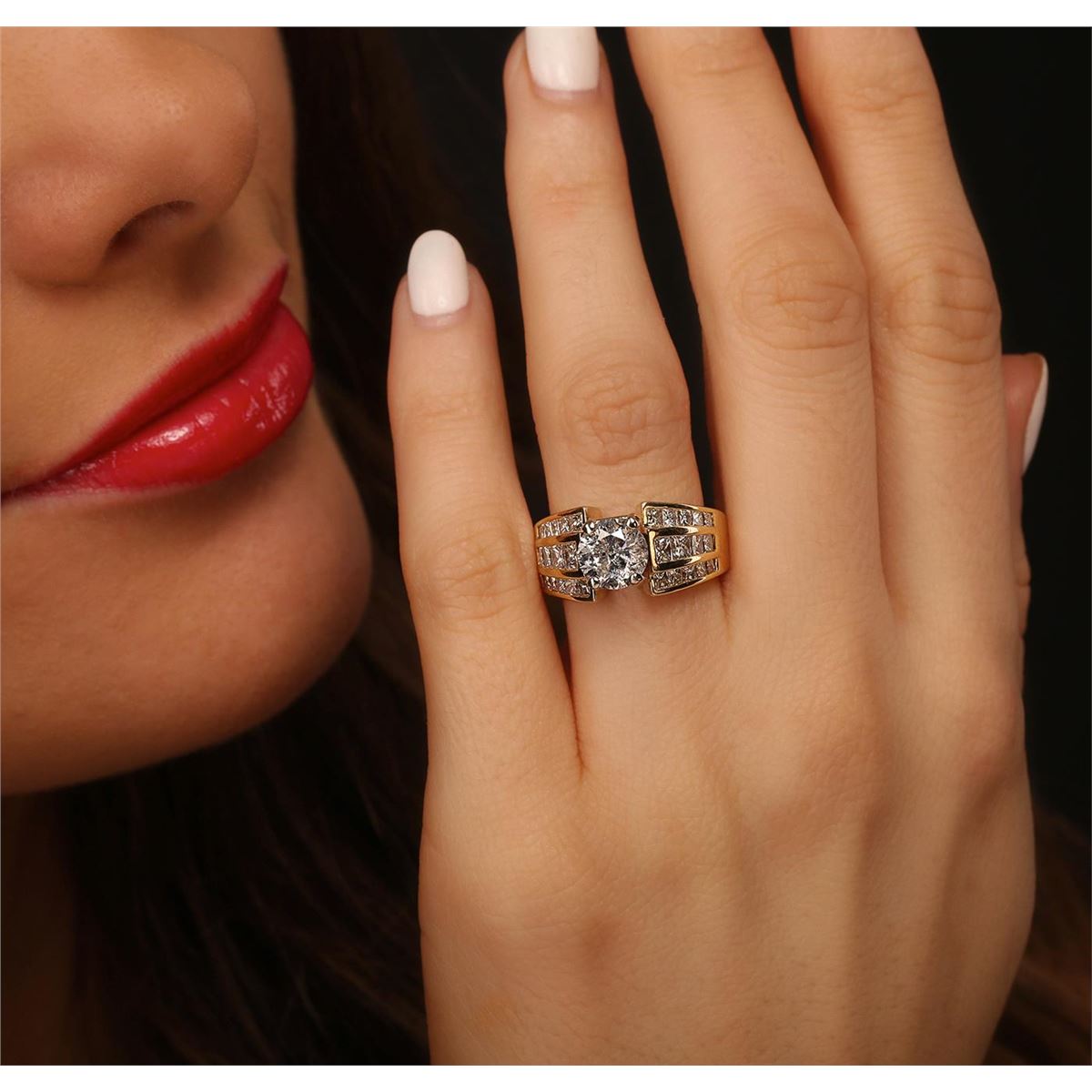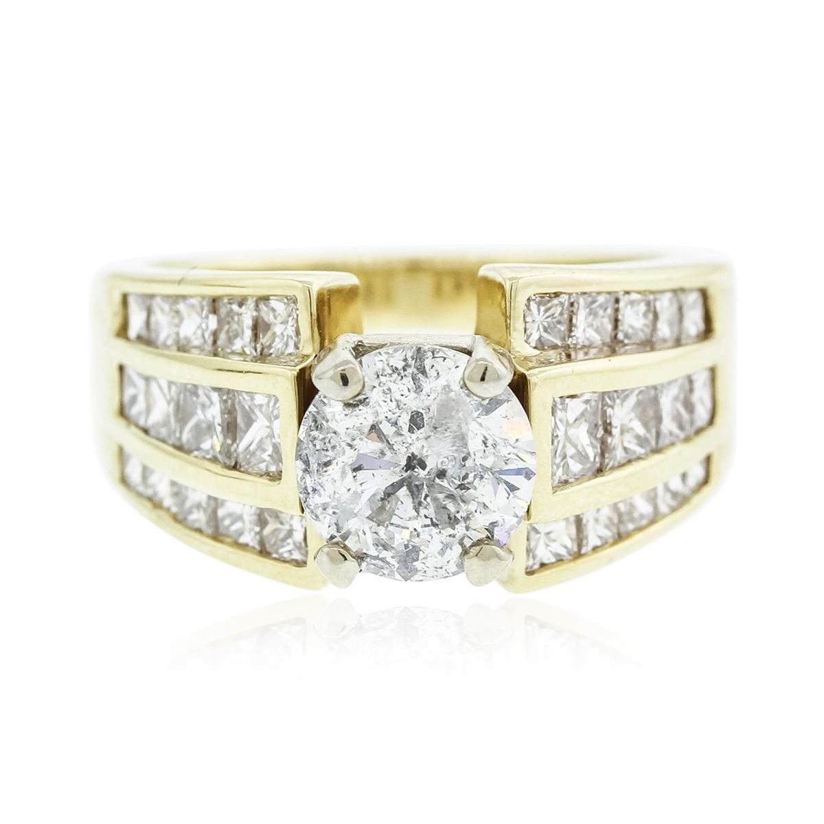 One electronically tested 14KT yellow gold ladies cast diamond ring with a bright polish finish. Condition is new, good workmanship. The featured diamond is supported by diamond set shoulders and completed by a three millimeter wide band. Identified with markings of "14K". Containing: One prong set round brilliant cut diamond, measuring 7.50 - 7.50 x 4.50mm (depth est.) approximate weight of 1.64ct. Graded in the setting. Clarity: I-2. Color: 60.0%. Table 56.0%. Twenty-Two channel set princess cut diamonds, measuring 2.20 x 1.90 x 1.43mm (depth est.) approximate. Total Weight of 22 Stones = 1.08ct. Graded in the setting. Clarity: VS-2 to SI-2. Color: H - J Six channel set princess cut diamonds, measuring 3.10 x 2.40 x 1.80mm (depth est.) approximate. Total Weight of 6 Stones = 0.66ct. Measurements are an average for the group. Graded in the setting. Clarity: VS-2 to SI-2. Color: H - J. Total Weight of Diamonds 3.38ct. Total Weight of Ring 9.60 grams. AIG Appraised at $25,085.00.