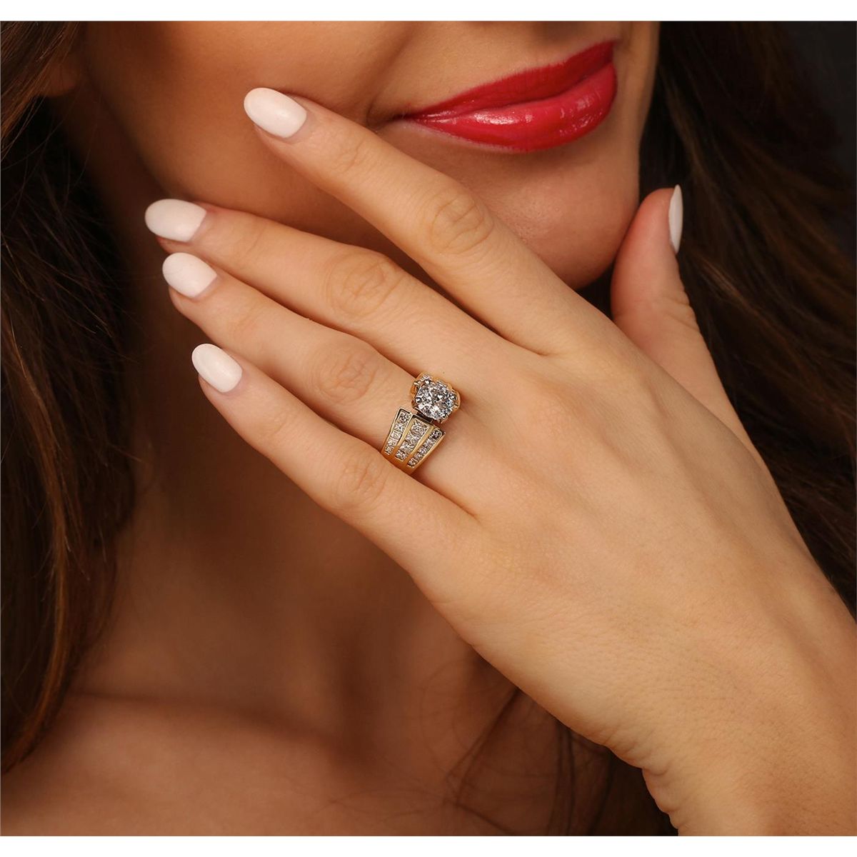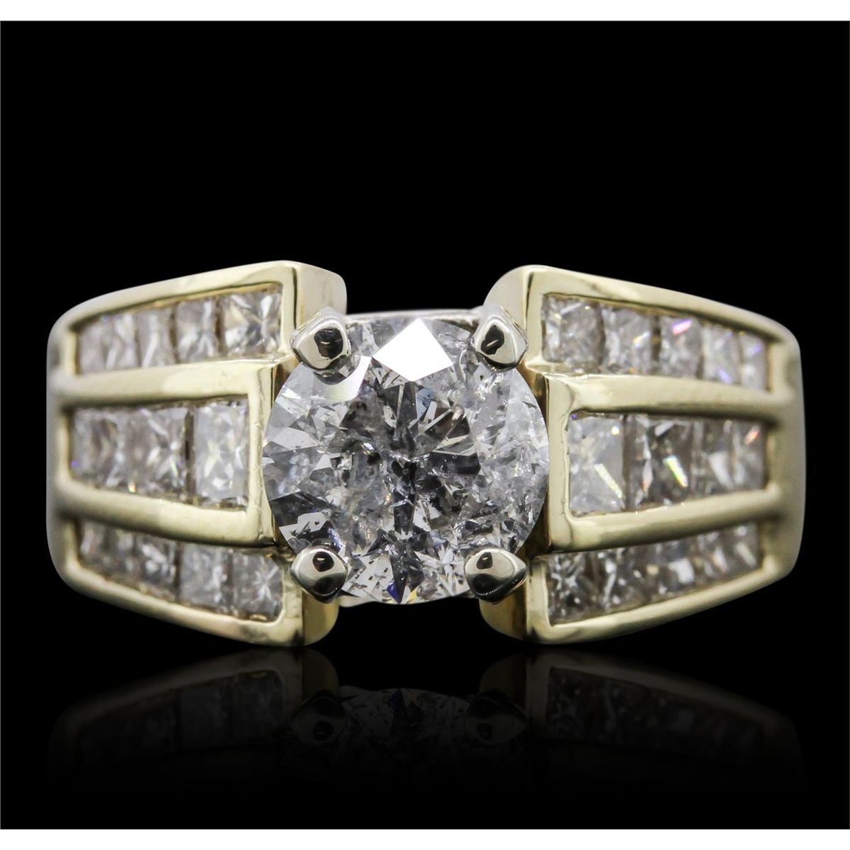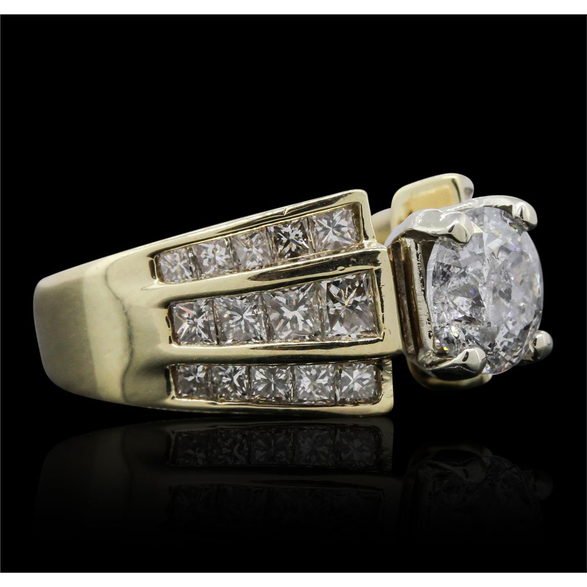 One electronically tested 14KT yellow gold ladies cast diamond ring with a bright polish finish. Condition is new, good workmanship. The featured diamond is supported by diamond set shoulders and completed by a three millimeter wide band. Identified with markings of "14K". Containing: One prong set round brilliant cut diamond, measuring 7.50 - 7.50 x 4.50mm (depth est.) approximate weight of 1.64ct. Graded in the setting. Clarity: I-2. Color: 60.0%. Table 56.0%. Twenty-Two channel set princess cut diamonds, measuring 2.20 x 1.90 x 1.43mm (depth est.) approximate. Total Weight of 22 Stones = 1.08ct. Graded in the setting. Clarity: VS-2 to SI-2. Color: H - J Six channel set princess cut diamonds, measuring 3.10 x 2.40 x 1.80mm (depth est.) approximate. Total Weight of 6 Stones = 0.66ct. Measurements are an average for the group. Graded in the setting. Clarity: VS-2 to SI-2. Color: H - J. Total Weight of Diamonds 3.38ct. Total Weight of Ring 9.60 grams. AIG Appraised at $25,085.00.