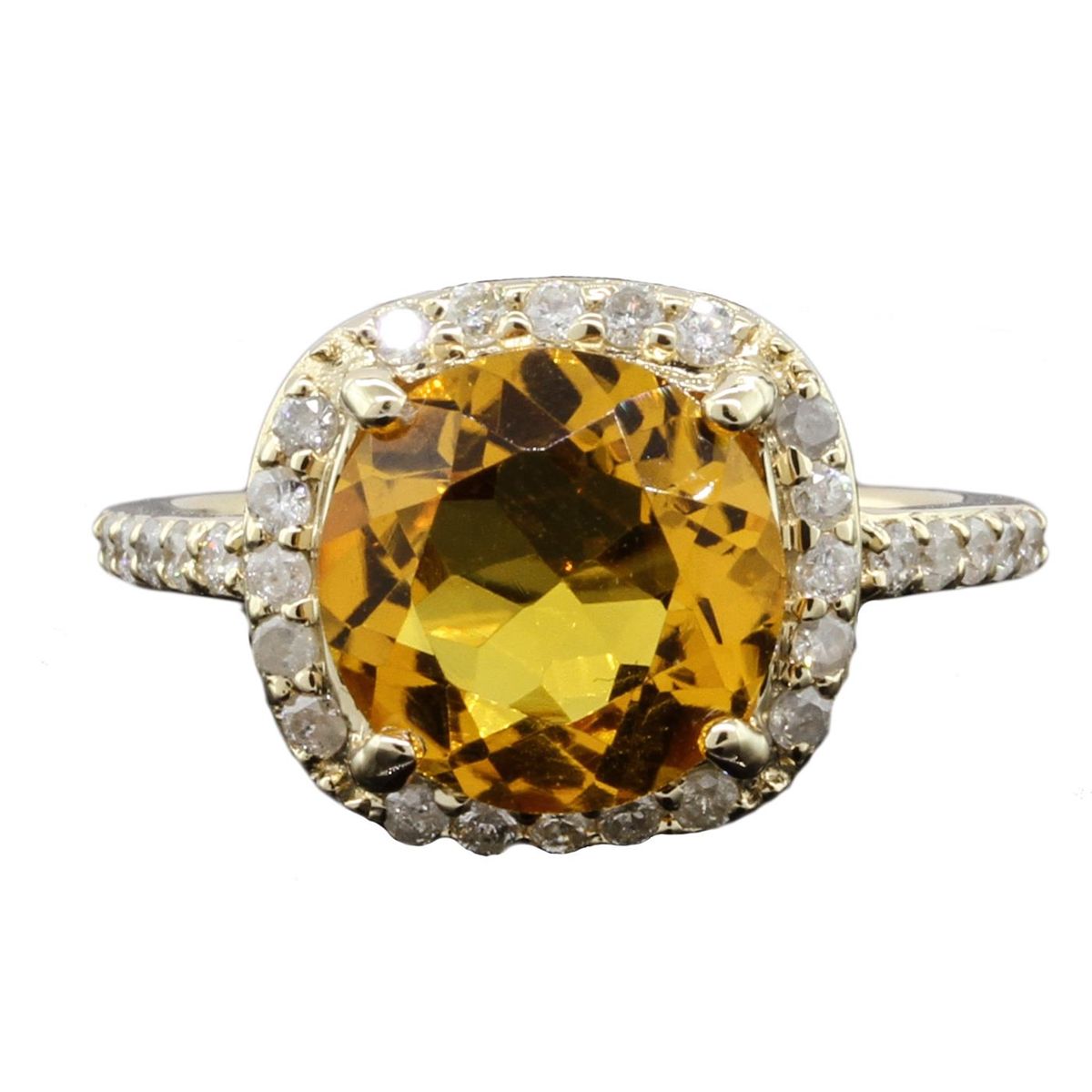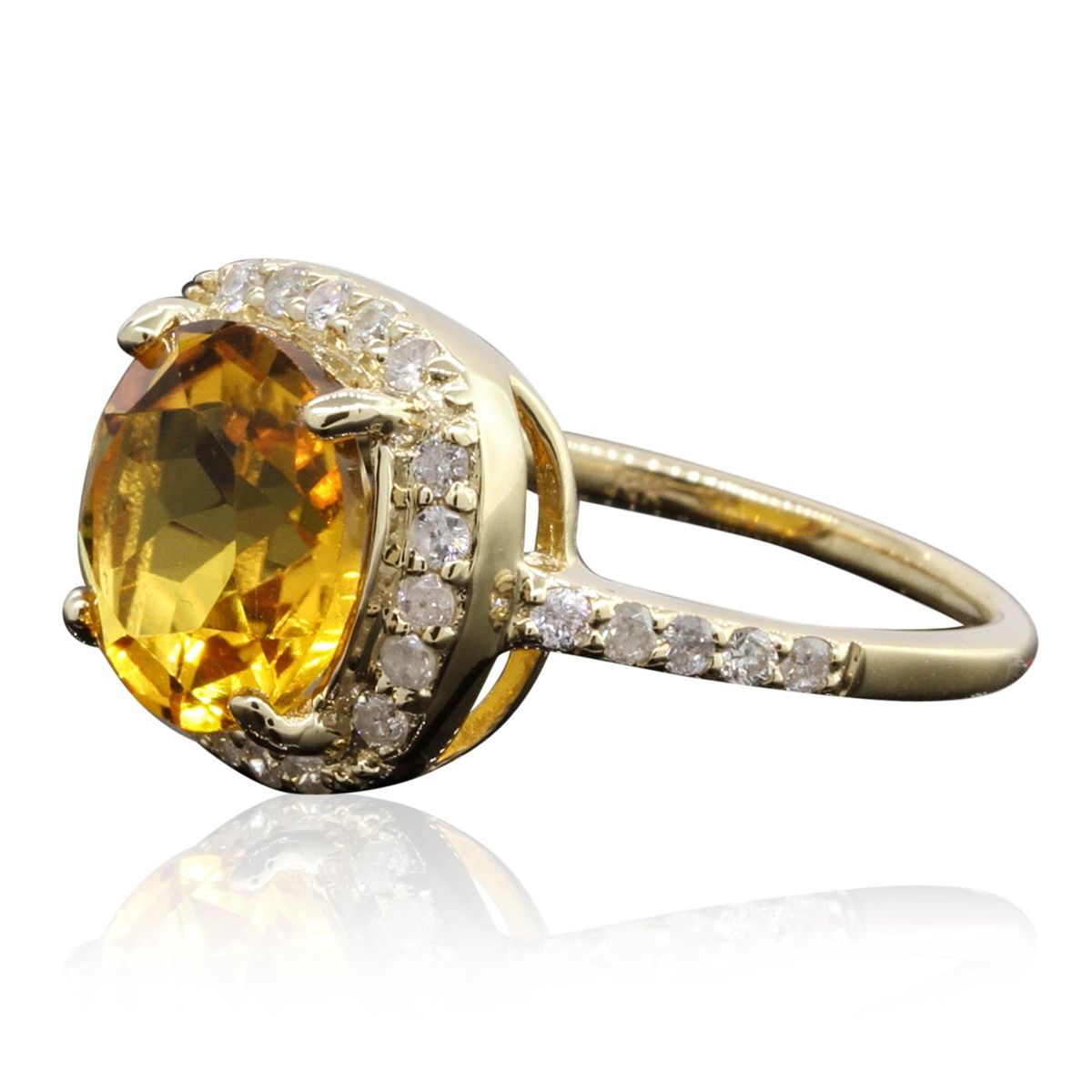 One electronically tested 14KT yellow gold ladies cast citrine and diamond ring with a bright polish finish. Condition is new, good workmanship. The featured citrine is set within a diamond bezel supported by a diamond set shoulders completed by a one and one-half millimeter wide band. Trademark is Orianne. Identified with markings of "14K". Containing: One prong set round mixed cut natural citrine quartz, measuring 10.00 - 10.00 x 5.80 mm, 10%. bulge factor, approximate weight of 3.39ct., clarity is eye clean, type I, medium dark, moderately strong, orange color, (GIA O 6/4), cut is good. Transmitting light with no distortion, transparent. Graded in the setting. Thirty prong set round brilliant cut diamonds, measuring 1.50 - 1.40 x 0.88mm (depth est.) approximate. Total Weight of 30 Stones = 0.44ct. Graded in the setting. Clarity: SI-2 to I-1. Color: H - J. Total Weight of Colored Stones 3.39ct. Total Weight of Diamonds 0.44ct. Total Weight of Ring 4.53 grams. AIG Appraised at $2,360.00.