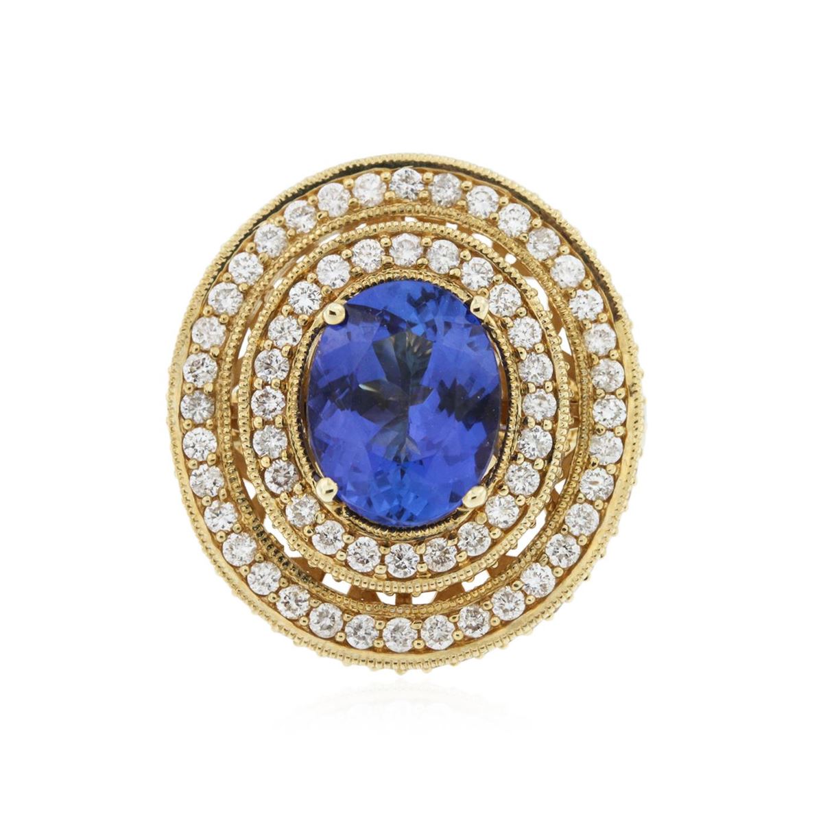 One electronically tested 14KT yellow gold Ladies combination cast & assembled ring with a bright polish finish. Condition is new. Identified with markings of "14K". Containing: One Hundred Eighty-Two prong set round brilliant cut diamonds, measuring 1.40 - 1.40 x 0.84mm (depth est.) approximate. Total Weight of 182 Stones = 2.03ct. Clarity: I-1 to I-2. Color: H - I, Cut is Good. One prong set oval modified brilliant cut natural tanzanite, measuring 10.90 x 8.10 x 5.27mm, exact weight 3.40ct., clarity is eye clean, type I, medium, moderately strong, bluish violet color, (GIA bV 5/4), cut is very good. Colored gemstones are presumed to have been subjected to commonly used and possible undetectable color/clarity enhancement processes. Total Weight of Colored Stones 3.40ct. Total Weight of Diamonds 2.03ct. Total Weight of Ring 9.90 grams. GGL Appraised at $10,995.00.