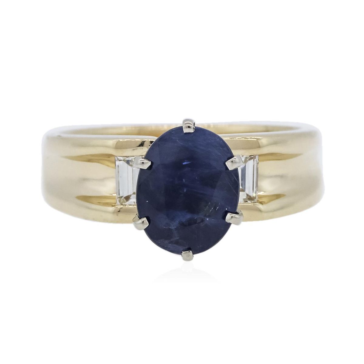 One ring featuring: 14KT yellow gold weighing 8.30 grams containing one sapphire center stone with a total weight of 3.41ct and baguette cut diamonds with a total weight of 0.17ct.