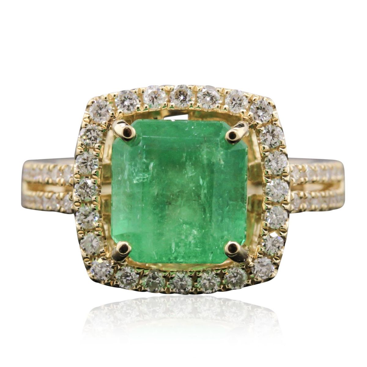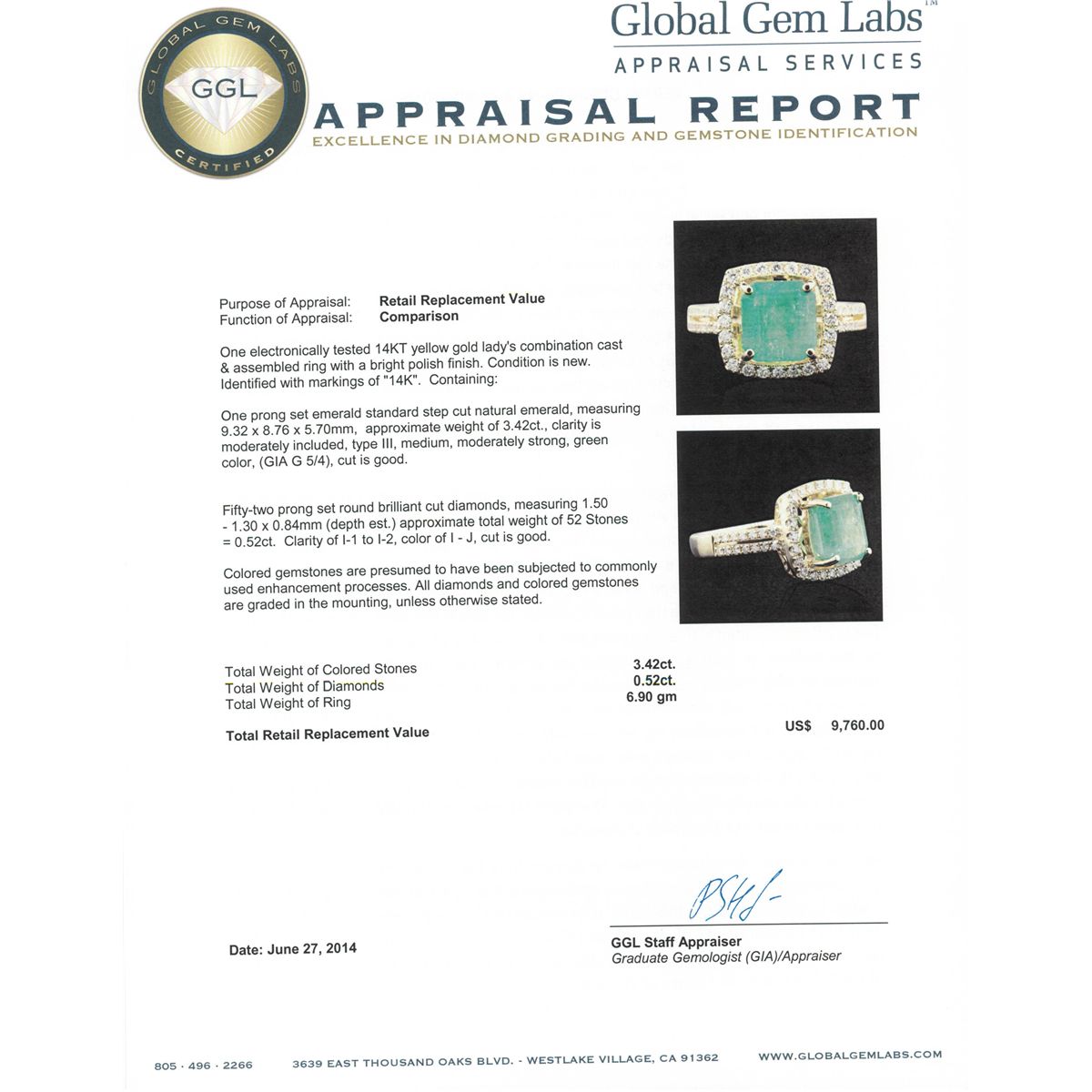 One electronically tested 14KT yellow gold Ladies combination cast & assembled ring with a bright polish finish. Condition is new. Identified with markings of "14K". Containing: One prong set emerald standard step cut natural emerald, measuring 9.32 x 8.76 x 5.70mm, approximate weight of 3.42ct., clarity is moderately included, type III, medium, moderately strong, green color, (GIA G 5/4), cut is good. Fifty-Two prong set round brilliant cut diamonds, measuring 1.50 - 1.30 x 0.84mm (depth est.) approximate total weight of 52 Stones = 0.52ct. Clarity: I-1 to I-2. Color: I - J, Cut is Good. Colored gemstones are presumed to have been subjected to commonly used enhancement processes. All diamonds and colored gemstones are graded in the mounting, unless otherwise stated. Total Weight of Colored Stones 3.42ct. Total Weight of Diamonds 0.52ct. Total Weight of Ring 6.90 grams. GGL Appraised at $9,760.00.