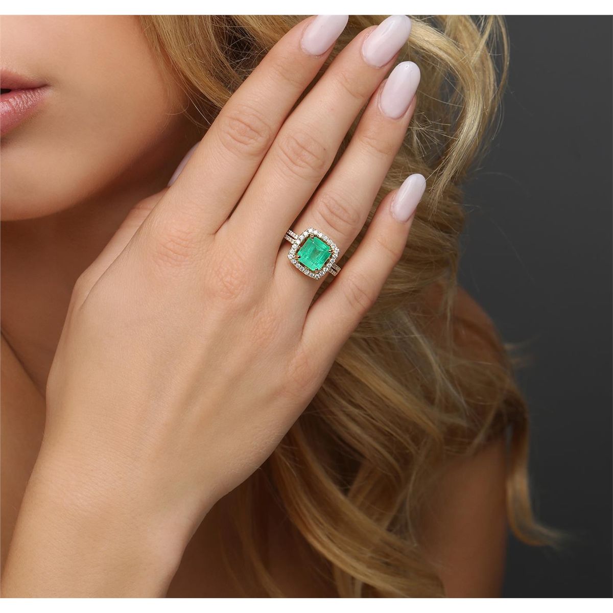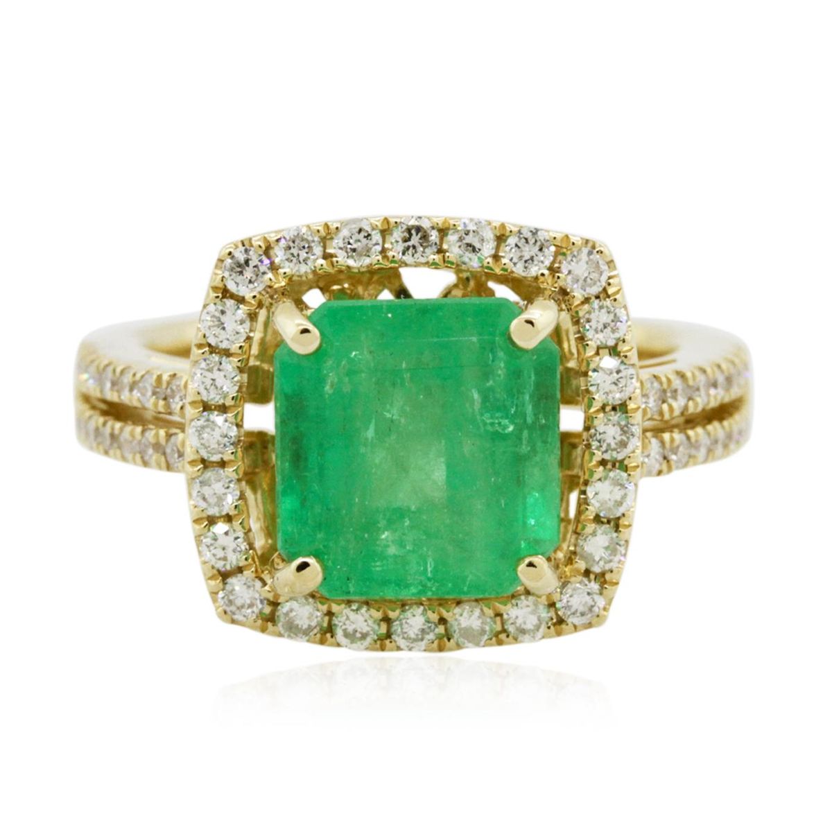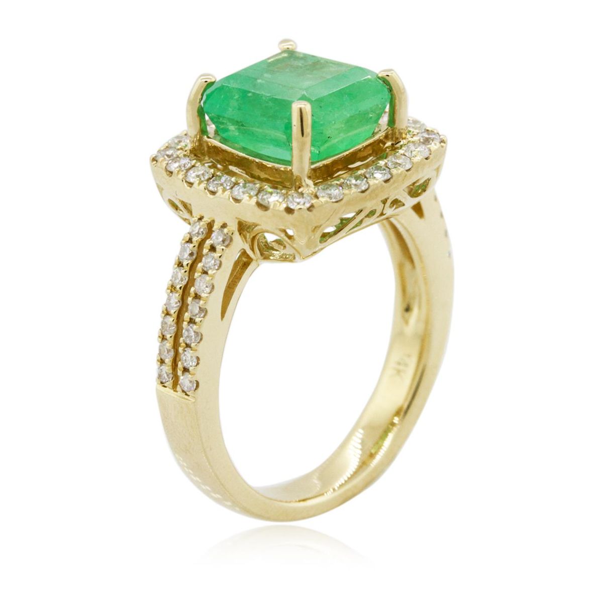 One electronically tested 14KT yellow gold Ladies combination cast & assembled ring with a bright polish finish. Condition is new. Identified with markings of "14K". Containing: One prong set emerald standard step cut natural emerald, measuring 9.32 x 8.76 x 5.70mm, approximate weight of 3.42ct., clarity is moderately included, type III, medium, moderately strong, green color, (GIA G 5/4), cut is good. Fifty-Two prong set round brilliant cut diamonds, measuring 1.50 - 1.30 x 0.84mm (depth est.) approximate total weight of 52 Stones = 0.52ct. Clarity: I-1 to I-2. Color: I - J, Cut is Good. Colored gemstones are presumed to have been subjected to commonly used enhancement processes. All diamonds and colored gemstones are graded in the mounting, unless otherwise stated. Total Weight of Colored Stones 3.42ct. Total Weight of Diamonds 0.52ct. Total Weight of Ring 6.90 grams. GGL Appraised at $9,760.00.