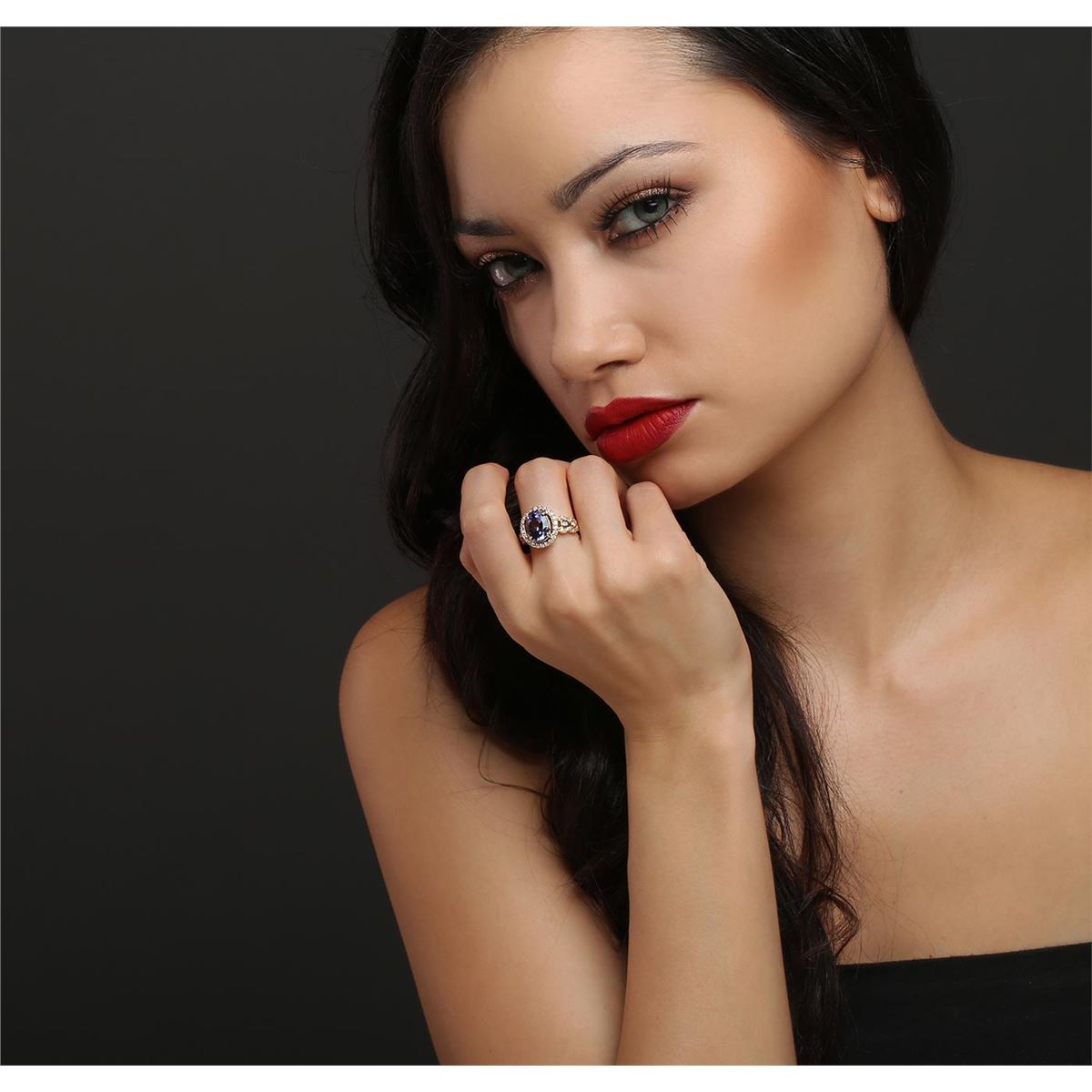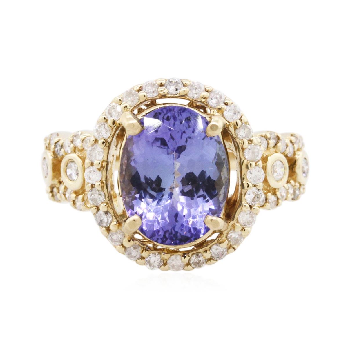 One electronically tested 14KT yellow gold ladies combination cast & assembled tanzanite and diamond ring with a split shank with a bright polish finish. Identified with markings of "14K". Condition is new. Containing: One prong set oval modified brilliant cut natural tanzanite, measuring 10.80 x 8.51 x 5.49mm, approximate weight of 3.43ct., clarity is eye clean, type I, medium, moderately strong, violet color, (GIA V 5/4), cut is good. Four bezel set round brilliant cut diamonds, measuring 1.40 - 1.40 x 0.84mm (depth est.) approximate total weight of 4 Stones = 0.04ct. Clarity: I-1 to I-2. Color: J - K, Cut is Good. Fifty-Two prong set round brilliant cut diamonds, measuring 1.10 - 1.10 x 0.66mm (depth est.) approximate total weight of 52 Stones = 0.25ct. Clarity: I-1 to I-2. Color: J - K, Cut is Good. Colored gemstones are presumed to have been subjected to commonly used enhancement processes. All diamonds and colored gemstones are graded in the mounting, unless otherwise stated. Total Weight of Colored Stones 3.43ct. Total Weight of Diamonds 0.29ct. Total Weight of Ring 5.80 grams. GGL Appraised at $7,305.00.