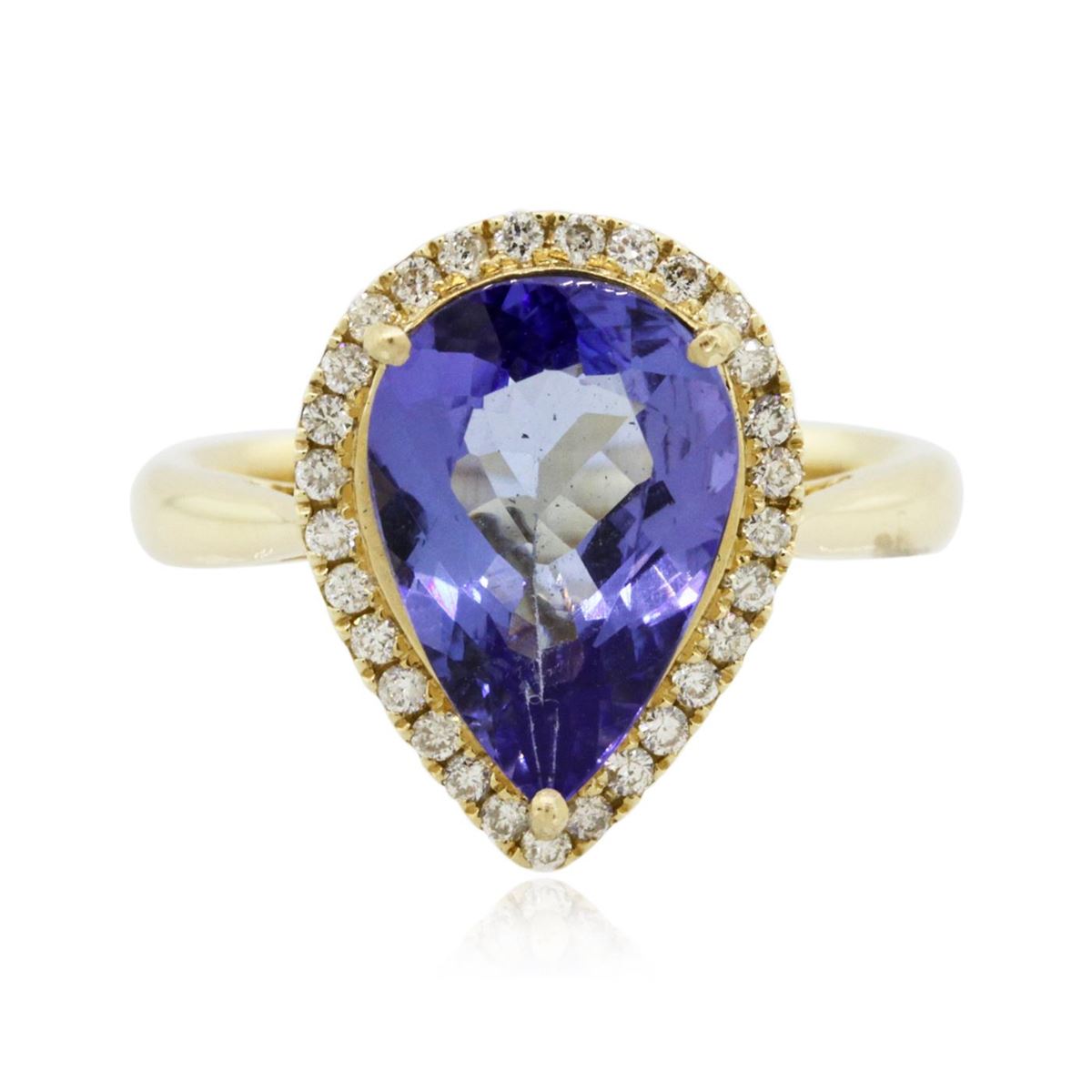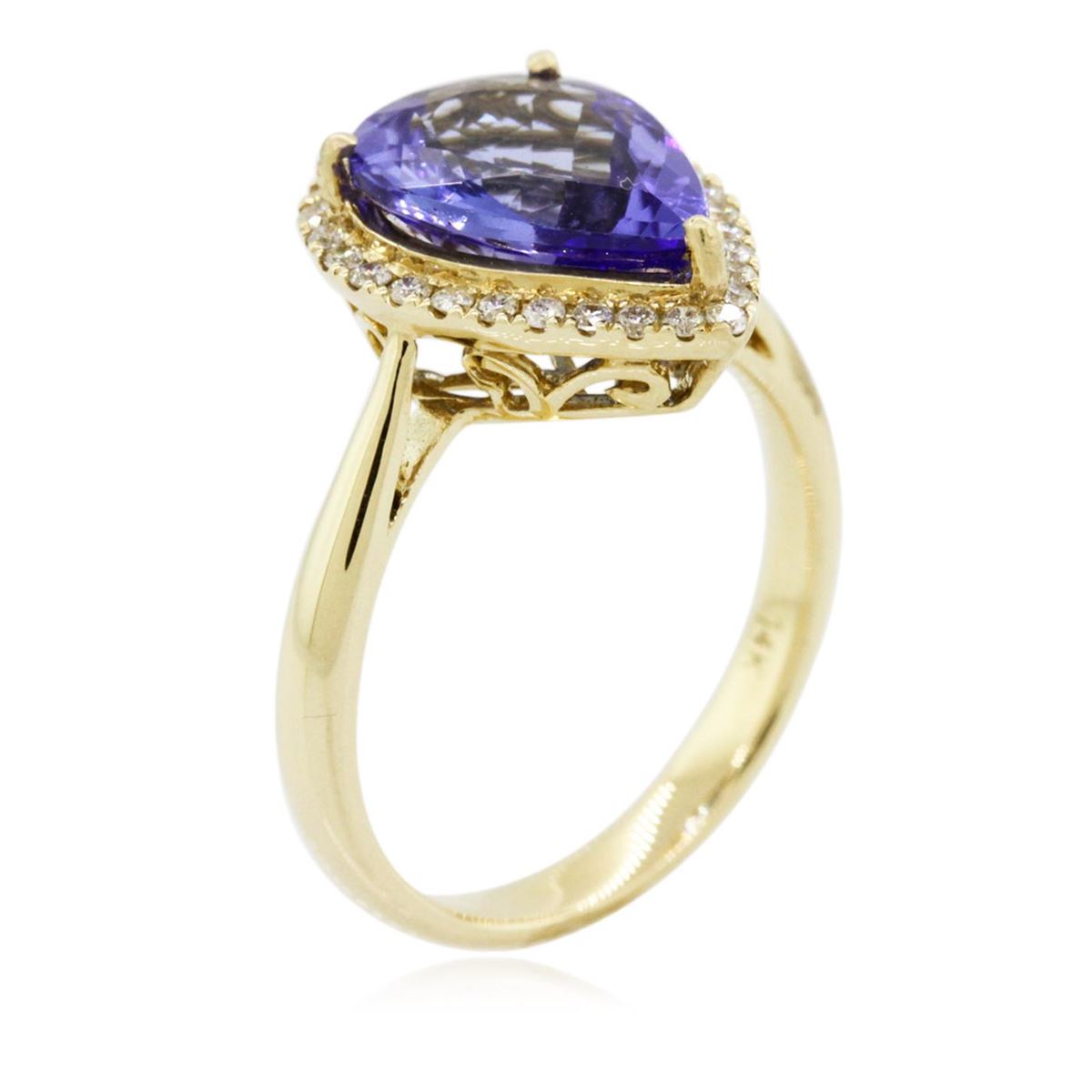One electronically tested 14KT yellow gold Ladies combination cast & assembled ring with a bright polish finish. Condition is new. Identified with markings of "14K". Containing: One prong set pear modified brilliant cut natural tanzanite, measuring 13.00. x 8.80 x 4.47mm, approximate weight of 3.43ct., clarity is eye clean, type I, medium light, very slightly grayish, violet color, (GIA V 4/3), cut is good. Colored gemstones are presumed to have been subjected to commonly used color/clarity enhancement processes. Twenty-Nine prong set round brilliant cut diamonds, measuring 1.10 - 1.10 x 0.66mm (depth est.) approximate. Total Weight of 29 Stones = 0.14ct. . Clarity: I-1 to I-2. Color: I - J, Cut is Good. . Total Weight of Colored Stones 3.43ct. Total Weight of Diamonds 0.14ct. Total Weight of Ring 4.40 grams. GGL Appraised at $6,415.00.