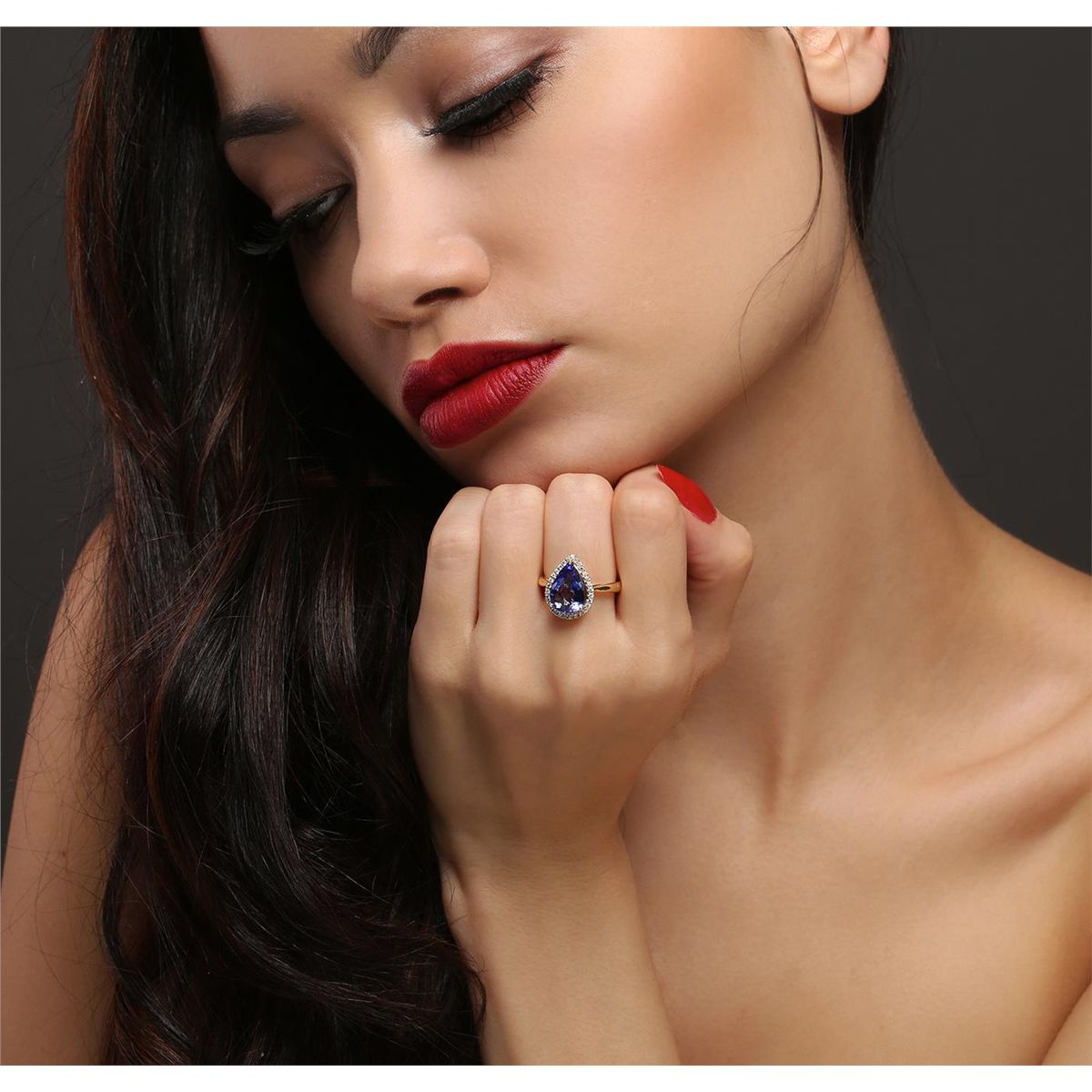 One electronically tested 14KT yellow gold Ladies combination cast & assembled ring with a bright polish finish. Condition is new. Identified with markings of "14K". Containing: One prong set pear modified brilliant cut natural tanzanite, measuring 13.00. x 8.80 x 4.47mm, approximate weight of 3.43ct., clarity is eye clean, type I, medium light, very slightly grayish, violet color, (GIA V 4/3), cut is good. Colored gemstones are presumed to have been subjected to commonly used color/clarity enhancement processes. Twenty-Nine prong set round brilliant cut diamonds, measuring 1.10 - 1.10 x 0.66mm (depth est.) approximate. Total Weight of 29 Stones = 0.14ct. . Clarity: I-1 to I-2. Color: I - J, Cut is Good. . Total Weight of Colored Stones 3.43ct. Total Weight of Diamonds 0.14ct. Total Weight of Ring 4.40 grams. GGL Appraised at $6,415.00.