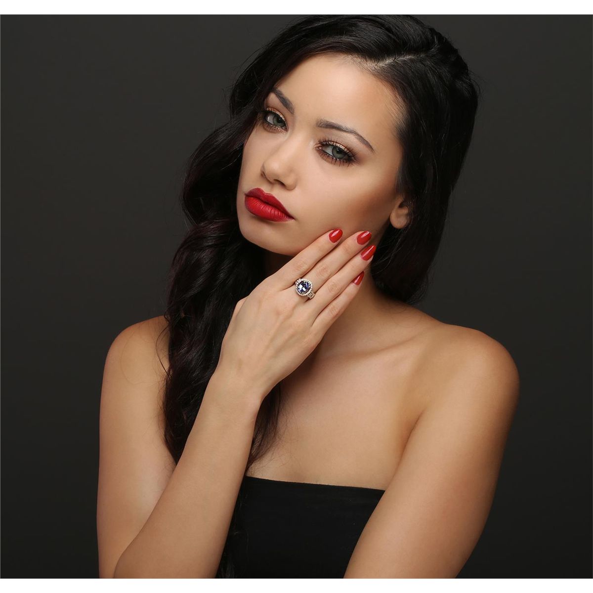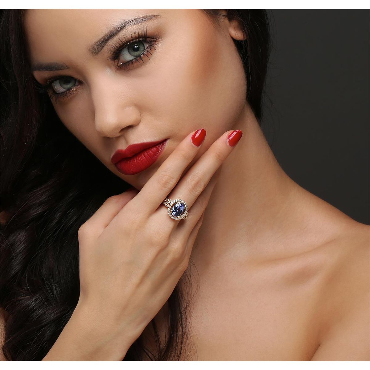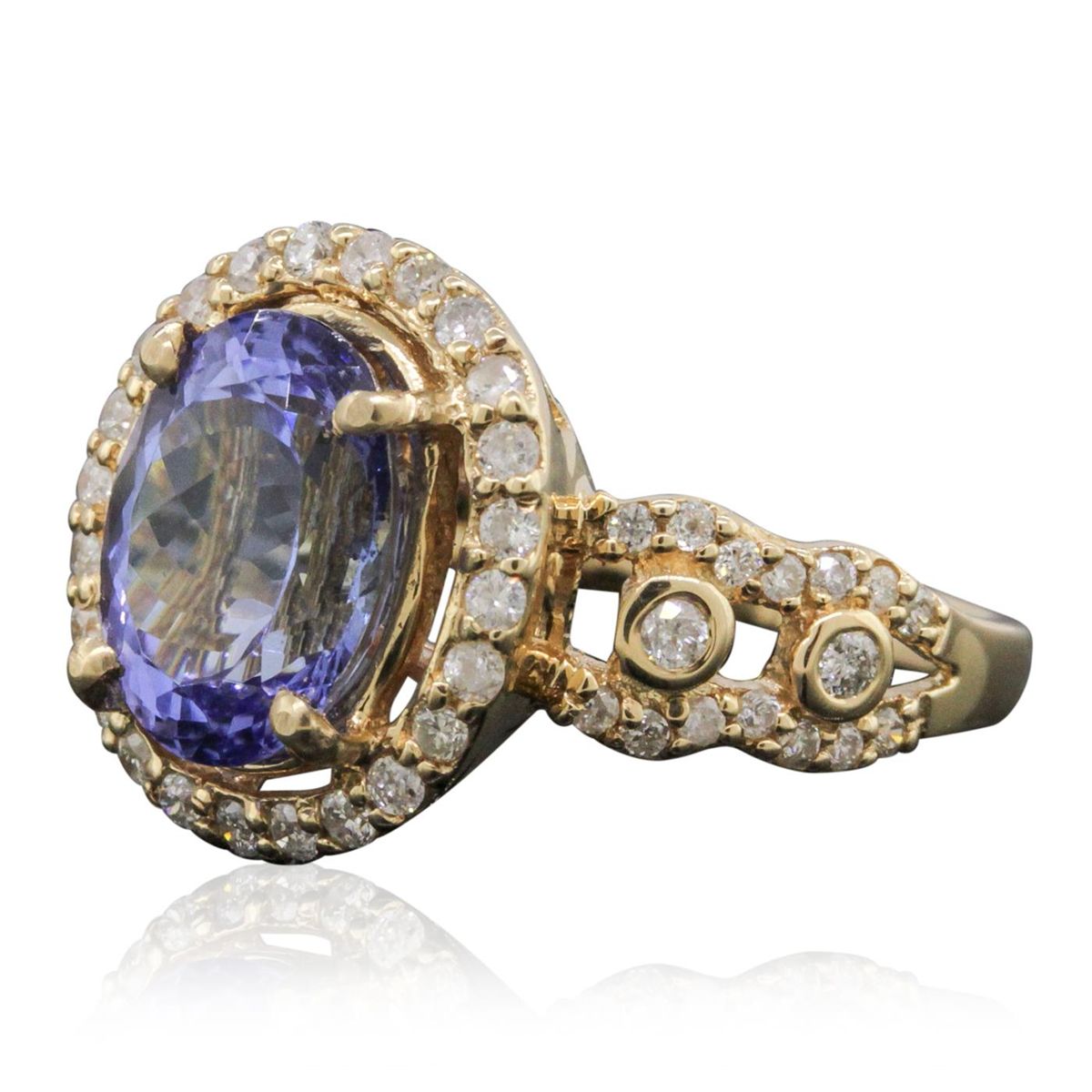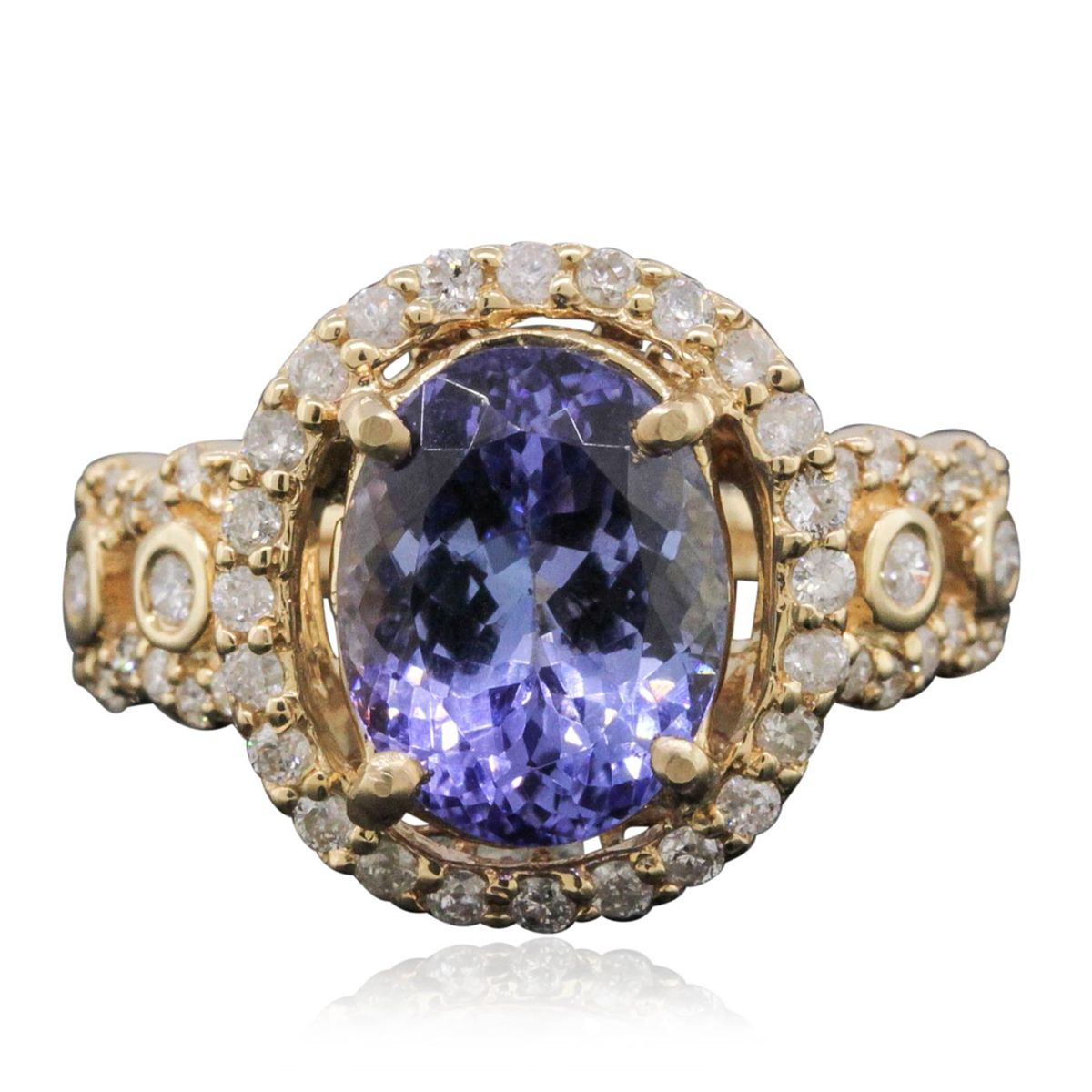 One electronically tested 14KT yellow gold ladies combination cast & assembled tanzanite and diamond ring with a split shank with a bright polish finish. Identified with markings of "14K". Condition is new. Containing: One prong set oval modified brilliant cut natural tanzanite, measuring 10.80 x 8.51 x 5.49mm, approximate weight of 3.43ct., clarity is eye clean, type I, medium, moderately strong, violet color, (GIA V 5/4), cut is good. Four bezel set round brilliant cut diamonds, measuring 1.40 - 1.40 x 0.84mm (depth est.) approximate total weight of 4 Stones = 0.04ct. Clarity: I-1 to I-2. Color: J - K, Cut is Good. Fifty-Two prong set round brilliant cut diamonds, measuring 1.10 - 1.10 x 0.66mm (depth est.) approximate total weight of 52 Stones = 0.25ct. Clarity: I-1 to I-2. Color: J - K, Cut is Good. Colored gemstones are presumed to have been subjected to commonly used enhancement processes. All diamonds and colored gemstones are graded in the mounting, unless otherwise stated. Total Weight of Colored Stones 3.43ct. Total Weight of Diamonds 0.29ct. Total Weight of Ring 5.80 grams. GGL Appraised at $7,305.00.